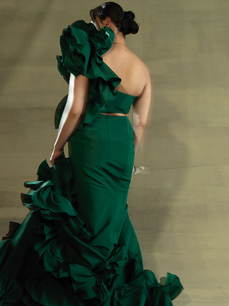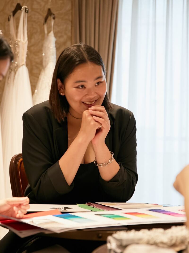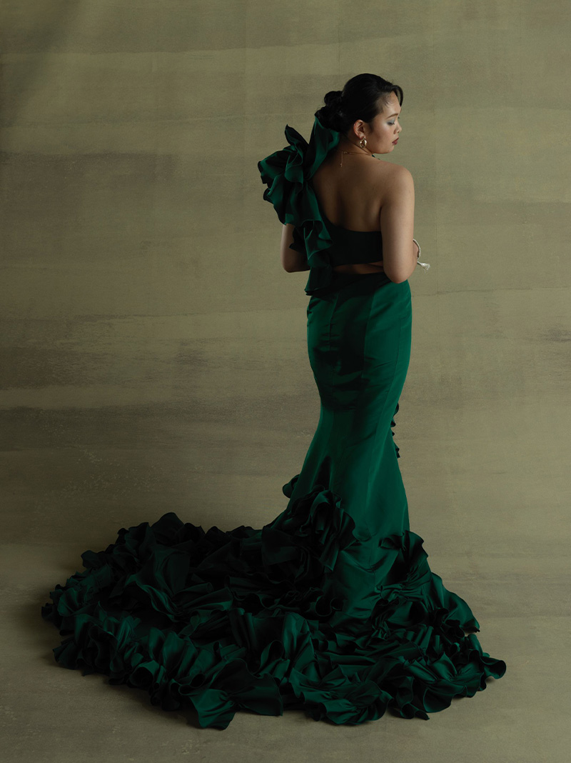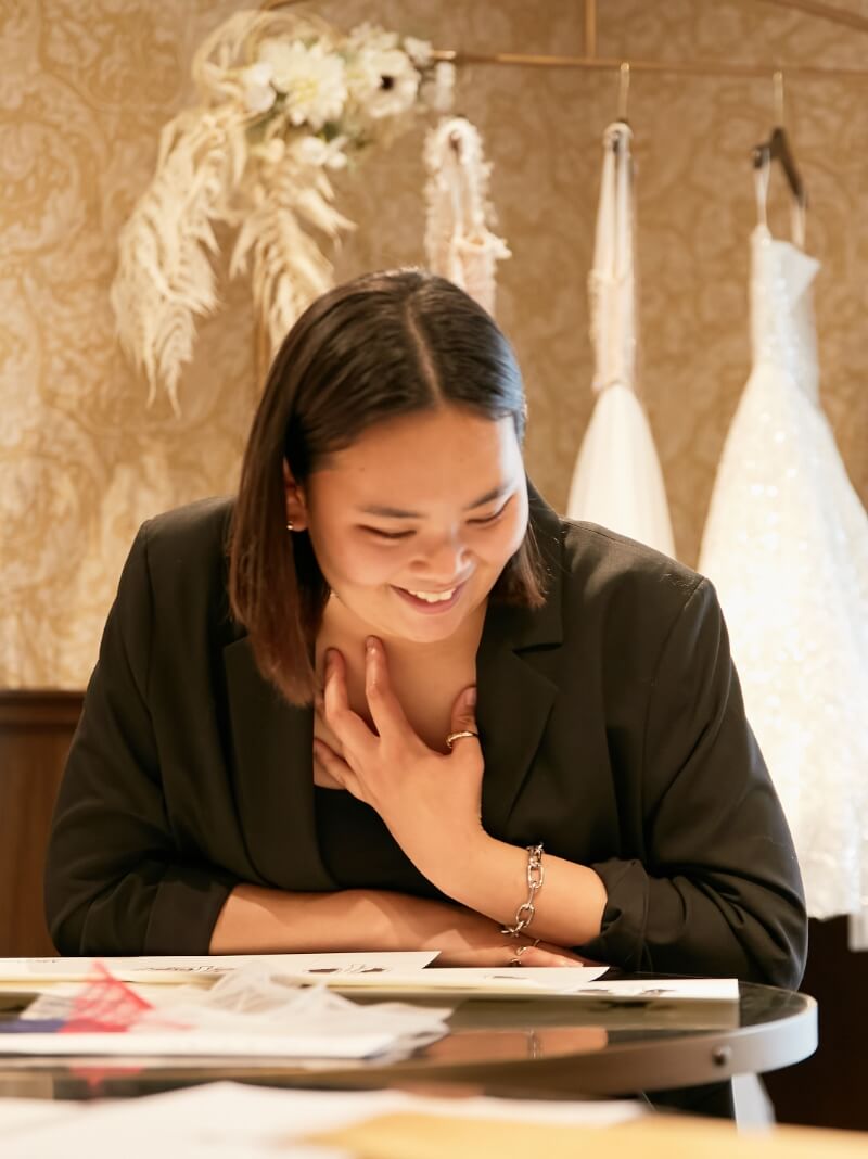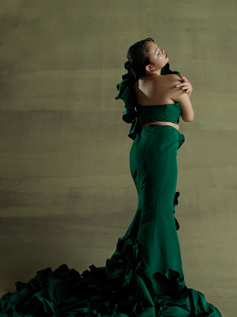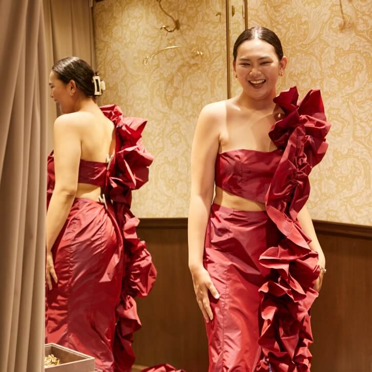 最初はウエディングドレス!と思っていたけれど、実際ドレスを見てみるとゴージャスな雰囲気や色彩に、カラードレスに惹かれています。上半身はショルダーのボリュームを出してバランスを取りたいです。二の腕や太ももの個性を、美しく見せるようなドレスがいいな。背中は開けて、スカートのスリットはマストで欲しい!マーメイドラインでヒップのシルエットをきれいに出して…。デザインでは、自分の意思を大切にしたいですね。着る人が何を伝えたいか、という部分を。