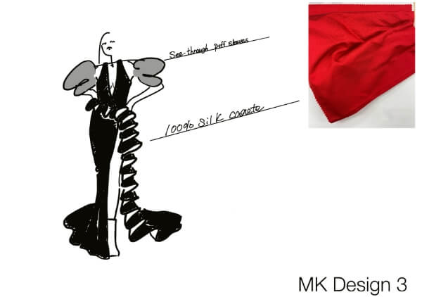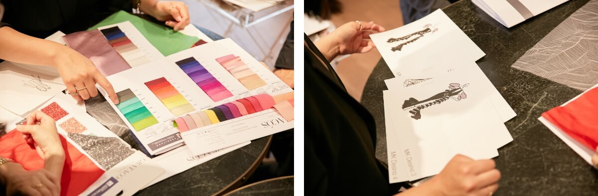 というアイディアが出ました。ここから、デザイン画・生地の提案へと進みます。