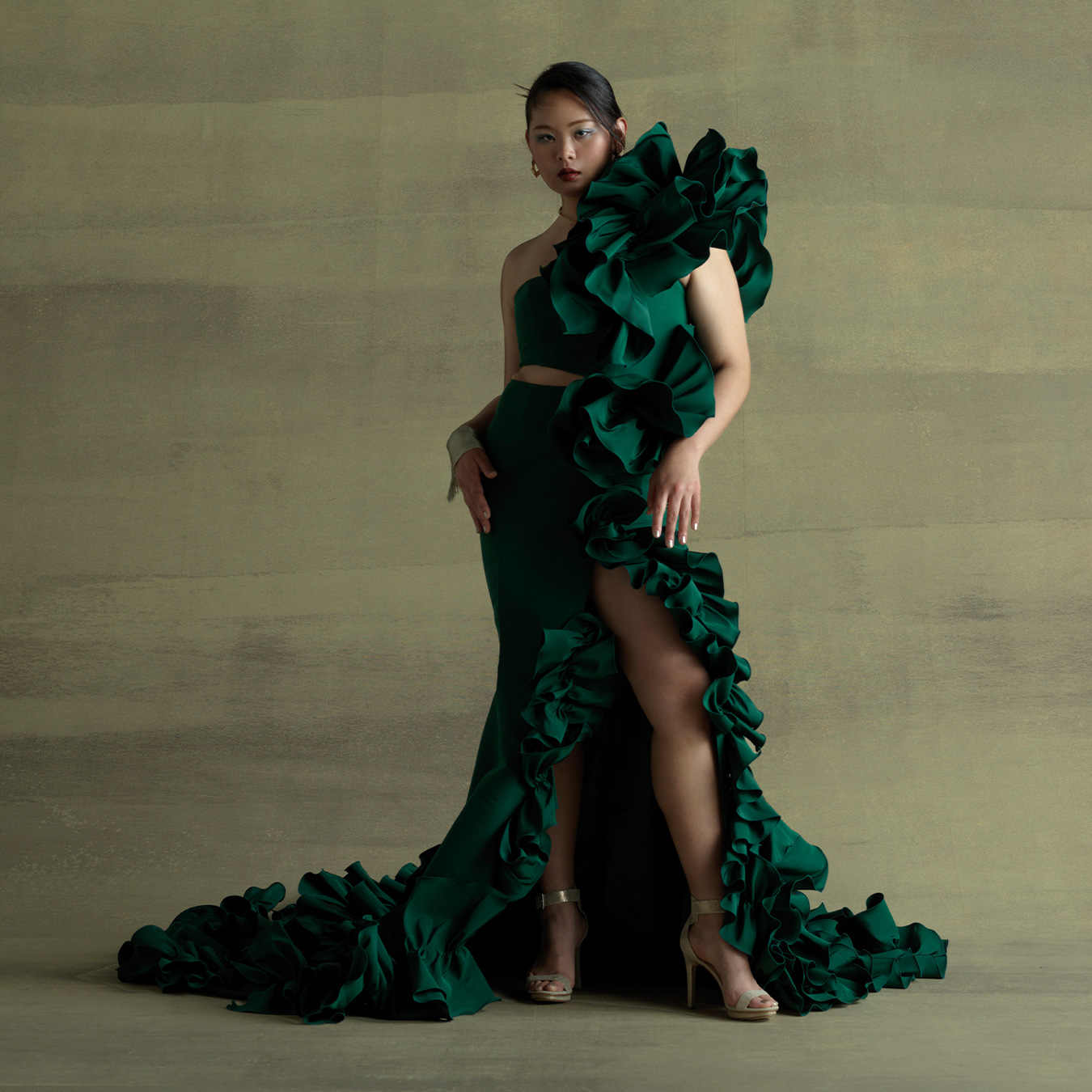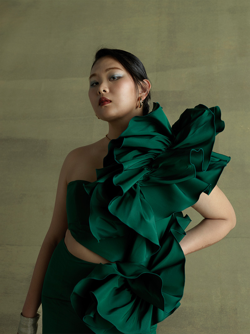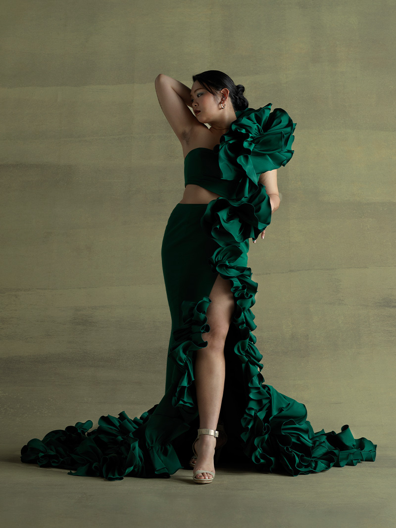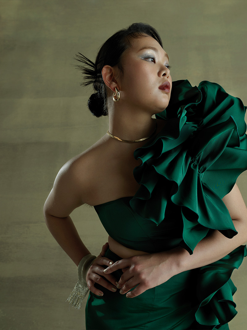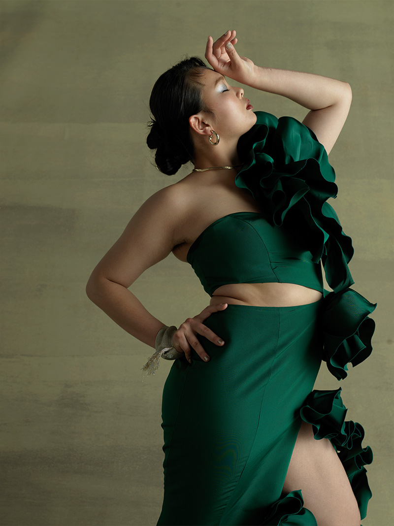 (お腹や足を)普通は隠してしまえって思うんだけど そこをあえて出すっていうことが、自分を愛して受け入れる一歩。そういう思いを大切にしたくて、このドレスを作りました。 大きいサイズのモデルってそこまで多くないけどこれが私らしさでもあり、私の武器。誰に批判されても貫き通したい、かけがえのない武器だなってすごく思いますね。痩せたくなったら痩せたらいいし、 自分の身体の変化もまるごと受け入れてあげられたらなと思っています。