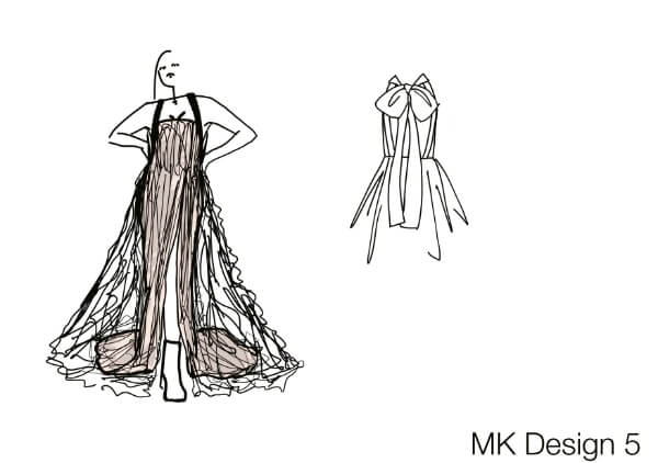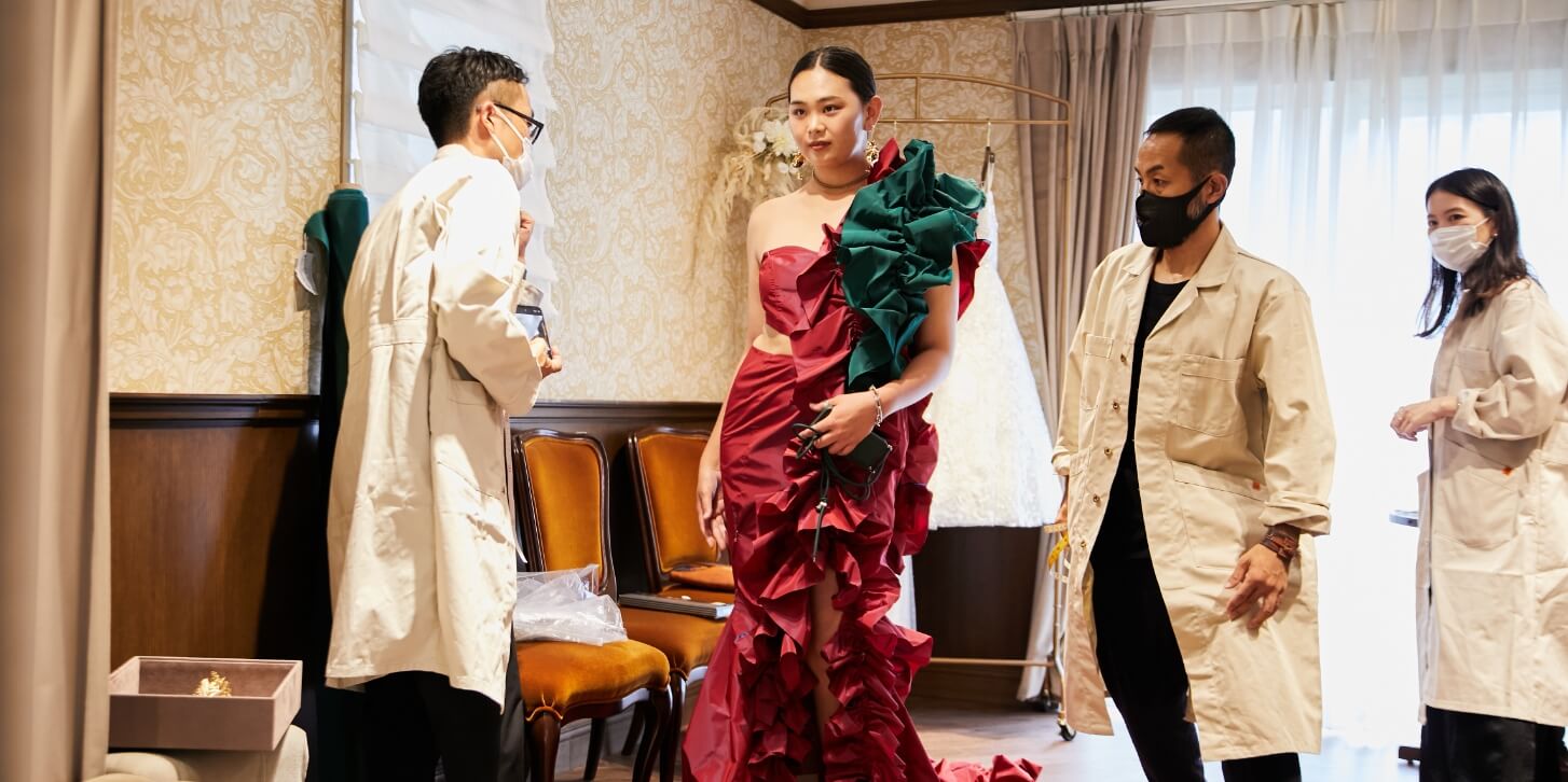 • フリルの端にビーディングを追加するのはどうか?など、ご提案しながらデザインを修正していきます。今回の企画にはパタンナーも参加。サイズを測り、それに合わせてドレスを作成していきます。