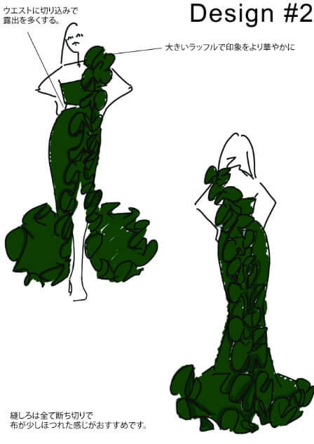 やっぱり自分の好きなパーツである、ウエストやバストを見せたい!肌見せが好きです。ネックライン、背中、足も大胆に見せたいですね。カラーは、マリリン・モンローのようなシルバーゴールド系や、鮮やかなグリーンやピンク・パープルがイメージです。