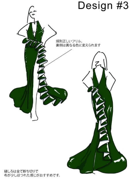 その後、色々と話しながら、たくさんのパターンを想像して最終的に、デザイン4をベースに進めていくことに決定しました。生地は24番のビビッドなグリーンに!マーメイドのシルエットで、北原様の魅力であるバスト、ウエストラインを際立たせて大きく開けたスリットで肌見せも。北原様だからこそ叶う、かっこいい着こなしを想像させるデザインに期待とワクワクしたムードに溢れていました。