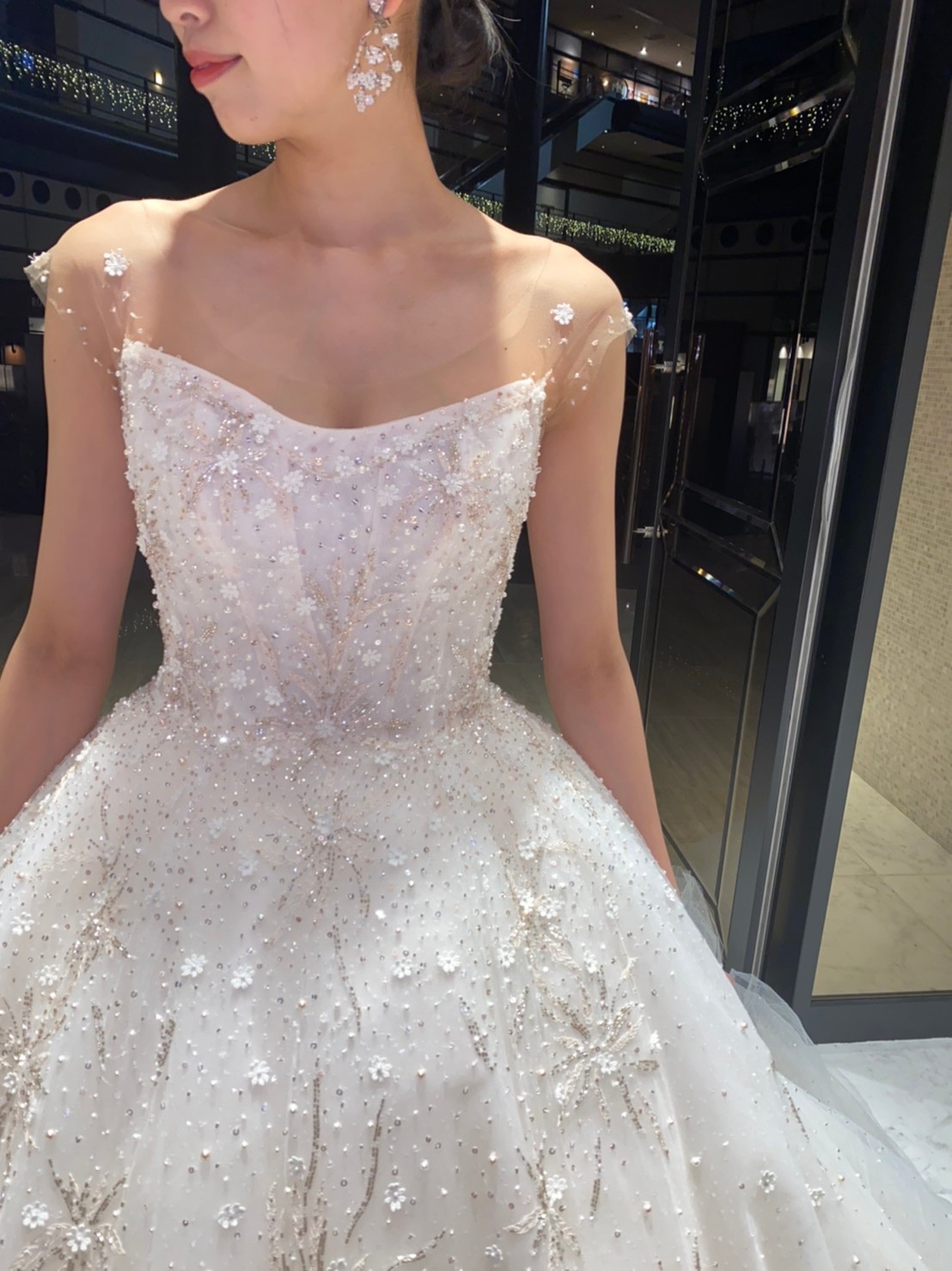 お近くでご覧頂くと、3Dフラワーの細やかなモチーフ、パール、そしてビーディングとスパンコール。贅沢にも乙女心をくすぐる要素がぎゅっと詰まった一着です。