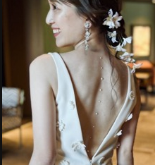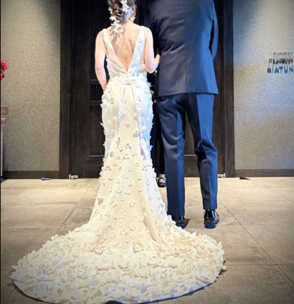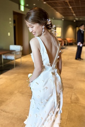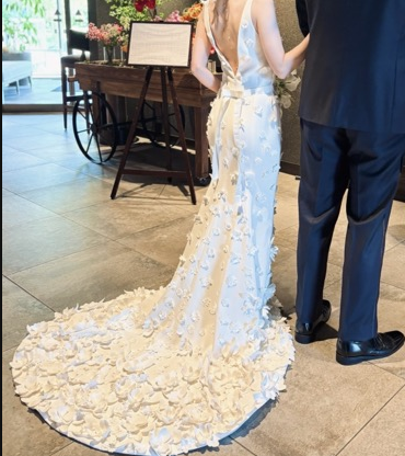 実際にお客様よりこちらのドレスをご案内した際に他にはない甘さとマットな生地を使用している為大人っぽいデザインをとても気に入ってくださり、式結んだ後に「このドレスにしてよかった、運命の一着になった」とお声をいただいたドレスでございます。