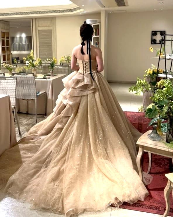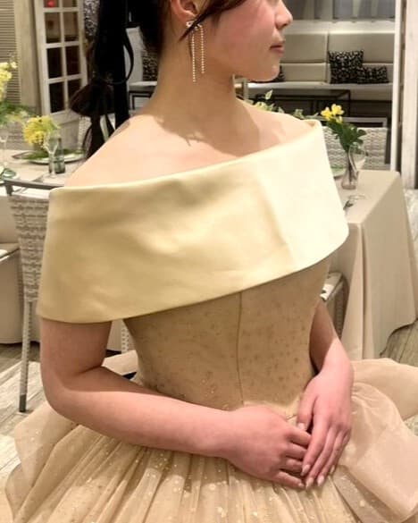 スカートのゴールドのオリジナルグリッターチュールは柔らかく繊細な輝きを放ち、ご新婦様をより一層美しく輝かせます。