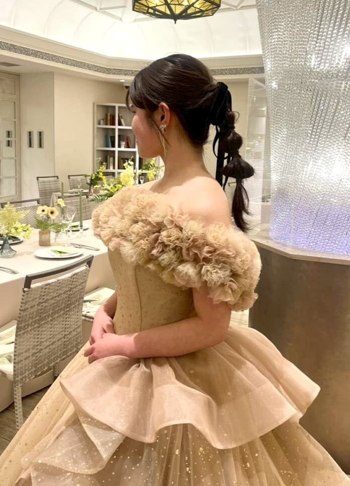 また、こちらでも取り外し可能なラッフルパーツをスカート部分に付けていただくことでボリュームが生まれ、更に華やかさが引き立ちます。