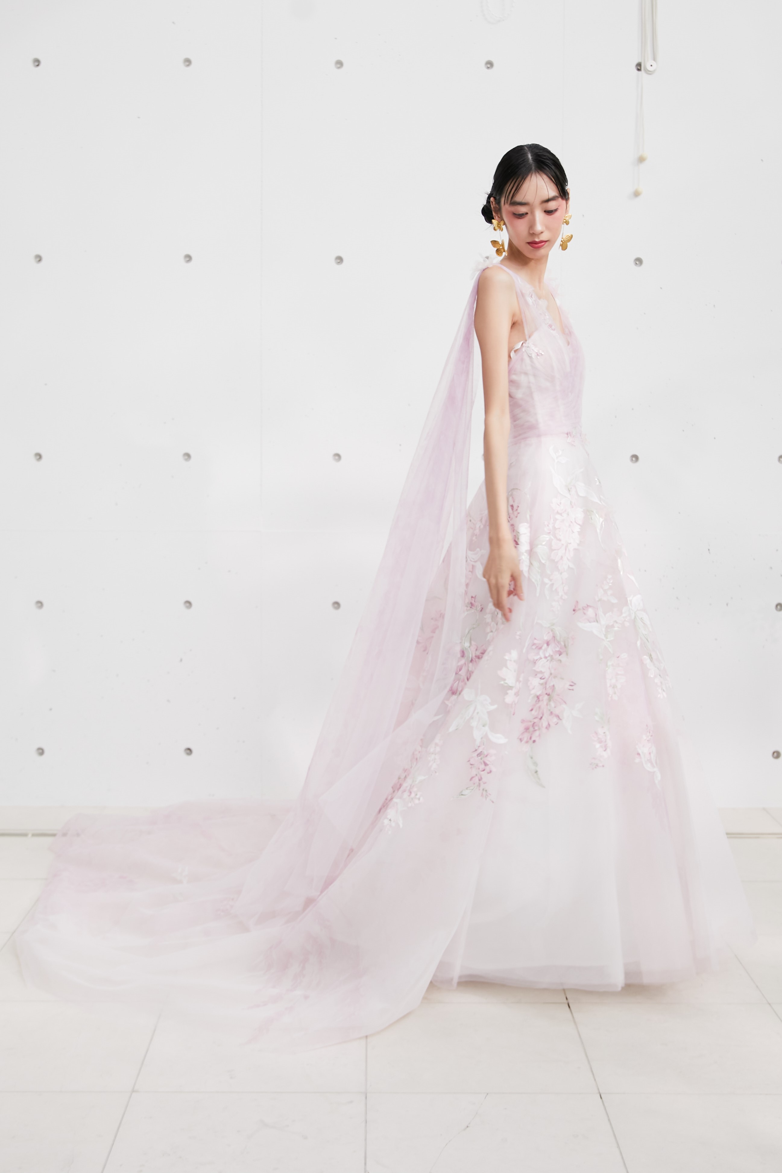淡く 繊細な藤の花のデザインとカラーは ひと目見た瞬間、心奪われてしまうほどの美しさ。 藤の花はハンドペイントで描かれています。 描く職人の デザイン・色の 研ぎ澄まされた感覚から 生み出されるハンドペイントは、まさにアート。 どこでも見たことのない 淡いライラックカラーは ドレス自体に まだら模様にプリントされたフラワーモチーフ、 ペイント、更にそこにあしらわれた3Dフラワーと 異なるファブリックとデザインの 色味と質感を重ねて生み出されます。 ショルダーから流れるトレーンがドラマを生み、 唯一無二のエレガンスを纏うドレスです。
