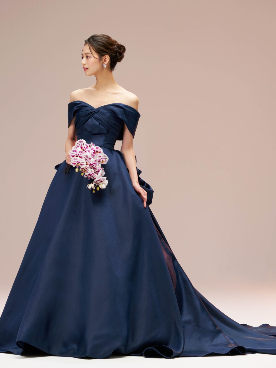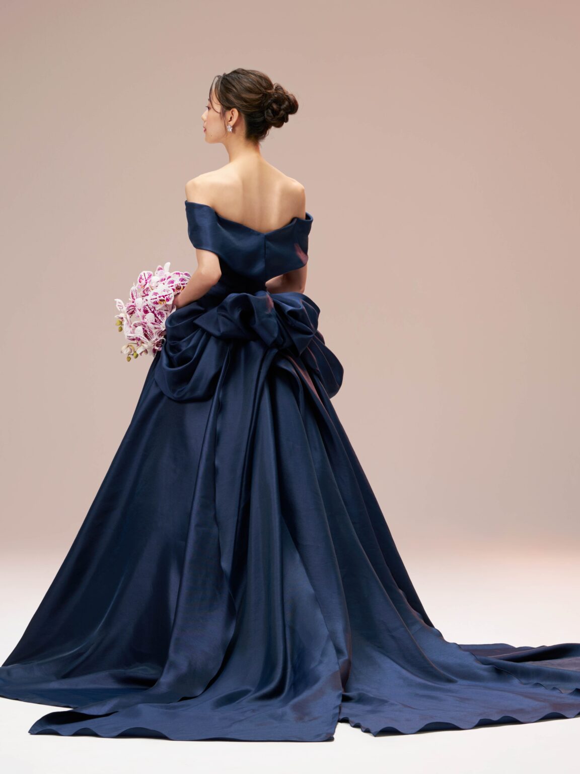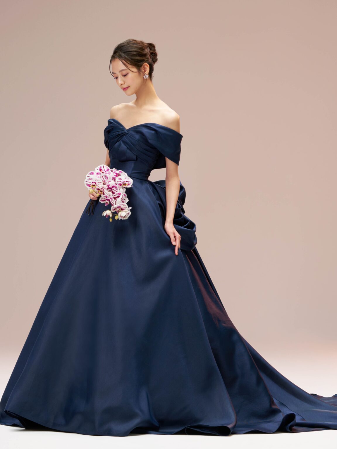 花嫁さまの透明感を引き立たせ、お肌を美しくみせるネイビーのオフショルダードレス。 ミカドサテンならではの艶や、ふわりと立体感のあるバックリボンが、シックかつクラシカルな印象に上品な華やかさを加えます。 フロントからバックにかけ、なだらかに幅を広げ、二の腕をカバーするオフショルダーや、デコルテを美しく見せながら、安心感もある絶妙な開きのトップスデザインなど、細部までこだわり抜いたオリジナルドレスです。 ※CLAIREにはイエローのカラードレス、またウェディングドレスもございます。