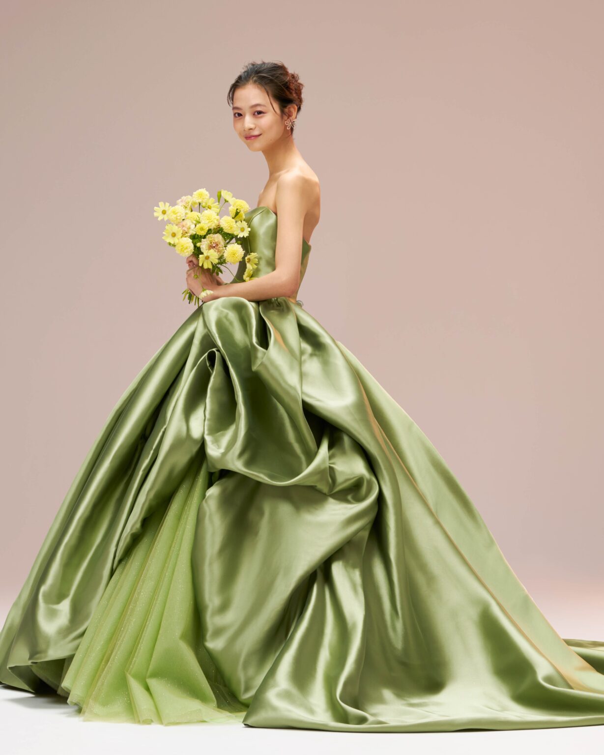 esum 1st Collectionのテーマカラーの一つである“Opaline Green(オパライン グリーン)”の艷やかなサテンドレス。 シンプルなストレートラインが美しいビスチェと、何度も調整して仕上げた丸みを帯びたバルーンスカートのデザインのコントラストは、それぞれの美しさを引き立てています。 内側のグリッターチュールは、馴染みすぎず浮きすぎないよう絶妙なゴールドカラーをセレクトしました。
