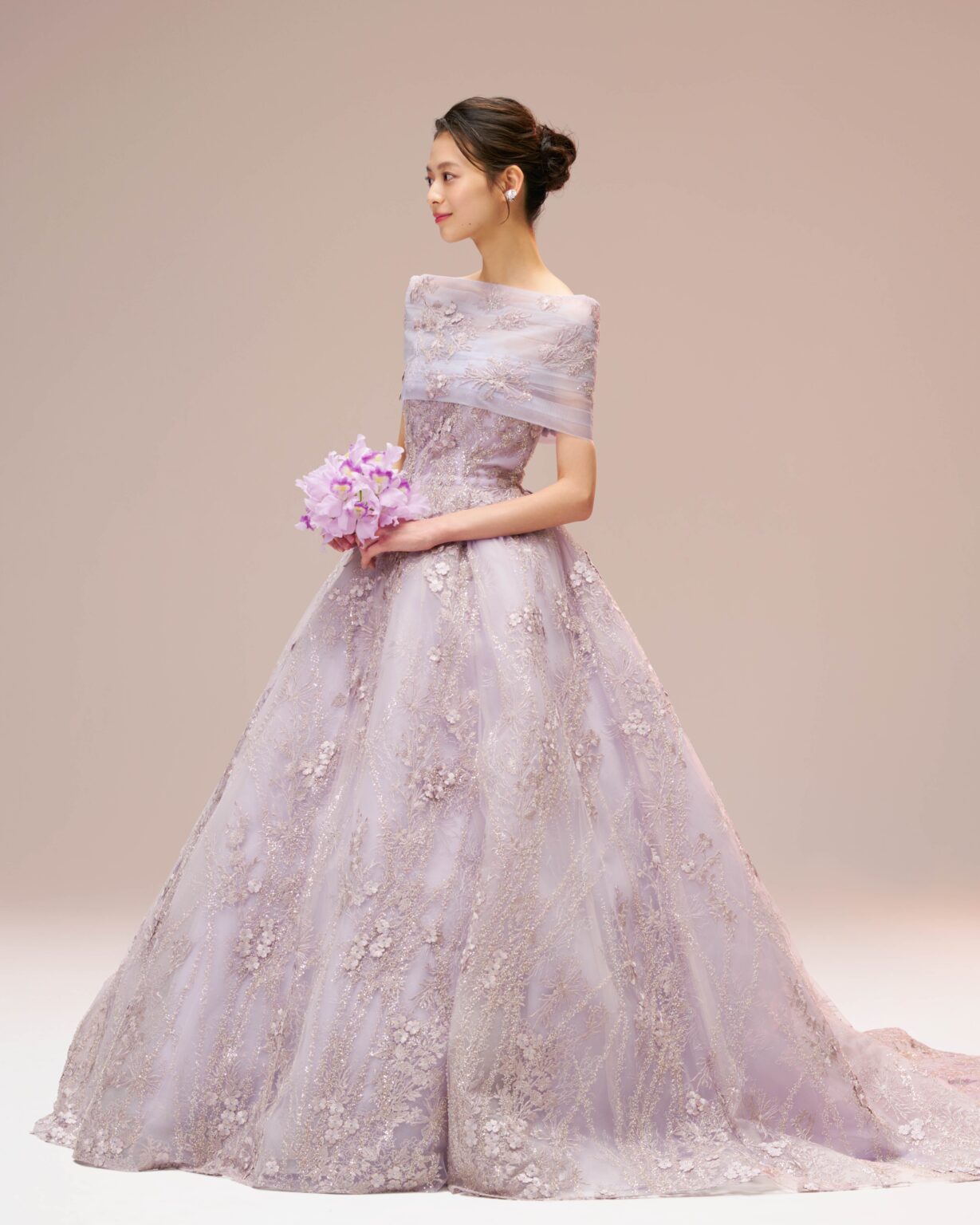 esum 1st CollectionのテーマであるDreamy/Radiance/Pastel colorを存分に感じられる主役感たっぷりのラベンダーカラードレス。 色味の異なる2色のオーガンジー、さらにベージュのチュール、ラベンダーのフラワーレースを重ね、繊細に輝くビーディングを施したことで、お肌なじみもよく、上品な華やかさが叶う1着に仕上がりました。 取り外し可能な幅広のラップショルダーは、花嫁様の気になる腕周りもカバーしながら、メインテーブルに掛けたシーンでもお顔まわりを華やかに彩ります。