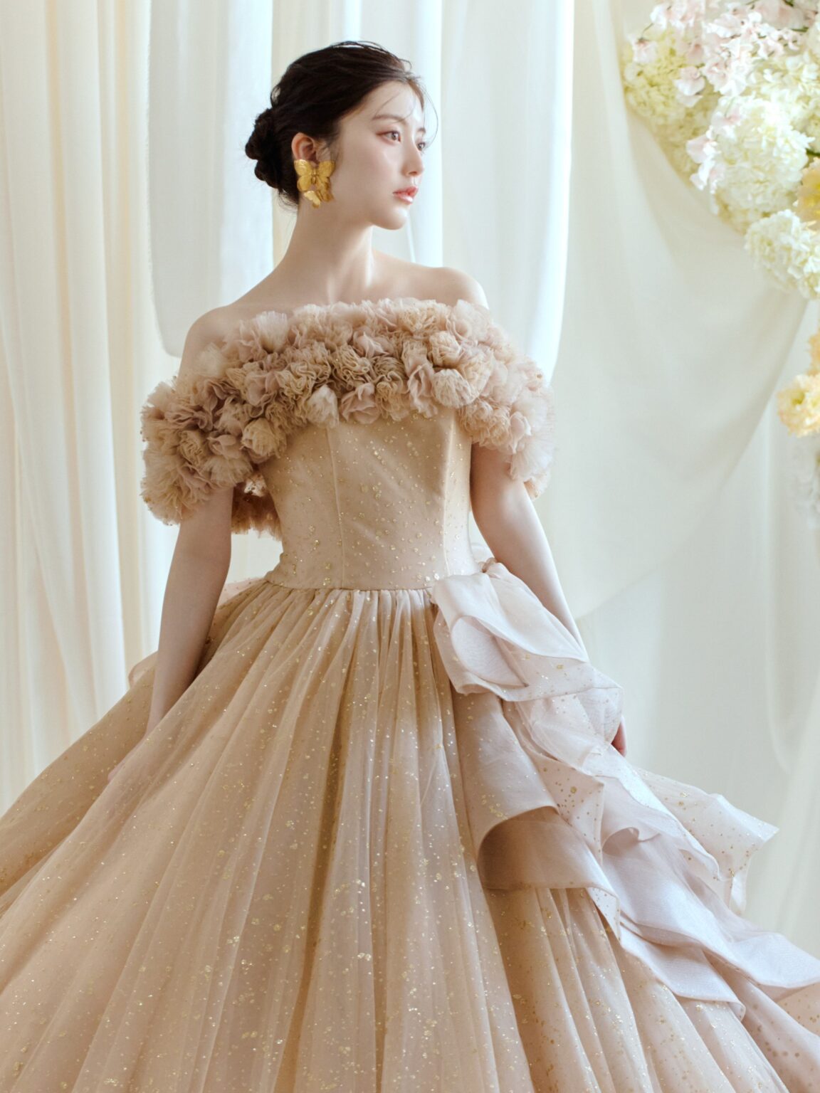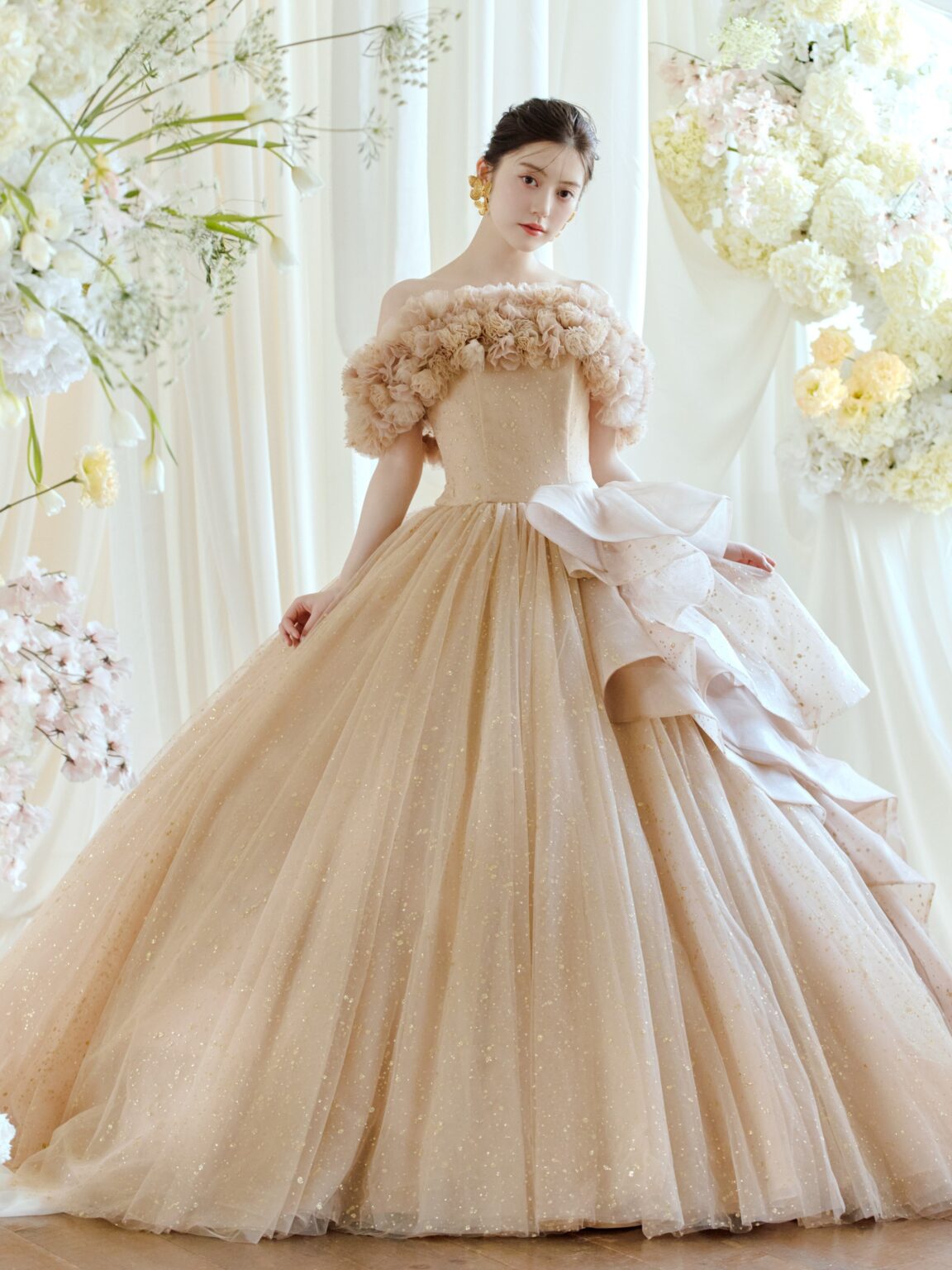 サテンのロールカラーが放つ上品で凛とした佇まいと、華やかな3Dフラワー・オフショルダー、2種類のショルダーデザインを楽しめる贅沢な一着。 纏う人の希望に合わせて表情を変えられる、マルチWAY仕様のドレスです。 サテンのロールカラーは花嫁のネックラインに合わせて美しくフィットさせることができます。 スカートには、華やかさと輝きのバランスにこだわって仕上げたゴールドのオリジナルグリッターチュールを使用。 光の表情にこだわり、グリッターの粒のサイズから決め、さらに何度も煌めきのバランスを調整しました。 取り外し可能なラッフルパーツも同様に仕上げており、スカート部分のホースヘアがドラマティックな立体感と動きを演出します。 ご希望のテイストに合わせてご自身らしいコーディネートをお楽しみください。