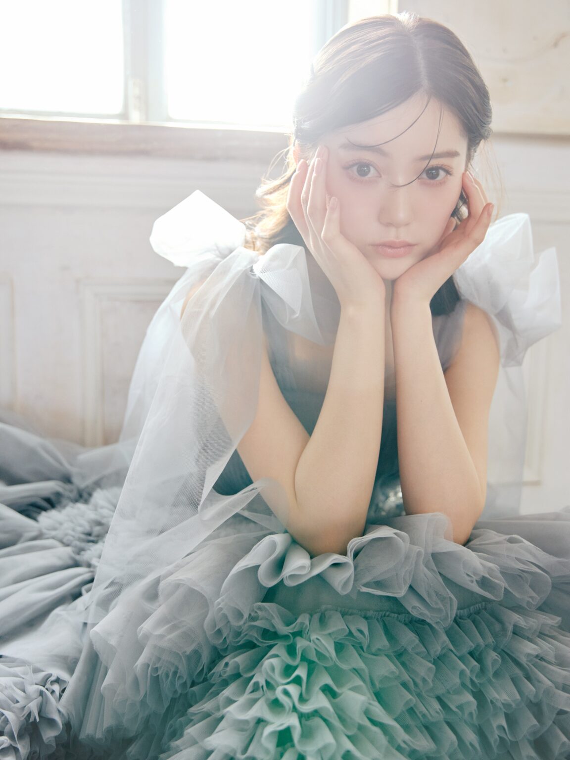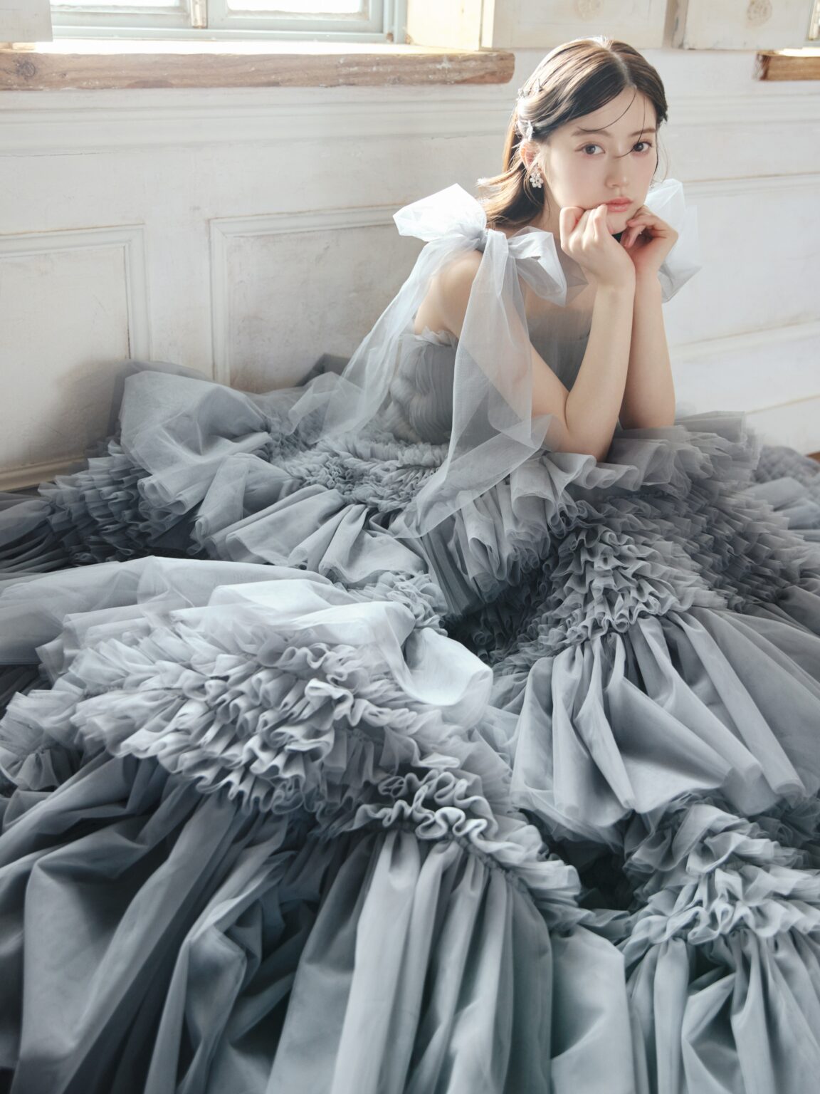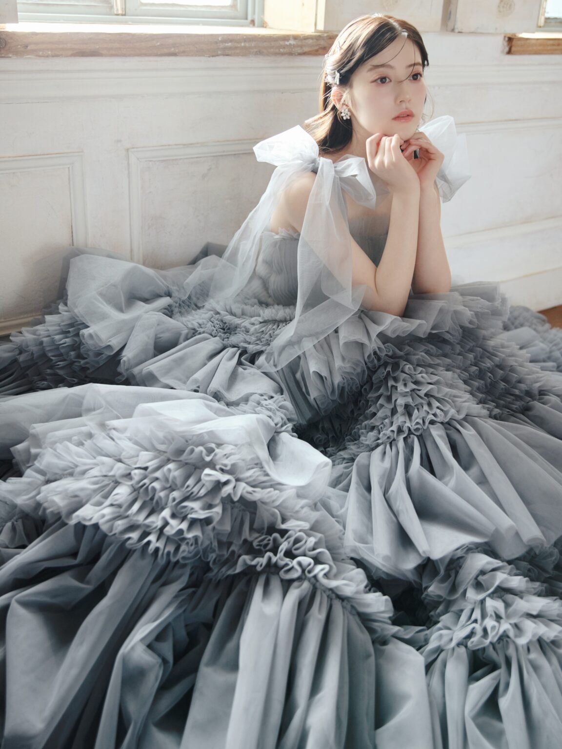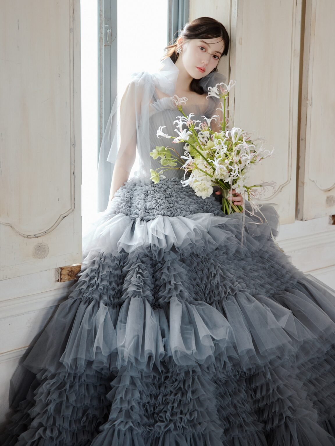 光と空気、そして人々の日常を優しく描いた印象派画家ルノワール。 その人生と創作を最も近くで支えた妻 Aline の名を冠したドレスです。 繊細なチュールを幾重にも重ねた、ドラマティックなダブグレーのガウン。 身頃は細やかなプリーツで仕立て、透明感のあるチュールを活かした手結びのリボンスリーブがトレンド感と軽やかな表情を添えます。 これまでにない新鮮さとしてネックスカーフも付属し、ショルダーとの合わせ使いはもちろん、お好みやなりたいイメージに合わせて、自由にスタイリングを楽しんでいただけます。 スリーブはディタッチャブルで肩の位置を落としてオフショルダーとしての着用も可能。 スカートには大小さまざまなラッフルを段階的に重ね、奥行きのある陰影と立体感を表現しました。 動くたびに異なる揺れ方を見せ、まるで絵画の中の光が移ろうような印象を残します。 ビーディングも一から制作し、色味まで丁寧に染め上げたオリジナル。 ウエストラインが美しく引き立つよう配置され、全体を凛と引き締めるアクセントに。 印象派の優しい光に満ちた世界観を、現代の花嫁のために描き直した一着です。