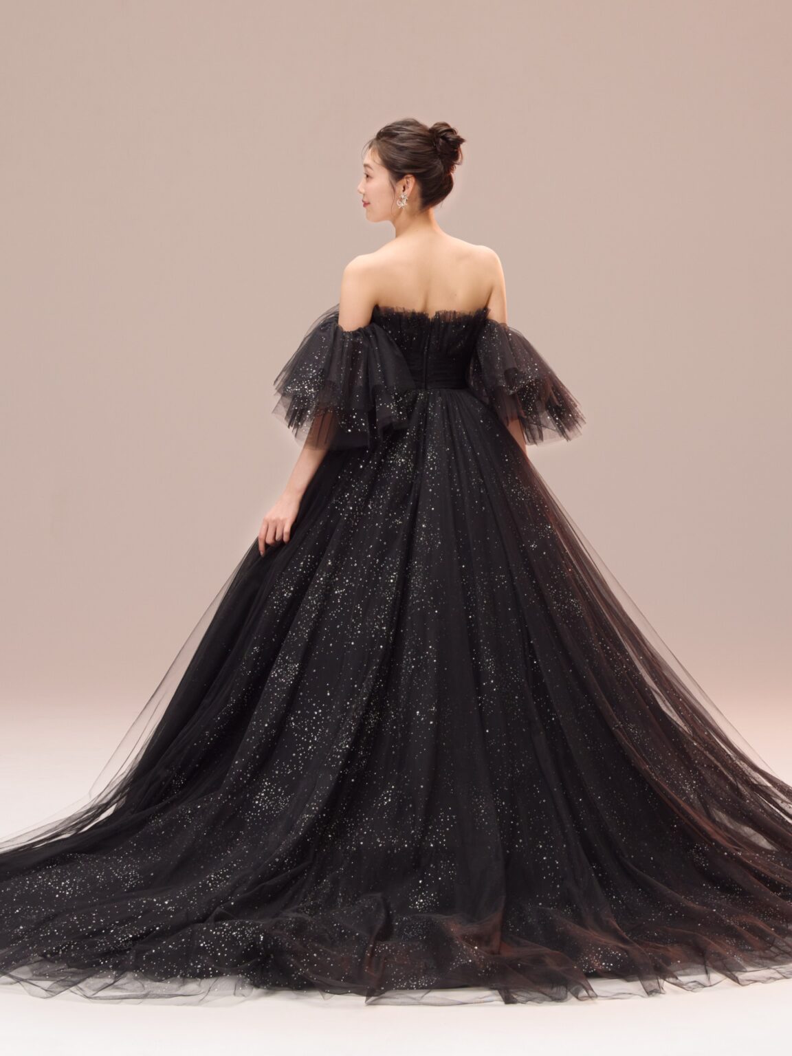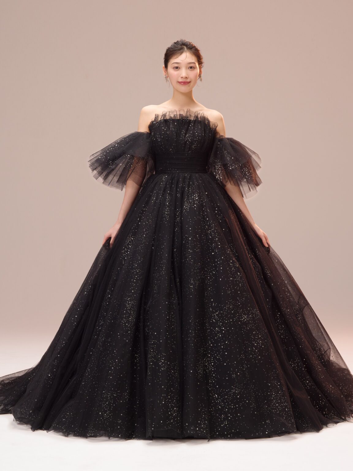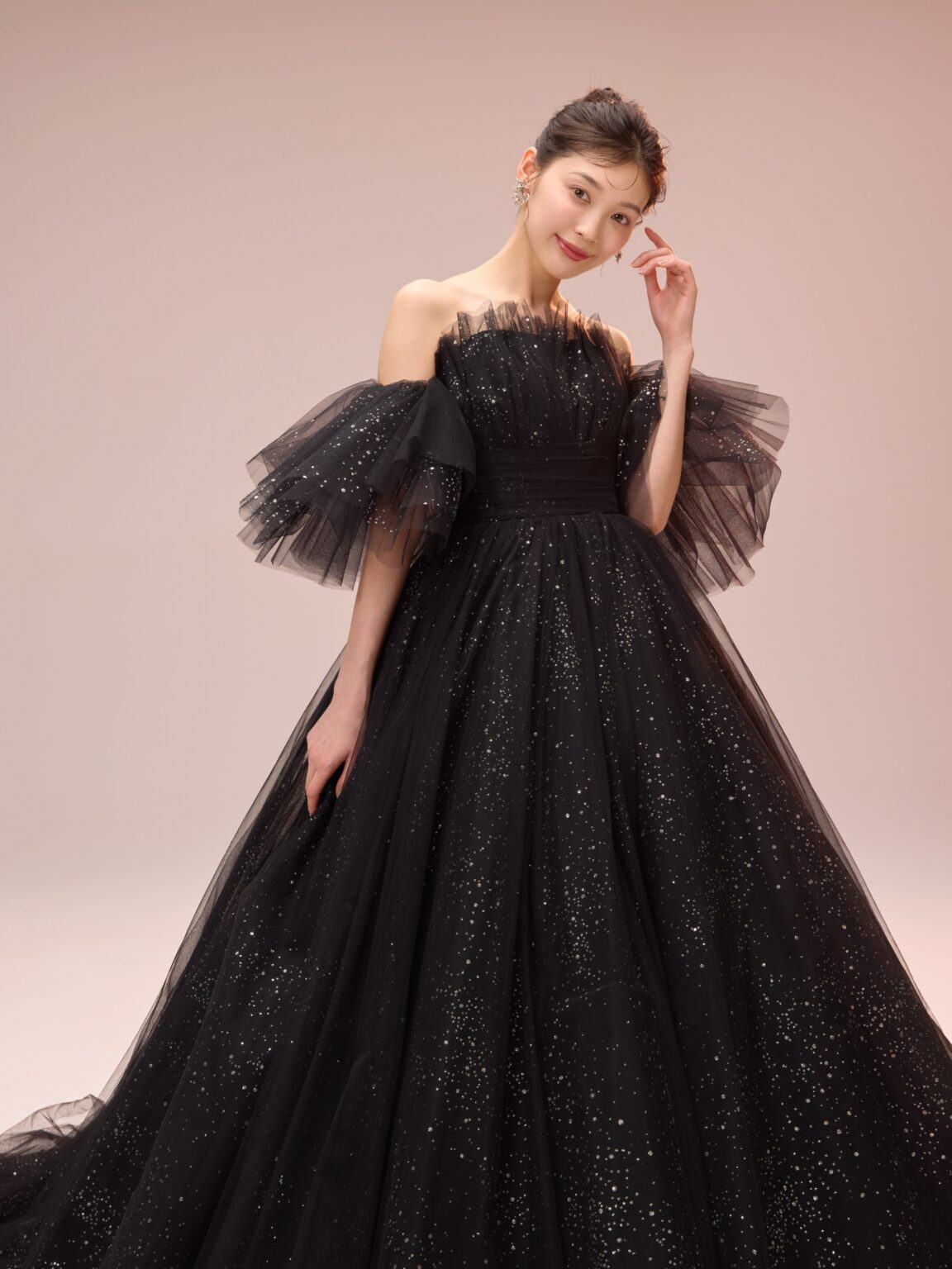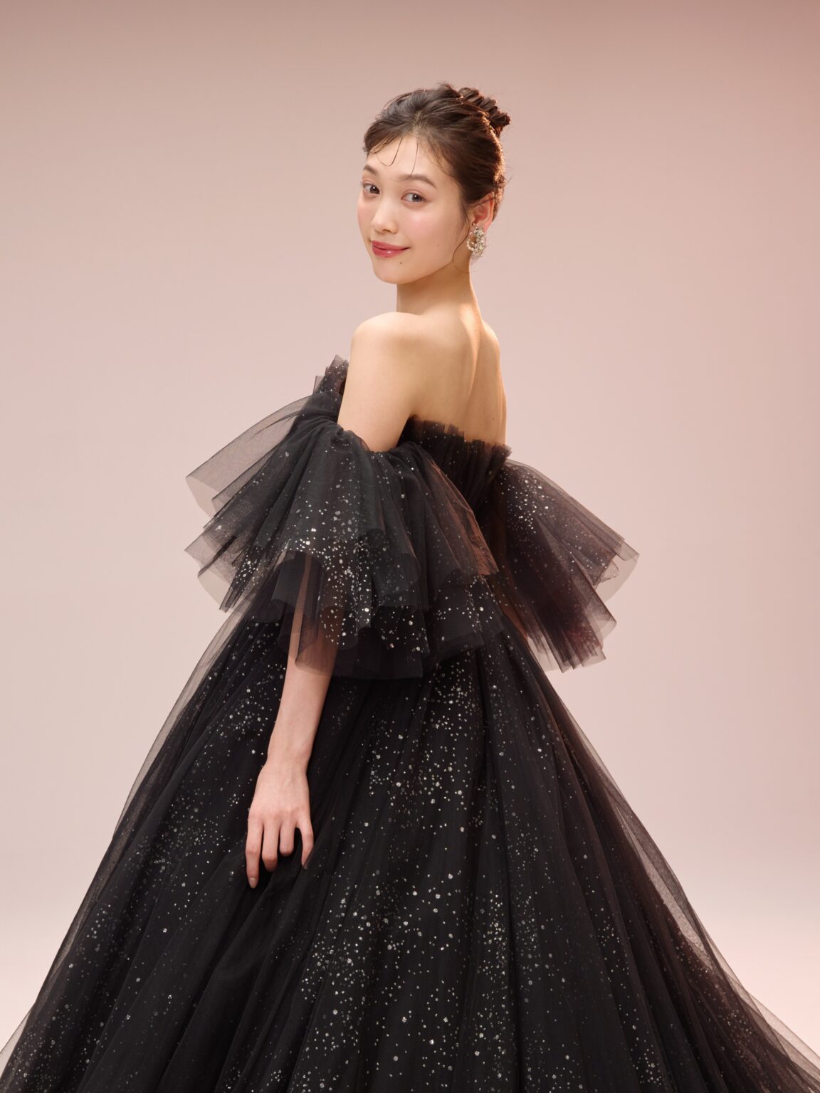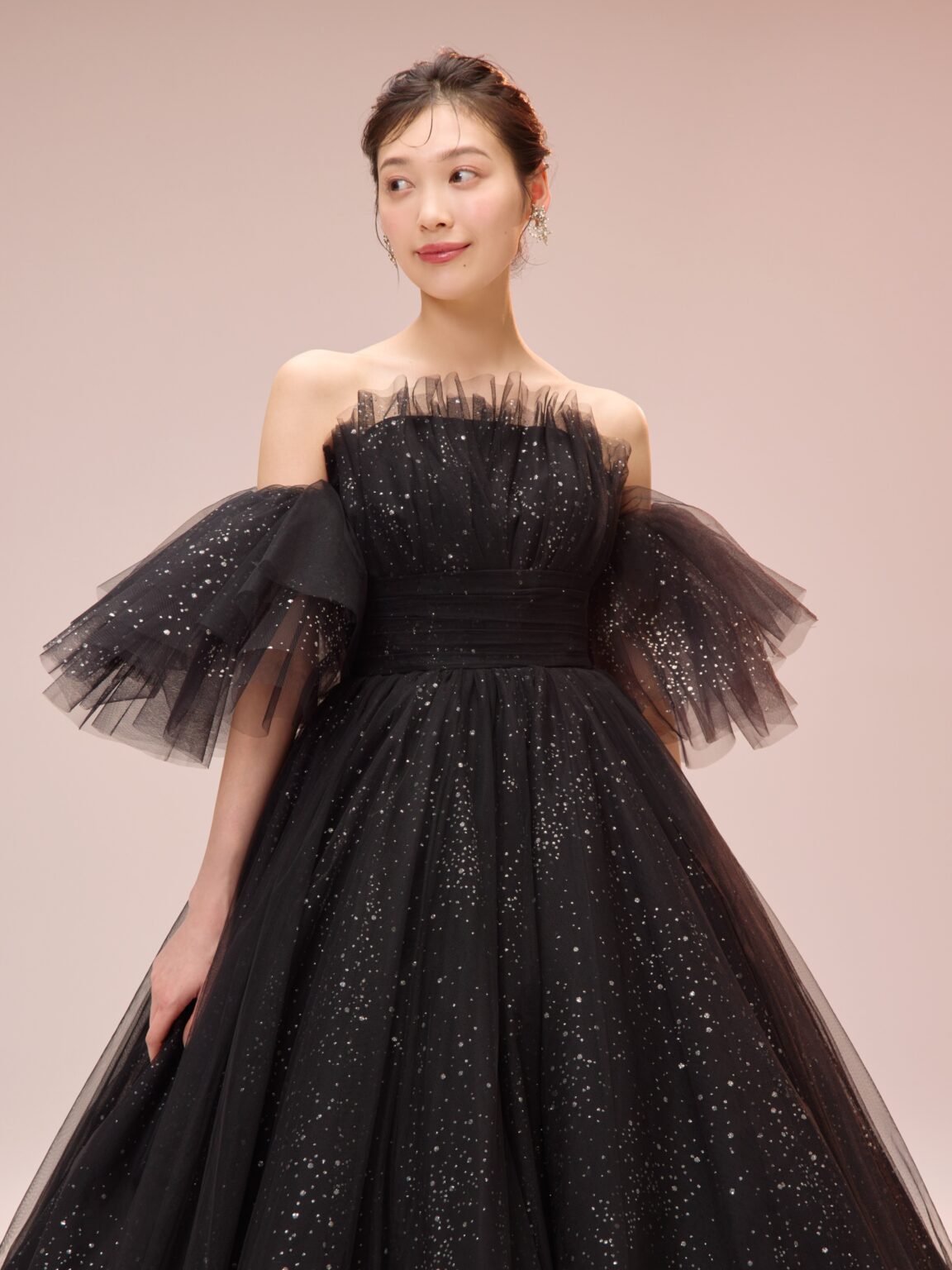 大粒のグリッターを散りばめることでまばゆい輝きを放ち、主役感たっぷりのドレスに仕上げました。 何度も修正を重ねた胸元の立ち上がるチュールとスカートのボリューム感の対比も美しいシルエットを生むポイントに。 どんな広い会場でも映えること間違いなしの1着です。