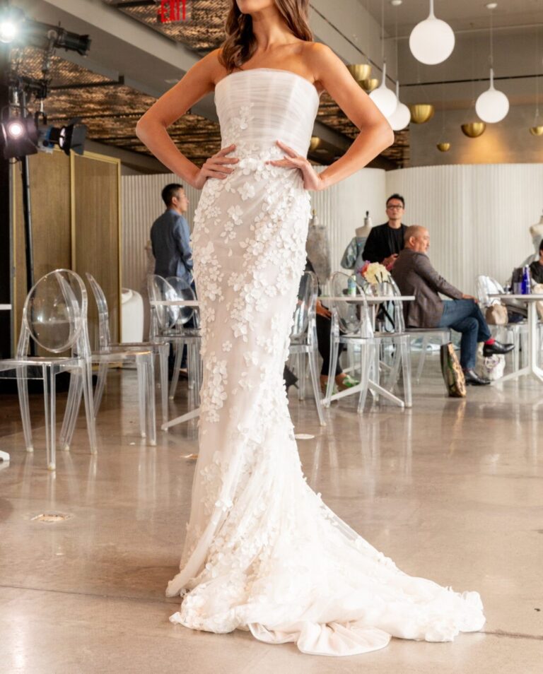 INES DI SANTOの特徴である アールデコ調のレースの 美しさ極まる1着。上質なケミカルレースを全面に使用した、ラグジュアリー感極まる1着です。 ルセット風にボーンが透けるボディのデザインがクラシックなムードを高めます。 滑らかなハートカットはバストラインをより美しく見せてくれます。 圧倒的なロングトレーンがさらに全体をドラマティックで特別感溢れるムードに。 芸術的な調度品が揃う、シックなホテルとの美しいマッチングもおすすめです。 ※お写真では220-1243をインナーボレロとして合わせています。