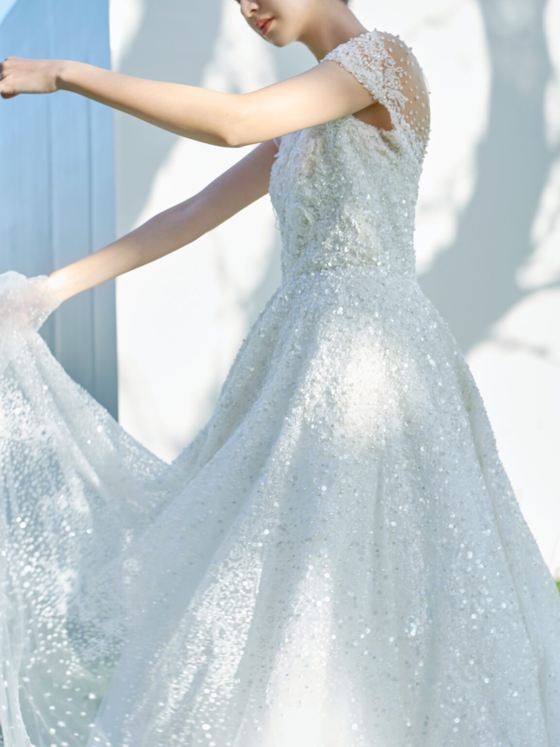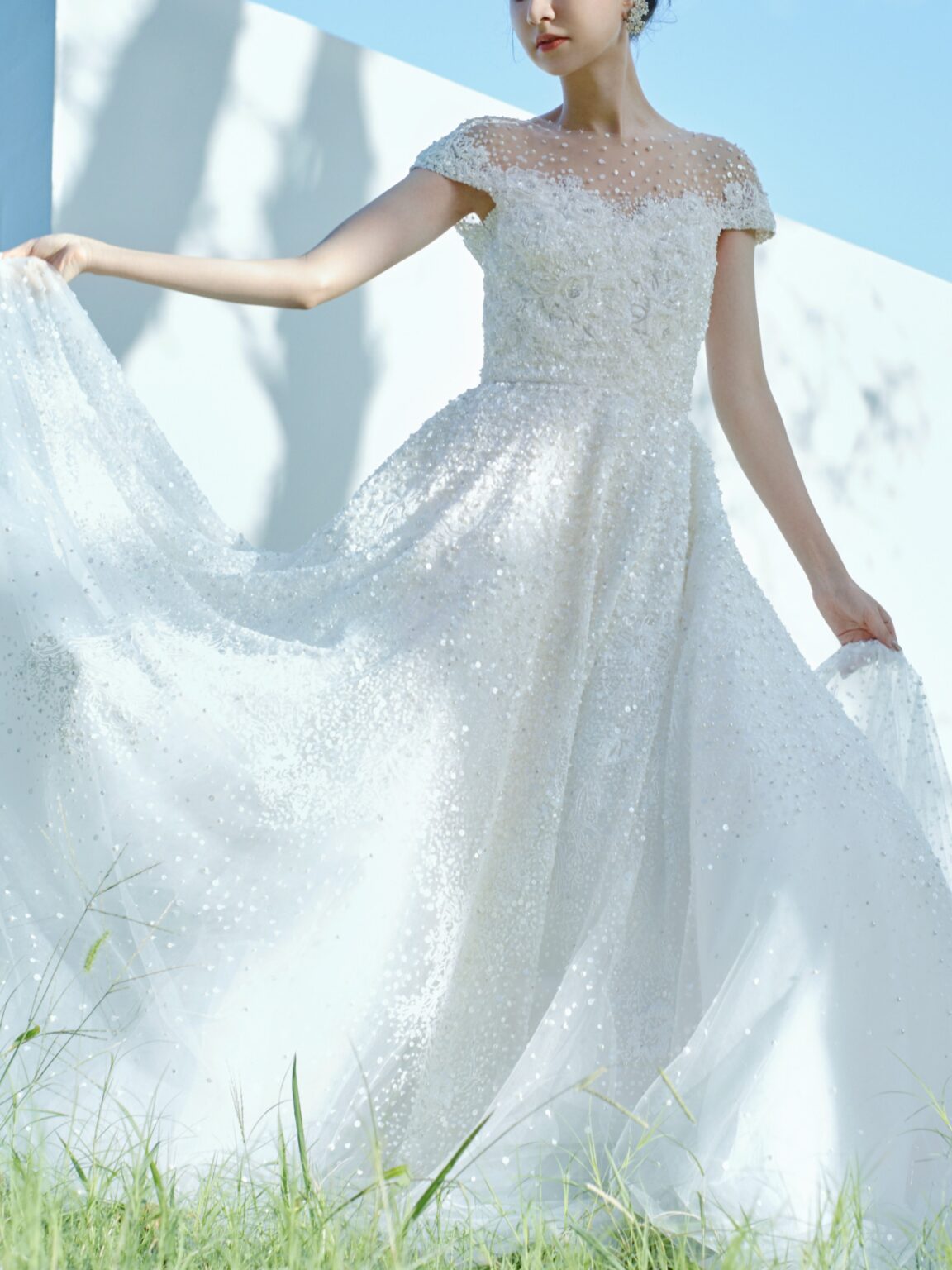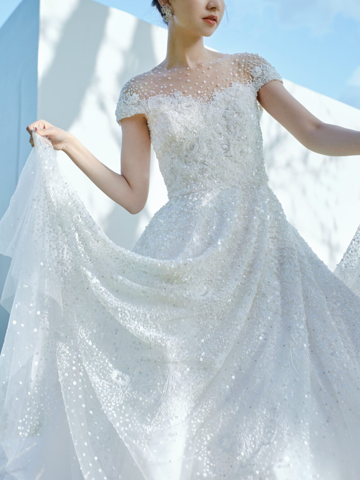 繊細で精巧で 圧倒的な美しさを放つ ホワイトビーディングが最大の魅力。 ショルダーやスカートの裾にかけて ビーディングがグラデーションになっていく様は 圧巻の美しさ。 マテリアルのカラーをホワイトに統一し きらびやかさの中に 透明感と優しさを与えています。
