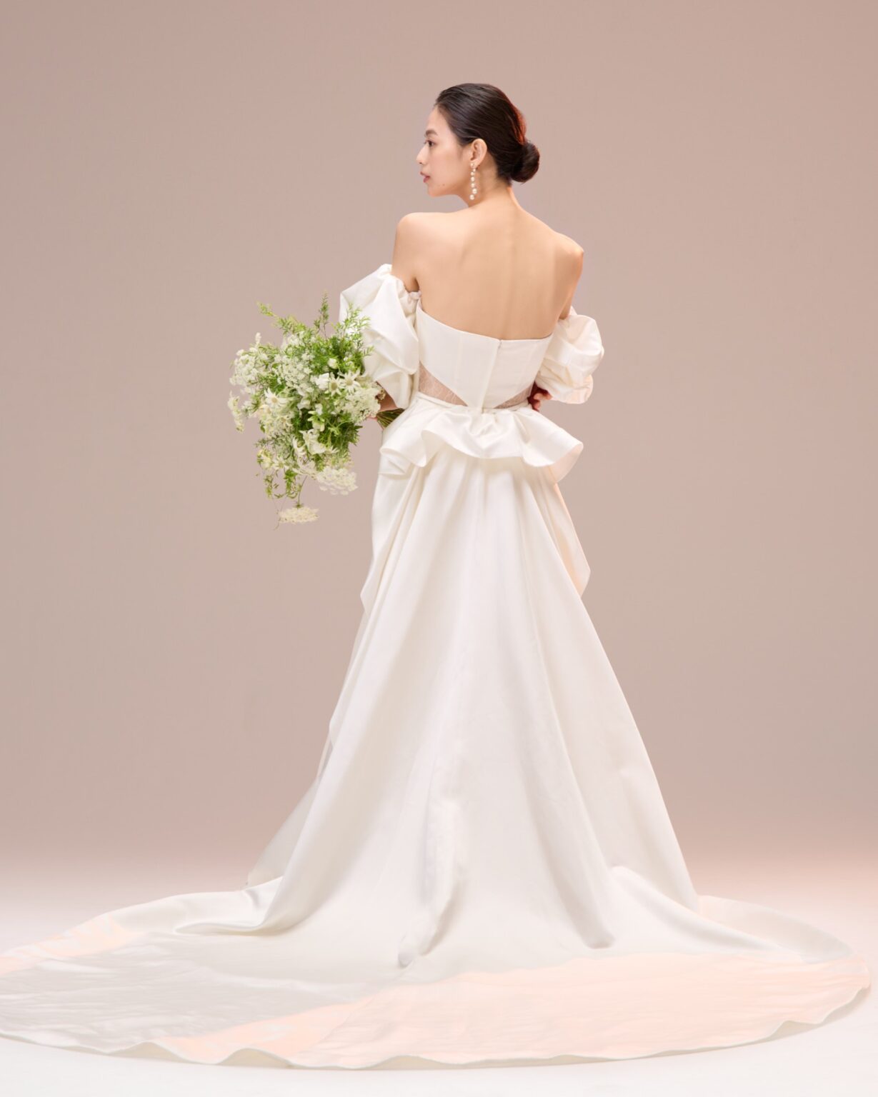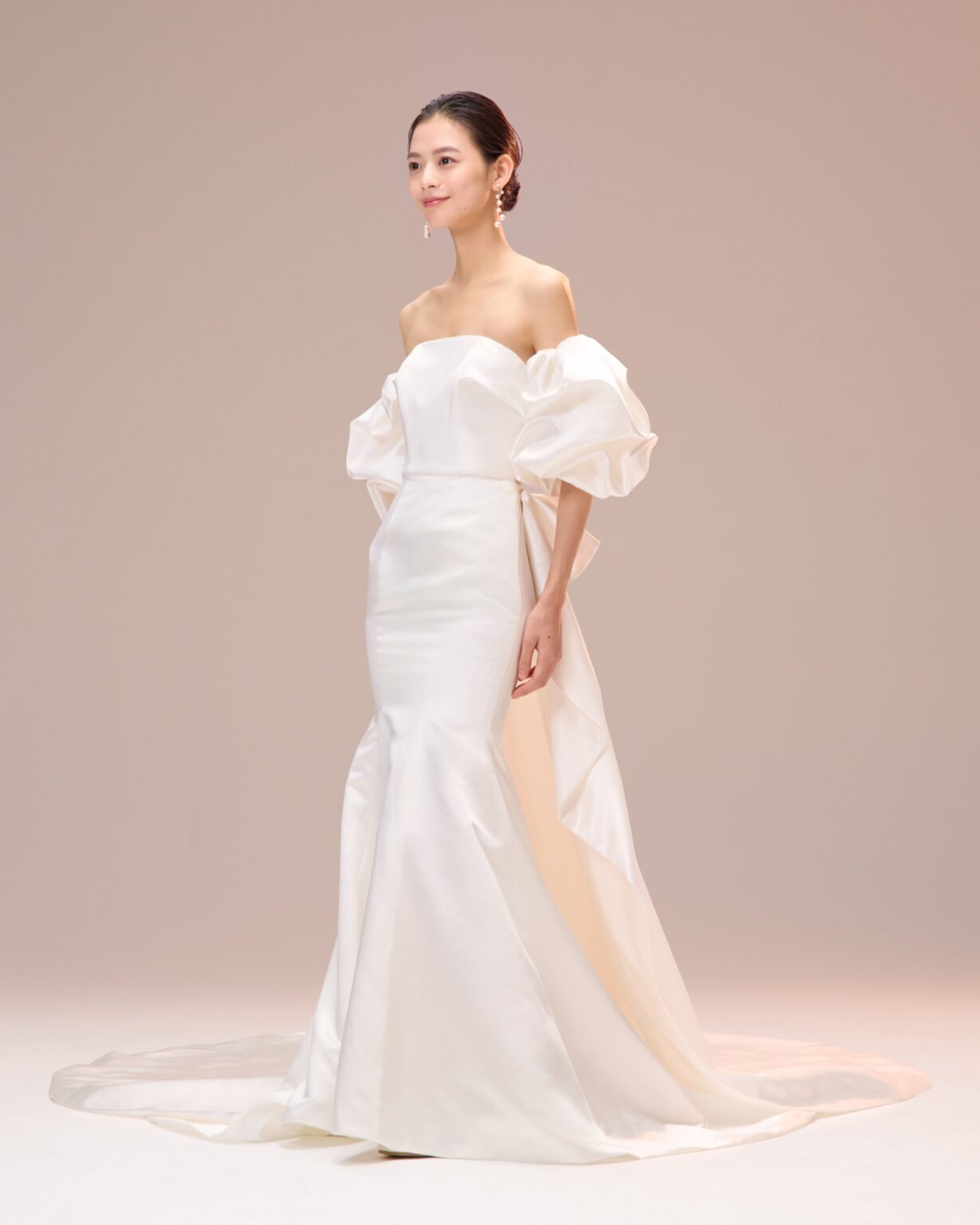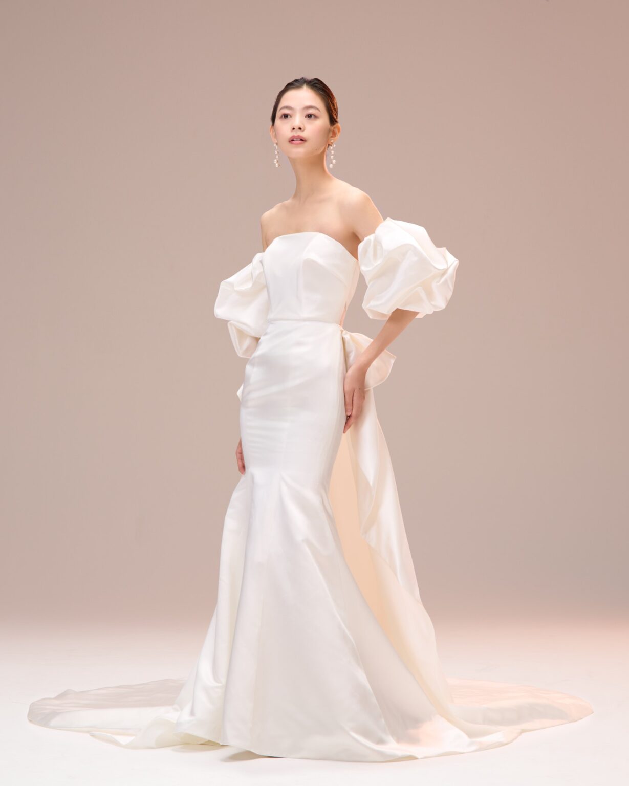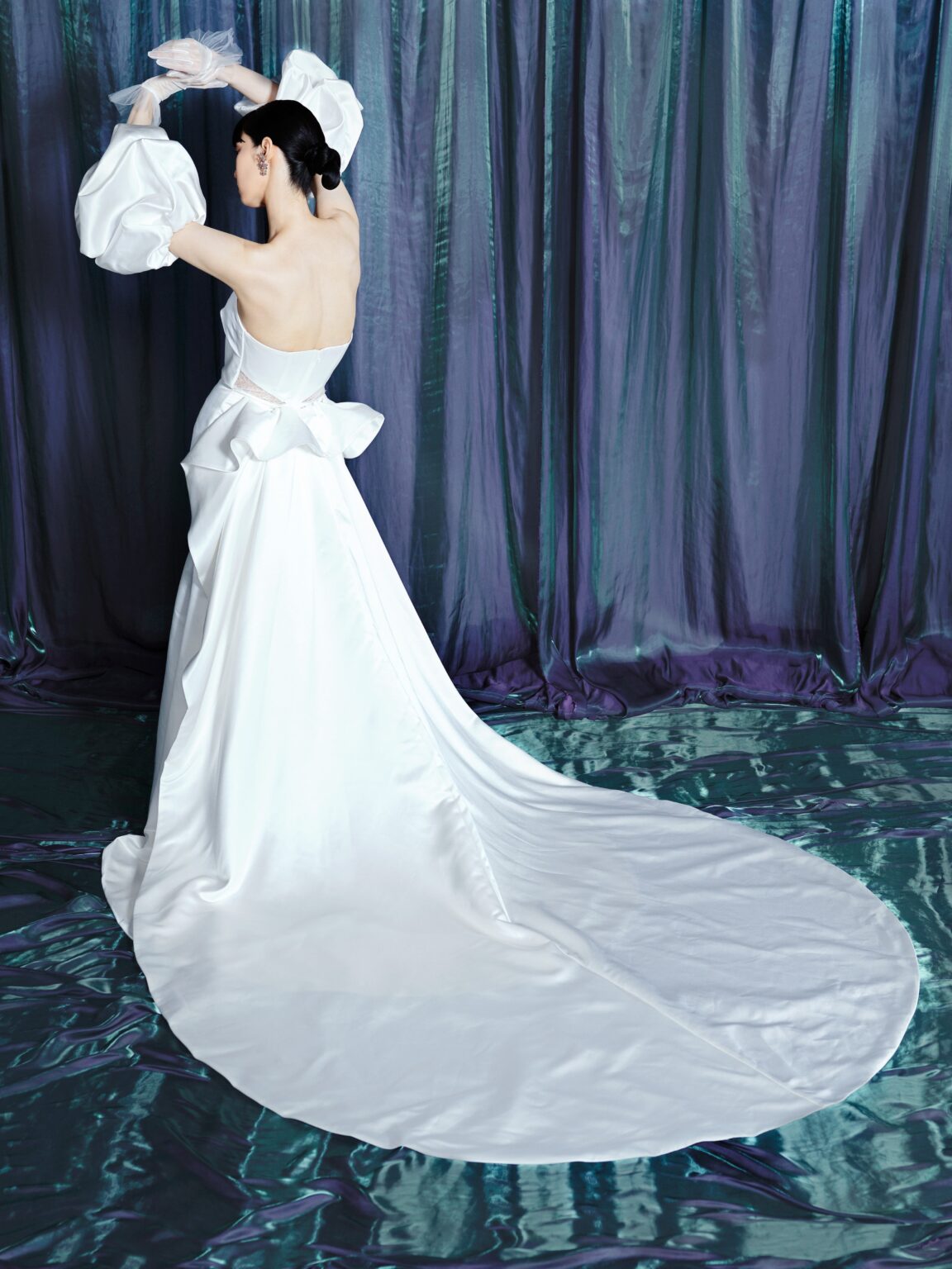 トレンドのパフスリーブがキャッチーな美しいサテン地のマーメイドドレス。 ストレートウエストラインには、フランス製のリバーレースを使用し、ちらりと肌が透けるシアーデザインに。 また、パフスリーブだけでなく、トレーンも着脱可能なため4wayのスタイリングをお楽しみいただけます。 スタイリングは、トレンドのパールを使ったヘアメイクやアクセサリー、ツヤ感のあるシンプルなシニヨンなどミニマムなスタイリングがおすすめです。