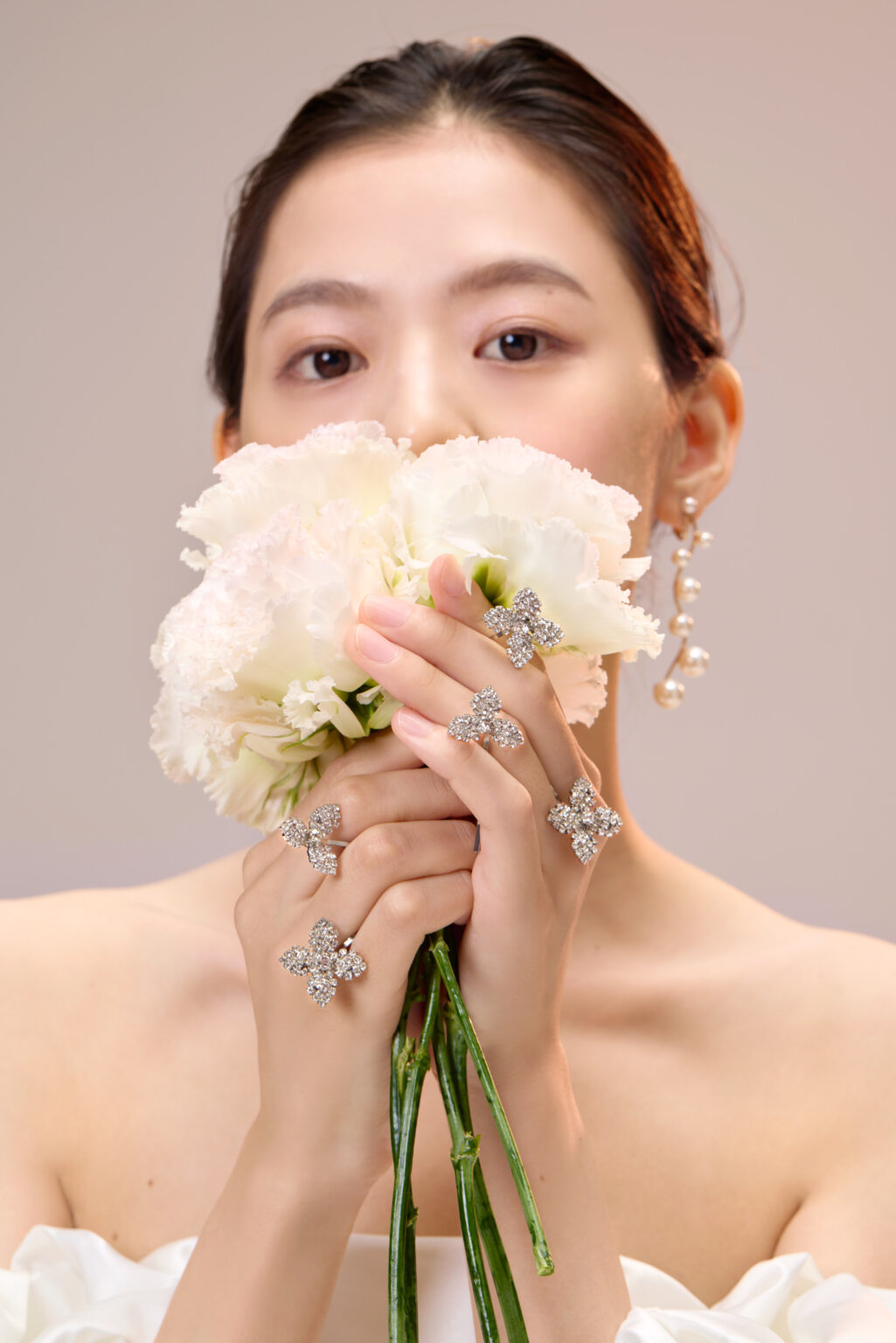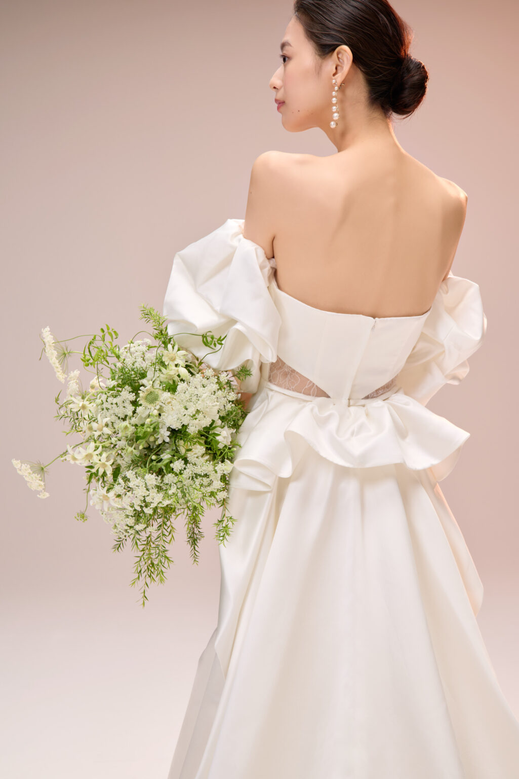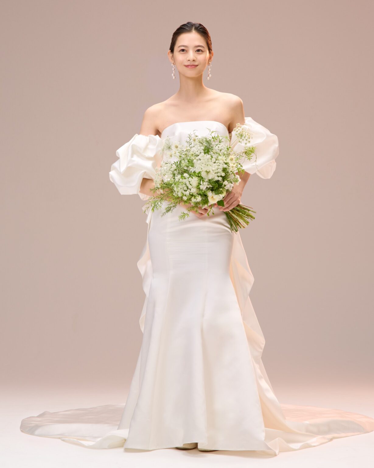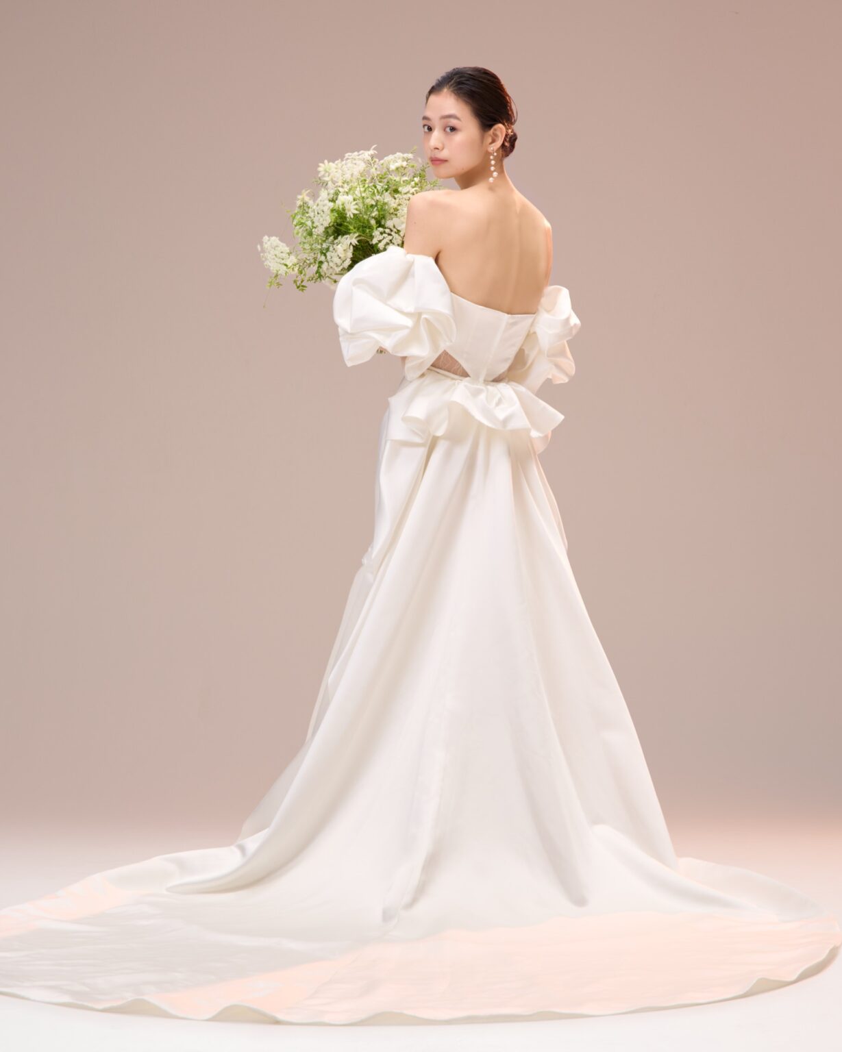 トレンドのパフスリーブがキャッチーな美しいサテン地のマーメイドドレス。 ストレートウエストラインには、フランス製のリバーレースを使用し、ちらりと肌が透けるシアーデザインに。 また、パフスリーブだけでなく、トレーンも着脱可能なため4wayのスタイリングをお楽しみいただけます。 スタイリングは、トレンドのパールを使ったヘアメイクやアクセサリー、ツヤ感のあるシンプルなシニヨンなどミニマムなスタイリングがおすすめです。