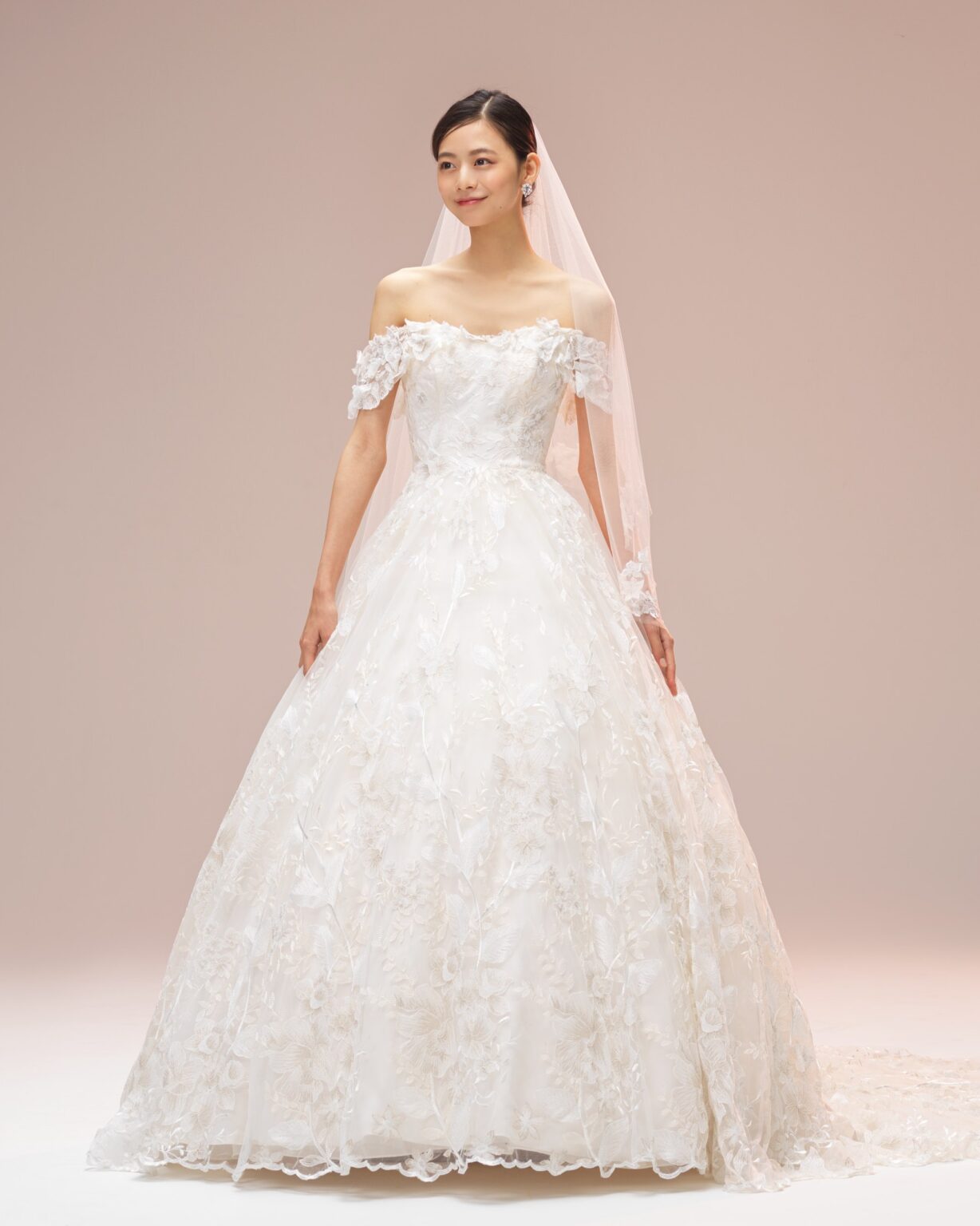 ゴールドの糸が織り込まれたフラワーモチーフのエンブロイダリーレースがドレス全体に施された華やかでゴージャスな1着。 オフショルダー部分にはエンブロイダリーレースを1枚ずつカットし、ハンドメイドで丁寧にあしらいました。 ティアラや大ぶりなイヤリング、花弁の大きなお花をまとめたブーケを合わせると、華やかできらびやかな花嫁姿に、華奢な動きのあるイヤリングや小花やツタ植物をまとめたクラッチブーケを合わせると、華やかながらも可憐な花嫁姿に。 ぜひ自分らしさを叶えるスタイリングまでお楽しみくださいませ。
