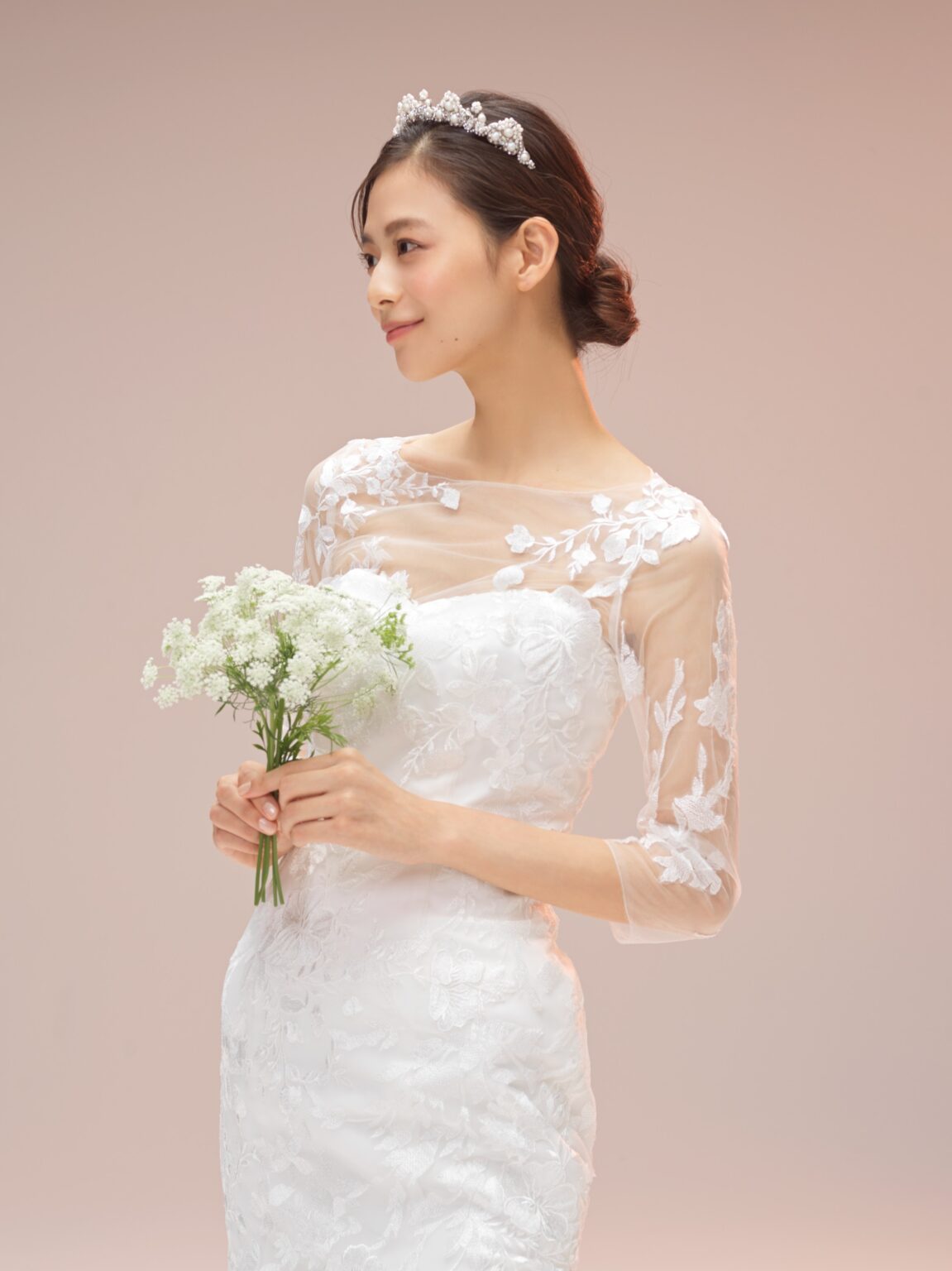 日本の花嫁さまにもマーメイドドレスをお召いただきやすいよう、スカートの切り返しを高めにし、ヒップ下から自然にスカートが広がるよう仕上げました。 オフホワイトの刺繍レースが全身を華やかに彩り、着脱可能な七分袖のインナーボレロが胸元や腕周りを自然にカバーしつつ、レースの配置によってシアー感も表現しています。 また、背中から裾に向けて続くくるみボタンがより上品で洗練されたブライズスタイルを叶えます。 低身長の花嫁さまにもお召いただきやすい1着です。