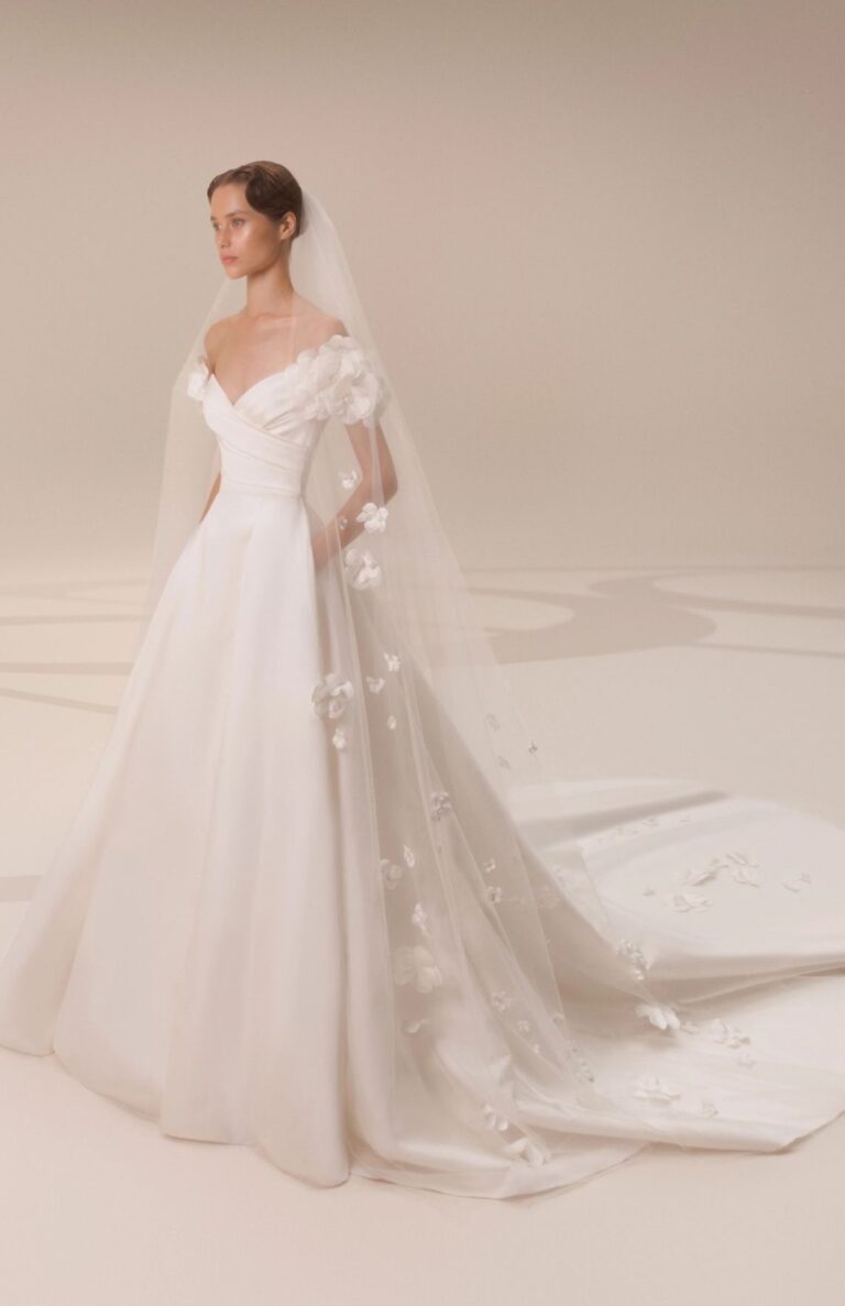 ロマンティックなボールガウンドレス。 ほんのりとアイボリーがかったチュールの上に重なるフラワーディティールと、アイビーの刺繍が立体的にあしらわれています。 オフショルダーには立体的なオーガンジーフラワーが施され、スパンコールが美しい輝きを放ちます。 オートクチュールのテクニックが光る贅沢な1着です。