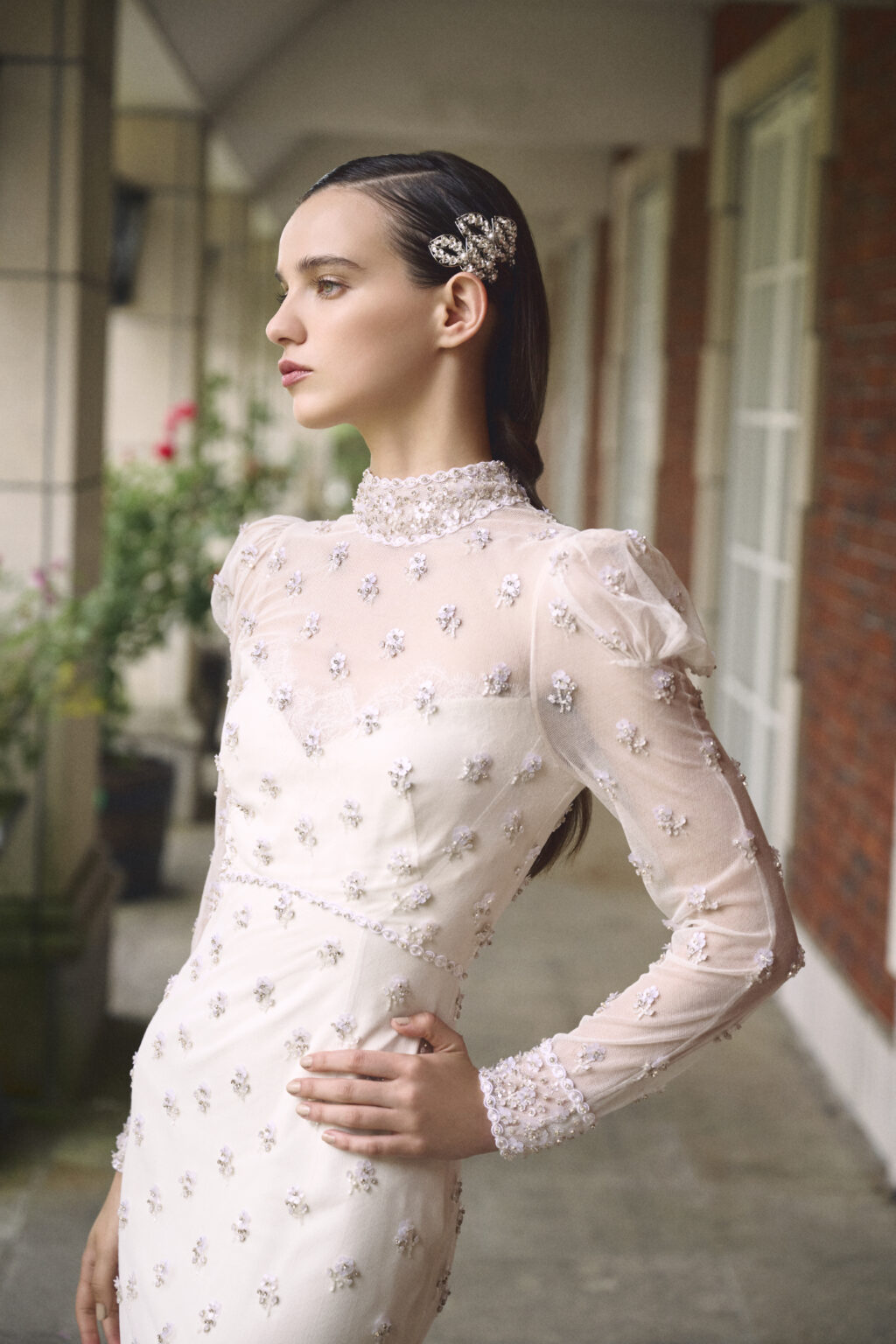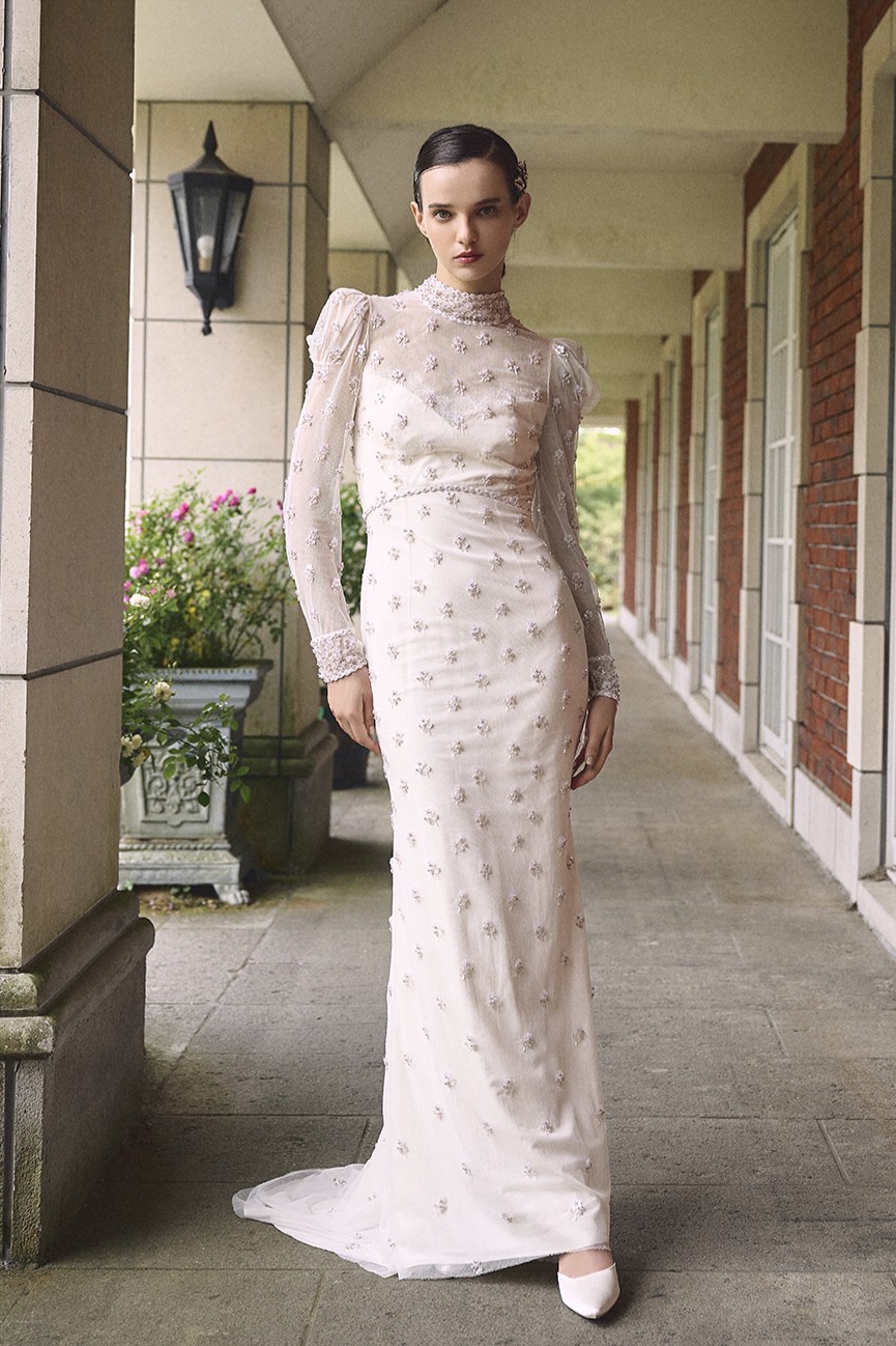 アイボリーのチュールに施されたマットなシークインのビーディングやスタンドカラーが、ヴィンテージドレスのような雰囲気を醸す1着。 ギャザーを寄せてさりげなく膨らむショルダーや、袖口のトリムなど細かなディテールにもこだわり抜き、可憐な花嫁を演出します。 挙式はもちろん、お色直しで2着目のウエディングドレスとしてお召しいただくのもおすすめです。 ※2ショット画像左のドレスとなります。