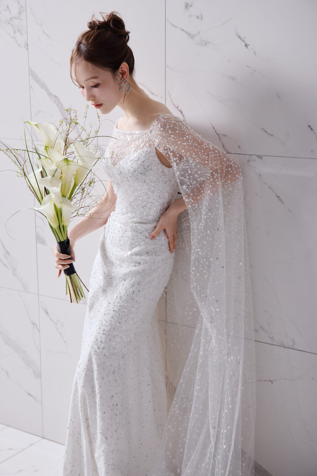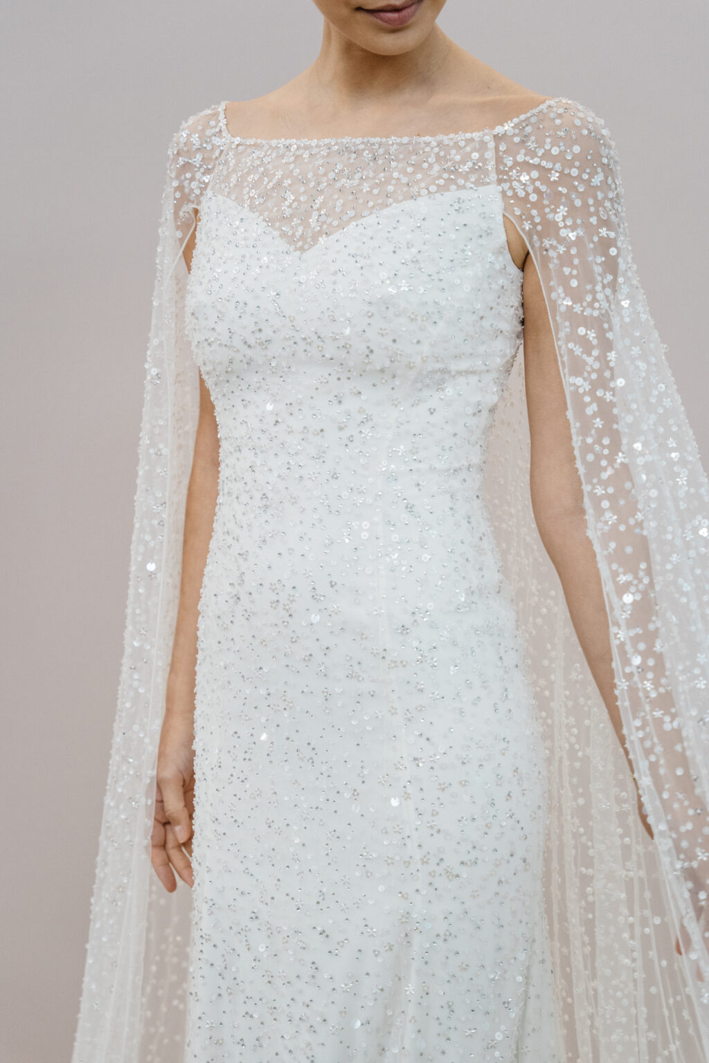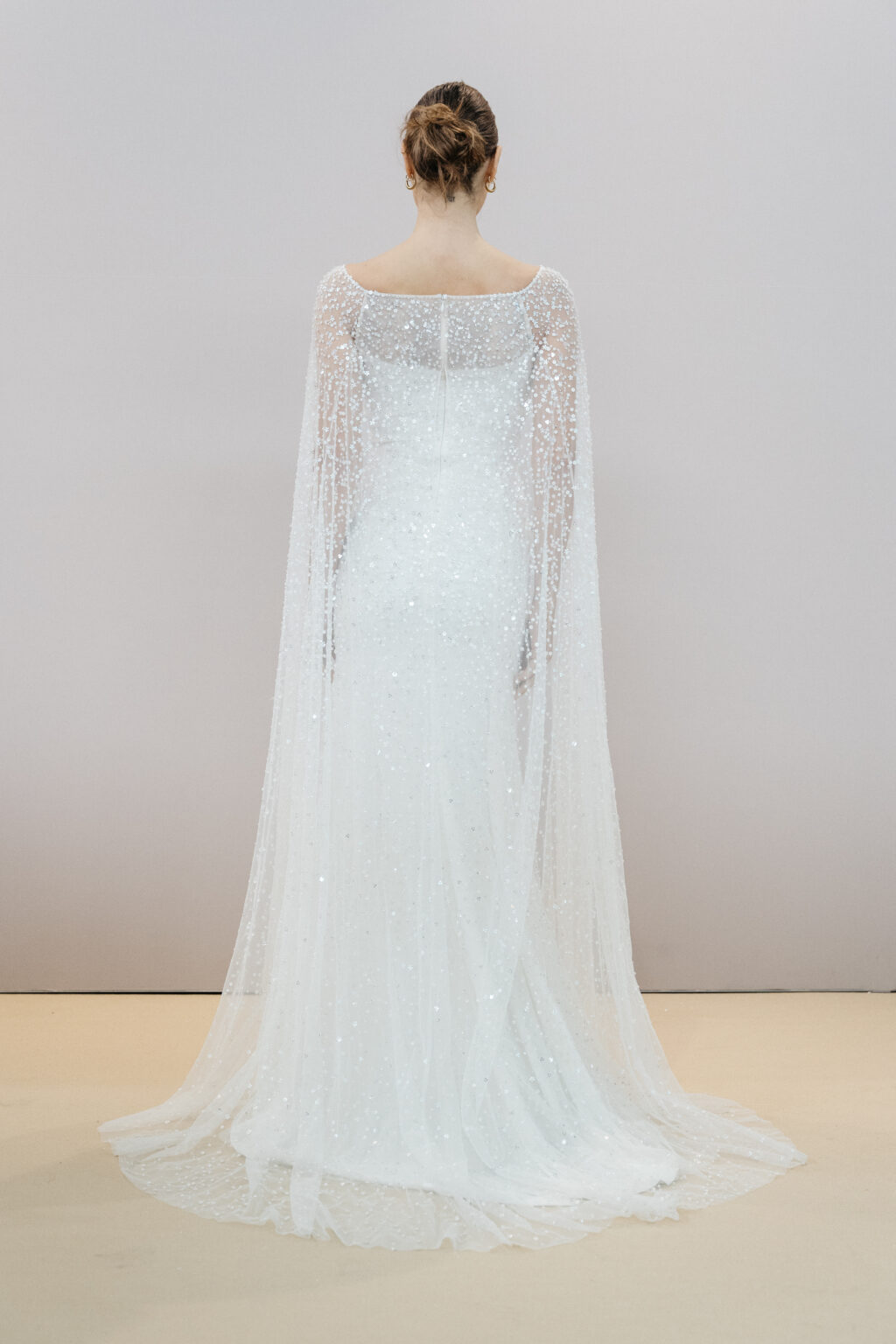 トレンドでもある“All-over Sparkle”とマントルックを取り入れ、女神のように神秘的なオーラを放つ1着。 フラワー型のシークインの繊細なビーディングや、デコルテを美しくみせるボートネックが、エレガントなシルエットの中に、女性らしい愛らしさもプラスしています。 ゲストハウスやレストランはもちろん、ホテルでのお色直しでも存在感たっぷりにお召いただける豪華な1着です。