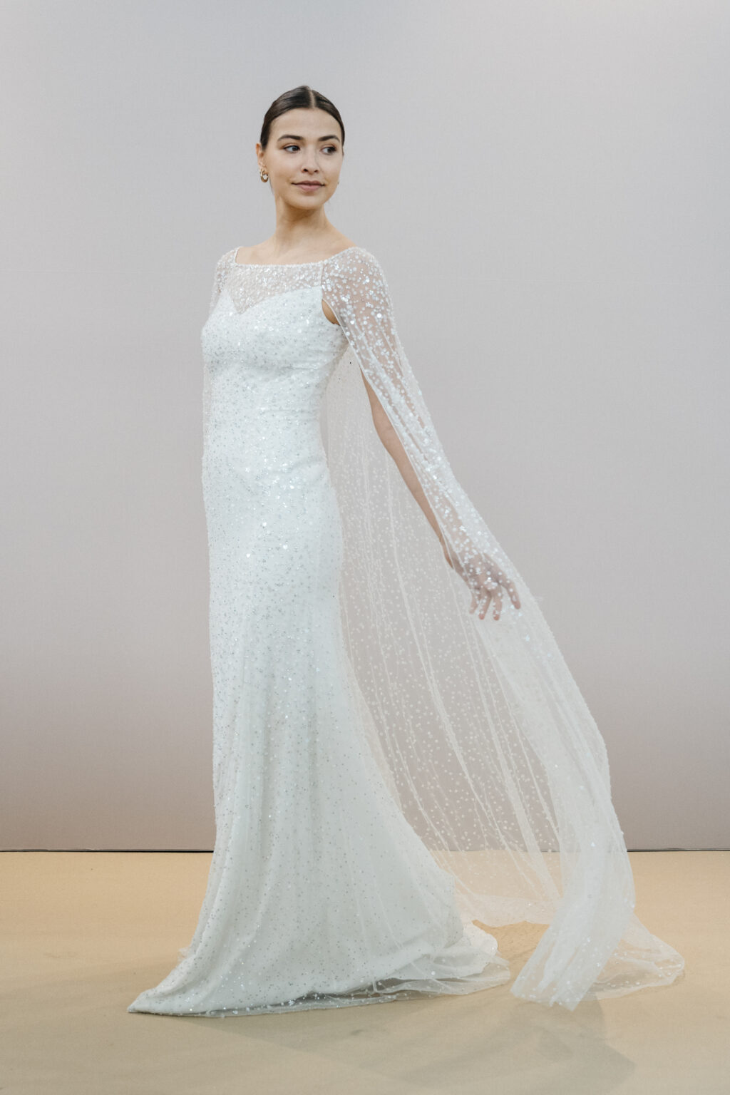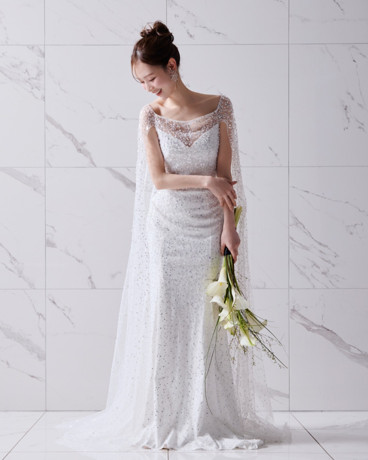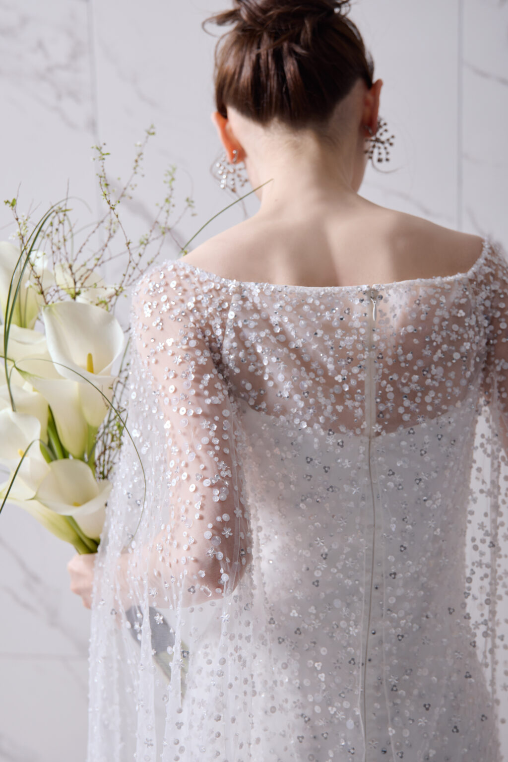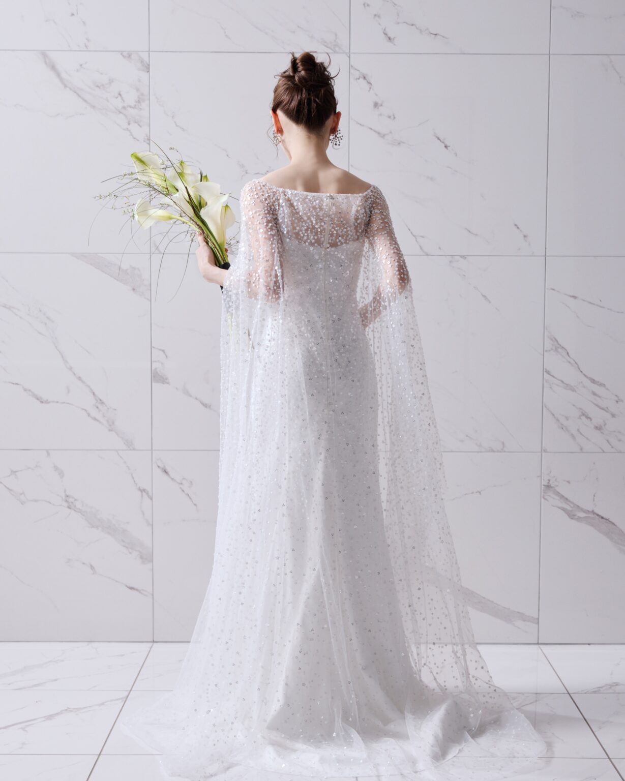 トレンドでもある“All-over Sparkle”とマントルックを取り入れ、女神のように神秘的なオーラを放つ1着。 フラワー型のシークインの繊細なビーディングや、デコルテを美しくみせるボートネックが、エレガントなシルエットの中に、女性らしい愛らしさもプラスしています。 ゲストハウスやレストランはもちろん、ホテルでのお色直しでも存在感たっぷりにお召いただける豪華な1着です。