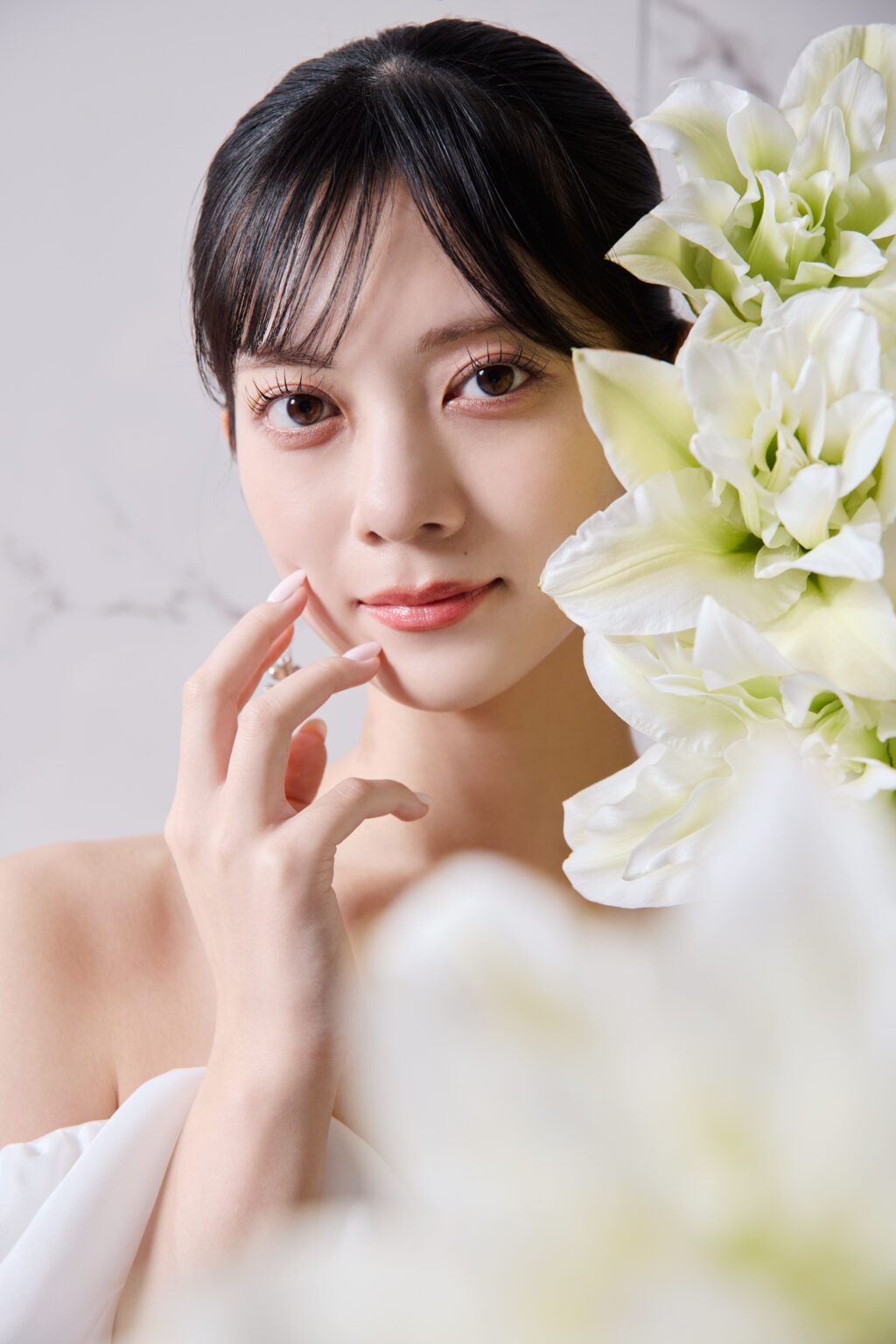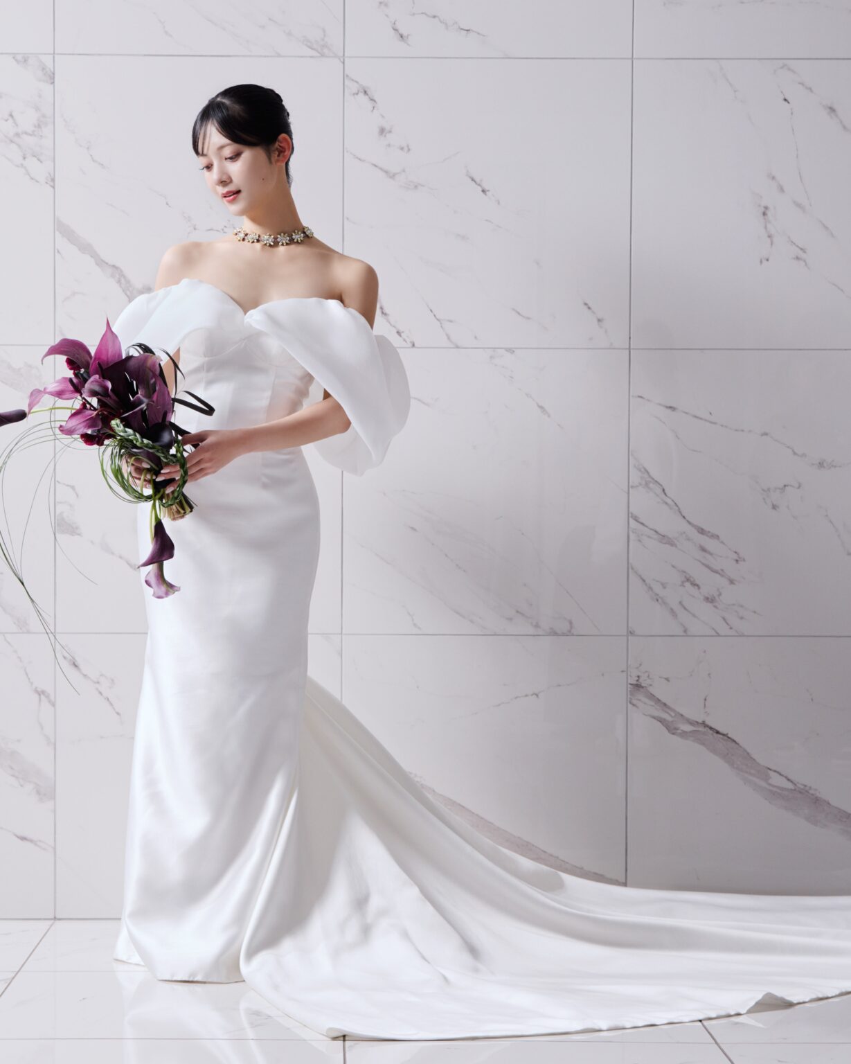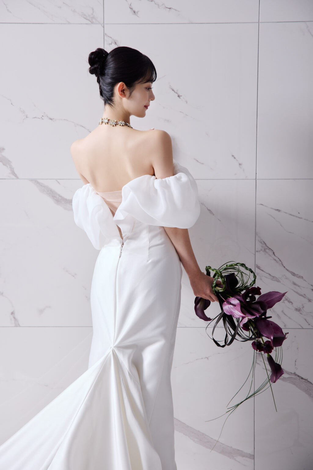 Sebantien Lukeらしいボリュームを抑えたエフォートレスな印象に、華やかなアクセントを加えた1着。 艶とハリのあるミカド素材で美しいボディラインを描くマーメイドライン、 そして花嫁さまを包み込むオーガンジーの立体的なショルダーがお顔まわりを華やかに彩ります。 ボリュームたっぷりのショルダーとの対比で、華奢にスタイルアップする効果も。 膝から大きく広がるトレーンと大胆に開いたバックスタイルにより、後ろ姿も印象的に。 エフォートレスなスタイリングはもちろん、ロングベールや大ぶりのアクセサリーを合わせた華やかな着こなしもおすすめです。