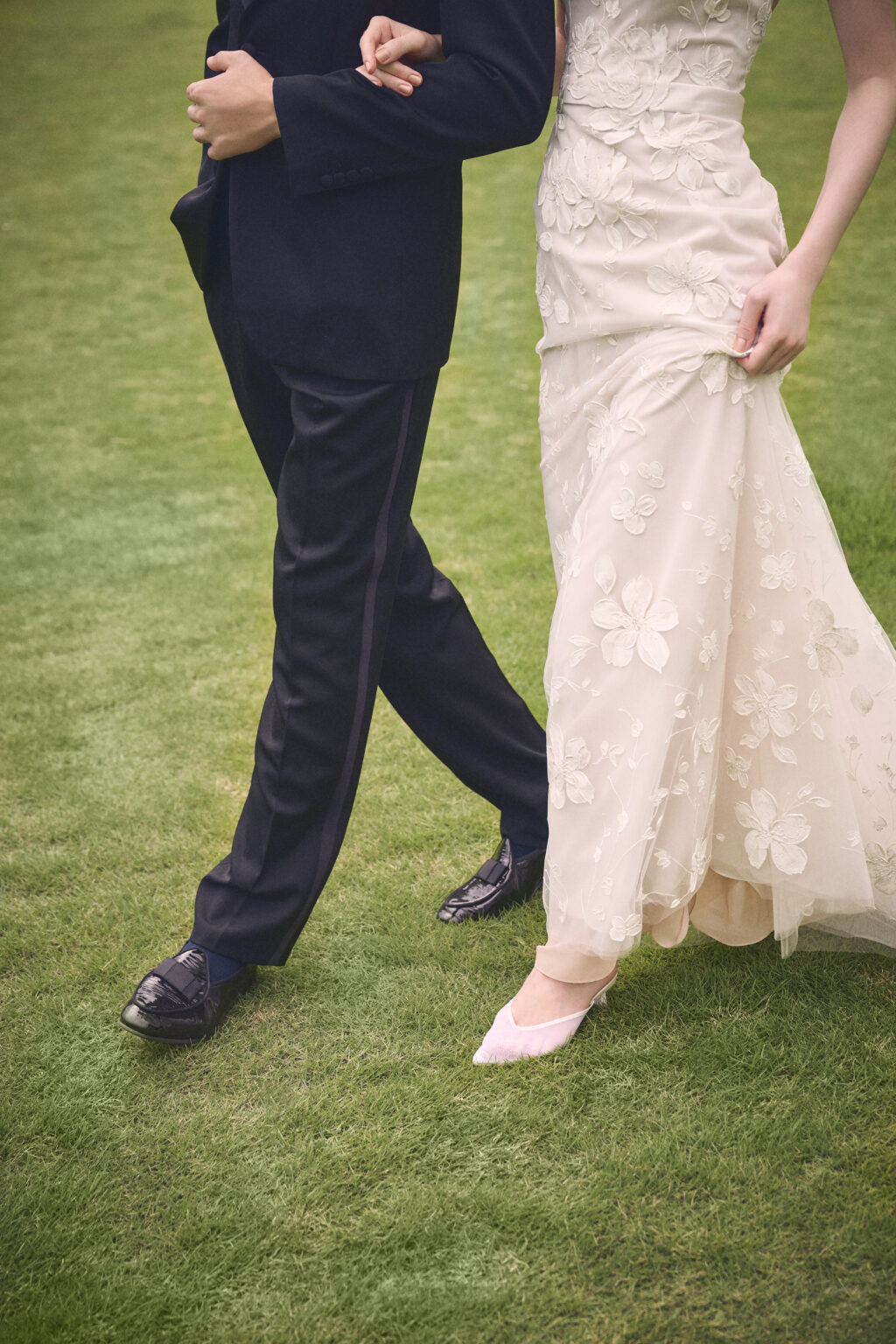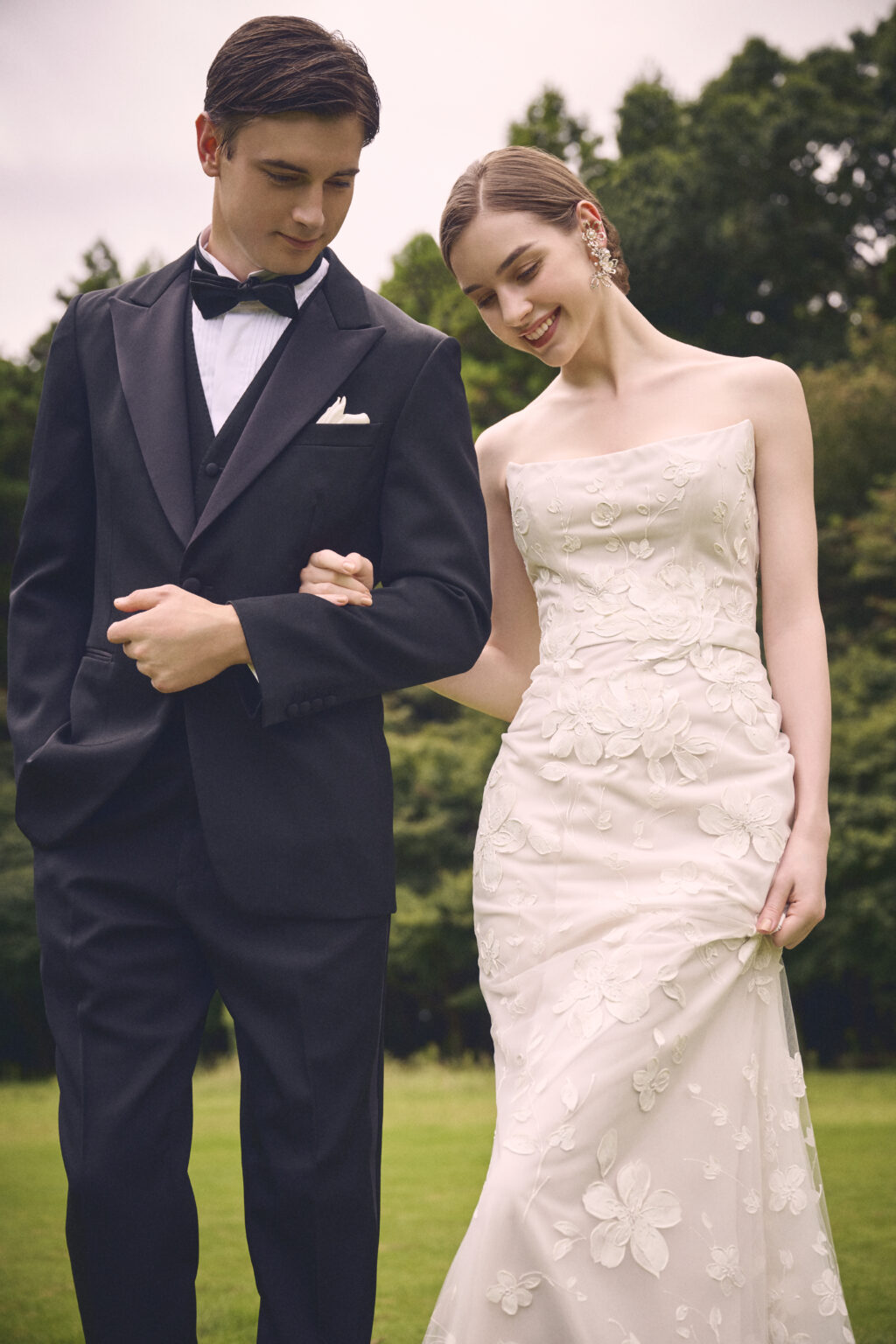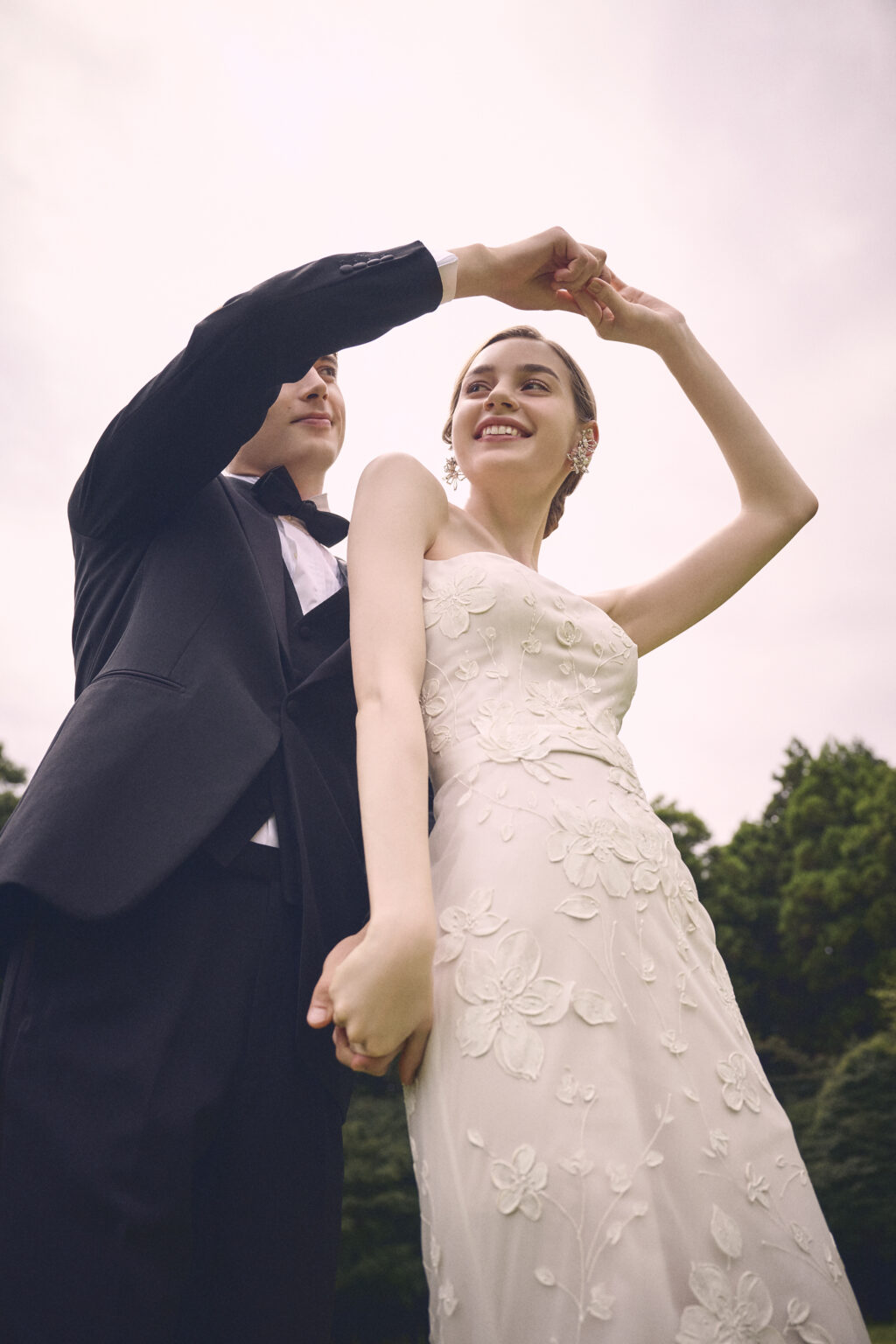職人により一枚一枚丁寧に花びらが描かれたまるで絵画のような、花柄デザインが特徴のドレス。 繊細で柔らかな花びらの表現は、シアー感のあるチュールにのせることで、まるでお肌の上に直接花を描いたかのような 儚げな美しさがあります。 花嫁の動きに合わせまるで花々が舞っているような軽やかな姿はなんとも優美。 ネックラインのキャットアイのデザインが優美な中でのデザインアクセントに。 アート作品を身に纏うように特別な一着として唯一無二のブライズスタイルを叶えます。
