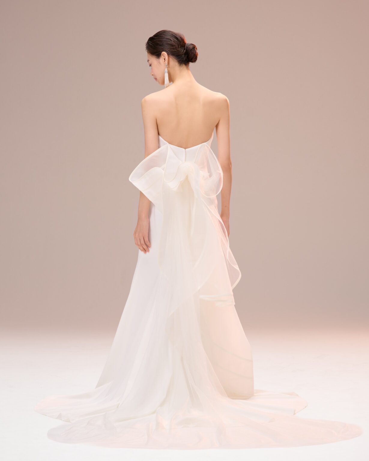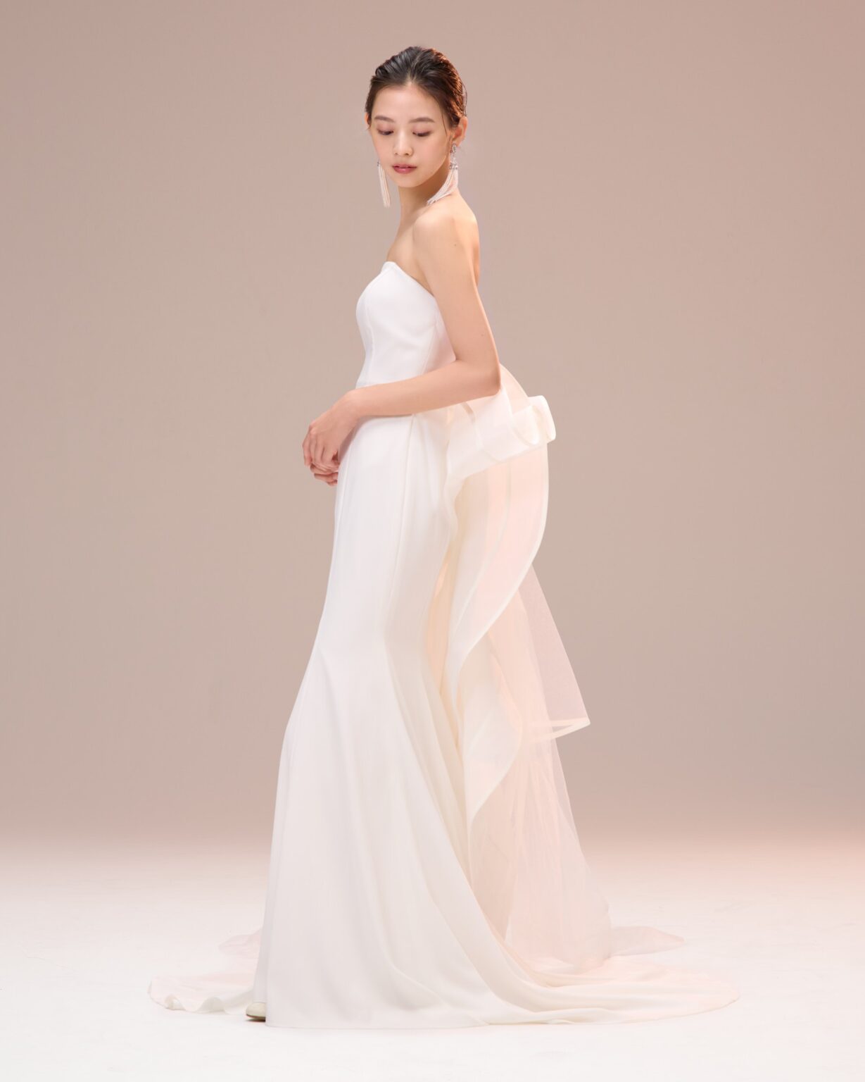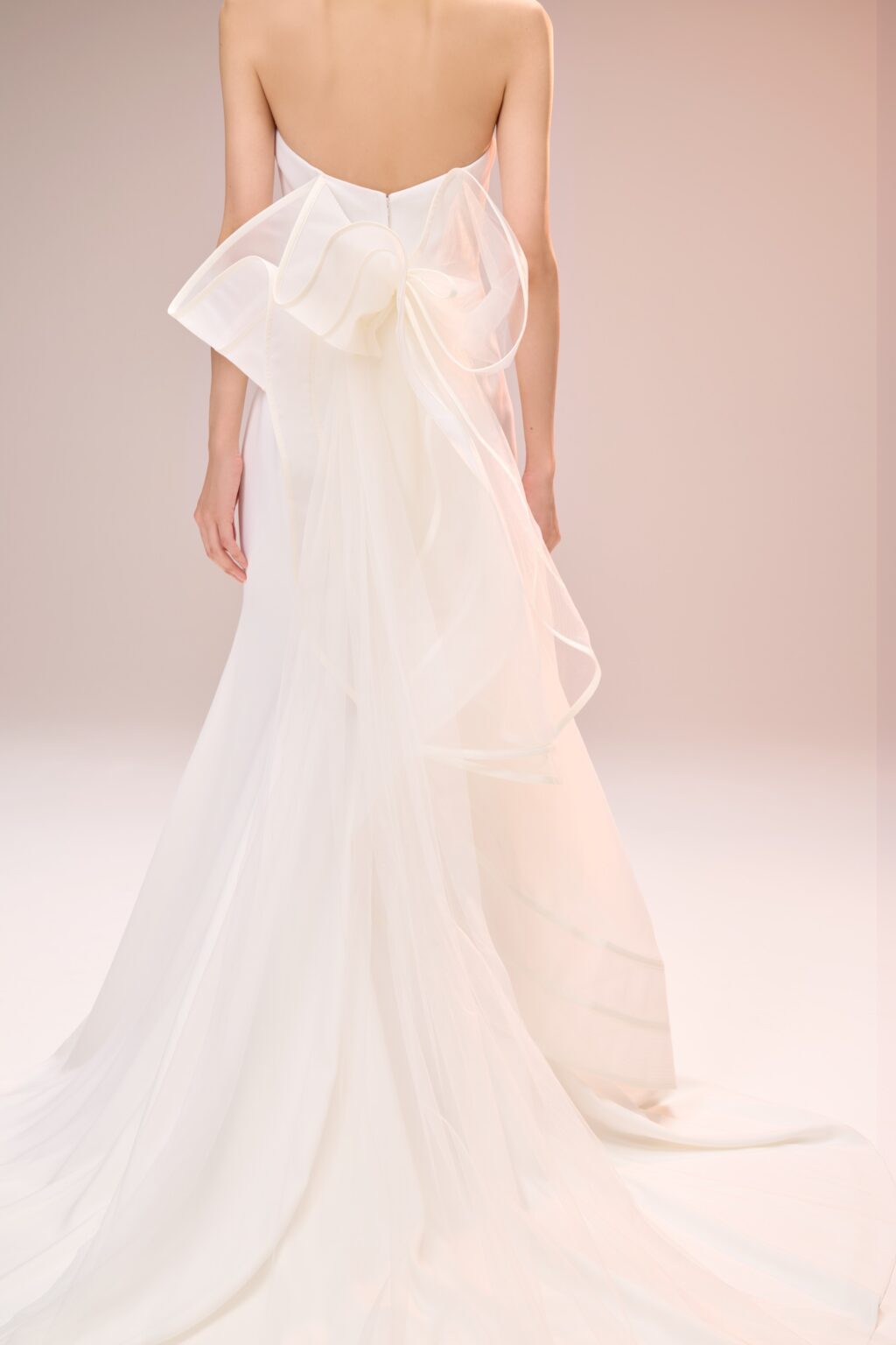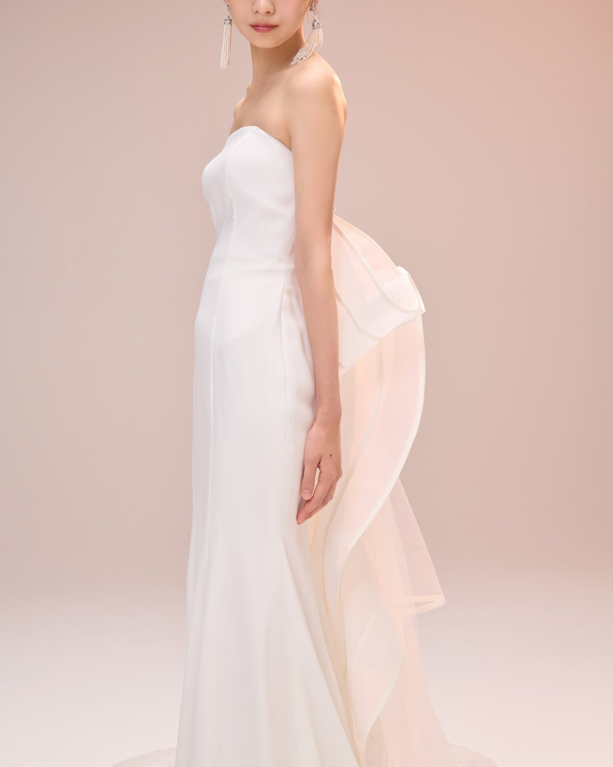 しなやかに身体に沿うソフトマーメイドラインが魅力の一着。 フロントのデザインはミニマルで、洗練された佇まい。 オーガンジーにチュールを組み合わせことで、さらに立体感のある形が叶いました。 素材がふんわりと重なるコントラストが、空気をふくんだような奥行きを感じます。 一番のポイントはバックスタイルにあしらわれたアートのようなリボンのようなデザイン。 トレーンにはホースヘアをあしらい、華やかさなバックスタイルを演出し、存在感を放ちます。 料理にこだわりのあるレストランウェディングや落ち着いたモダンなチャペルでの挙式、またホテルなどの空間にも映える1着です。 シンプルさの中に洗練と華やかさを秘めているからこそ「自分らしい美しさ」を大切にしたい花嫁さまにおすすめです。