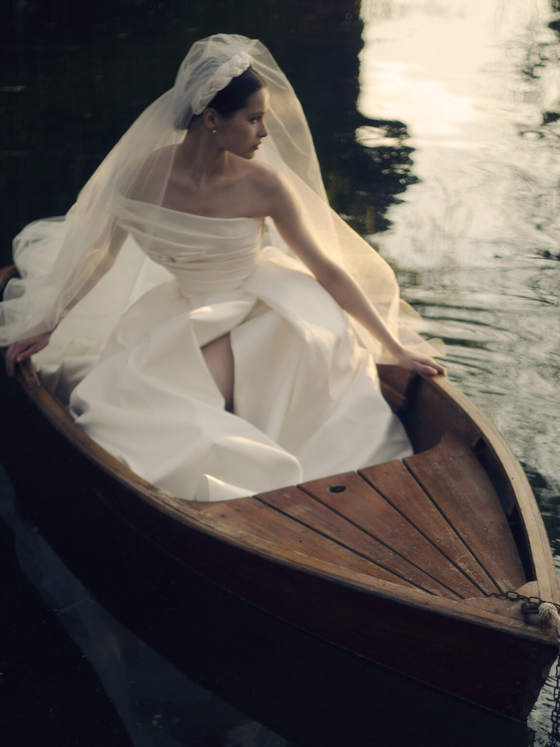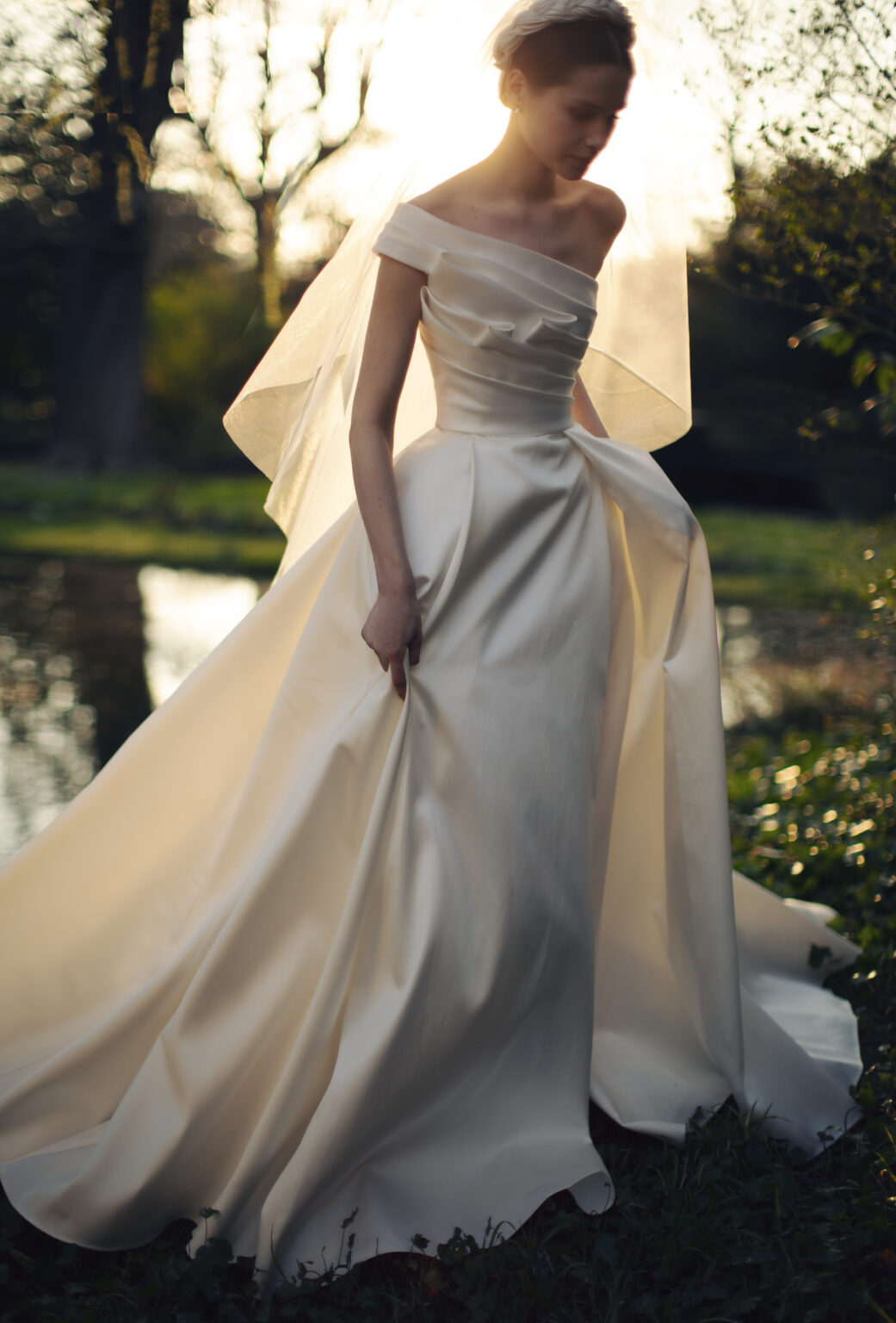 トレンドのワンショルダーをクラシカルでタイムレスなものへと昇華させているのは、計算されたパターンの美しさとミカドシルクの上質 質さ。 少し低めなショルダー位置ですので、オフショルダーのような感覚でチャレンジしていただきやすいデザインです。 立体的に施されたタックから美しく広がるボールガウンは上品な花嫁様を演出。 存在感のあるシルエットですので、ホテルウェディングや広さのある会場にも美しく映えます。 ※スリットはJUNOの花嫁様向け、閉じたデザインとなっております。