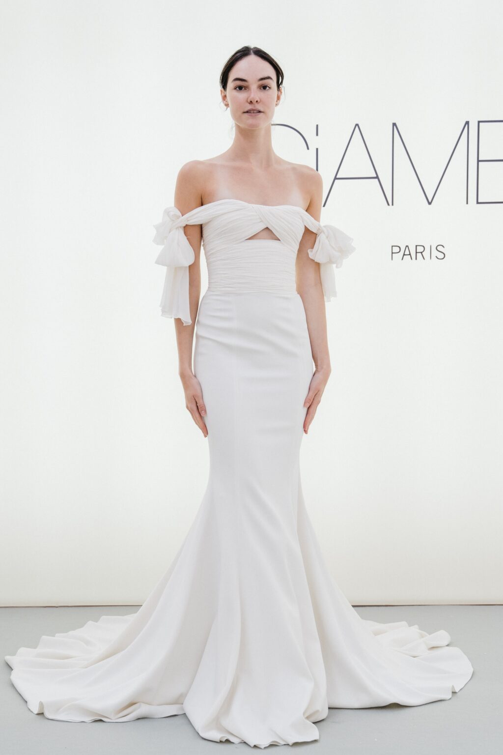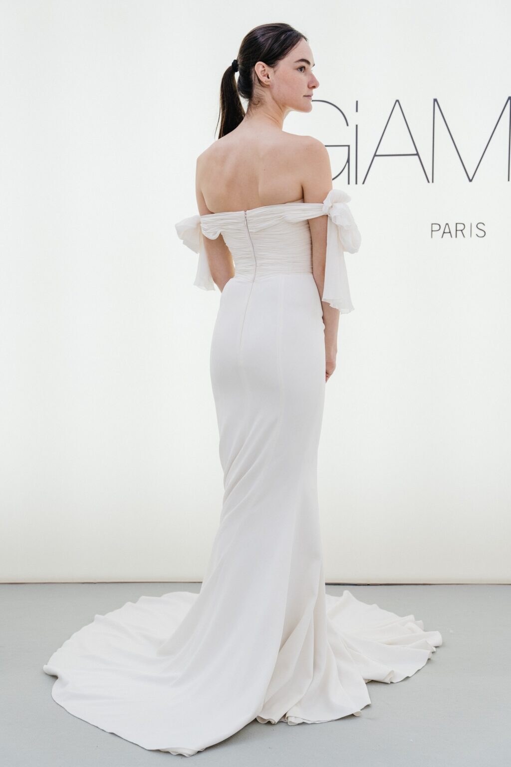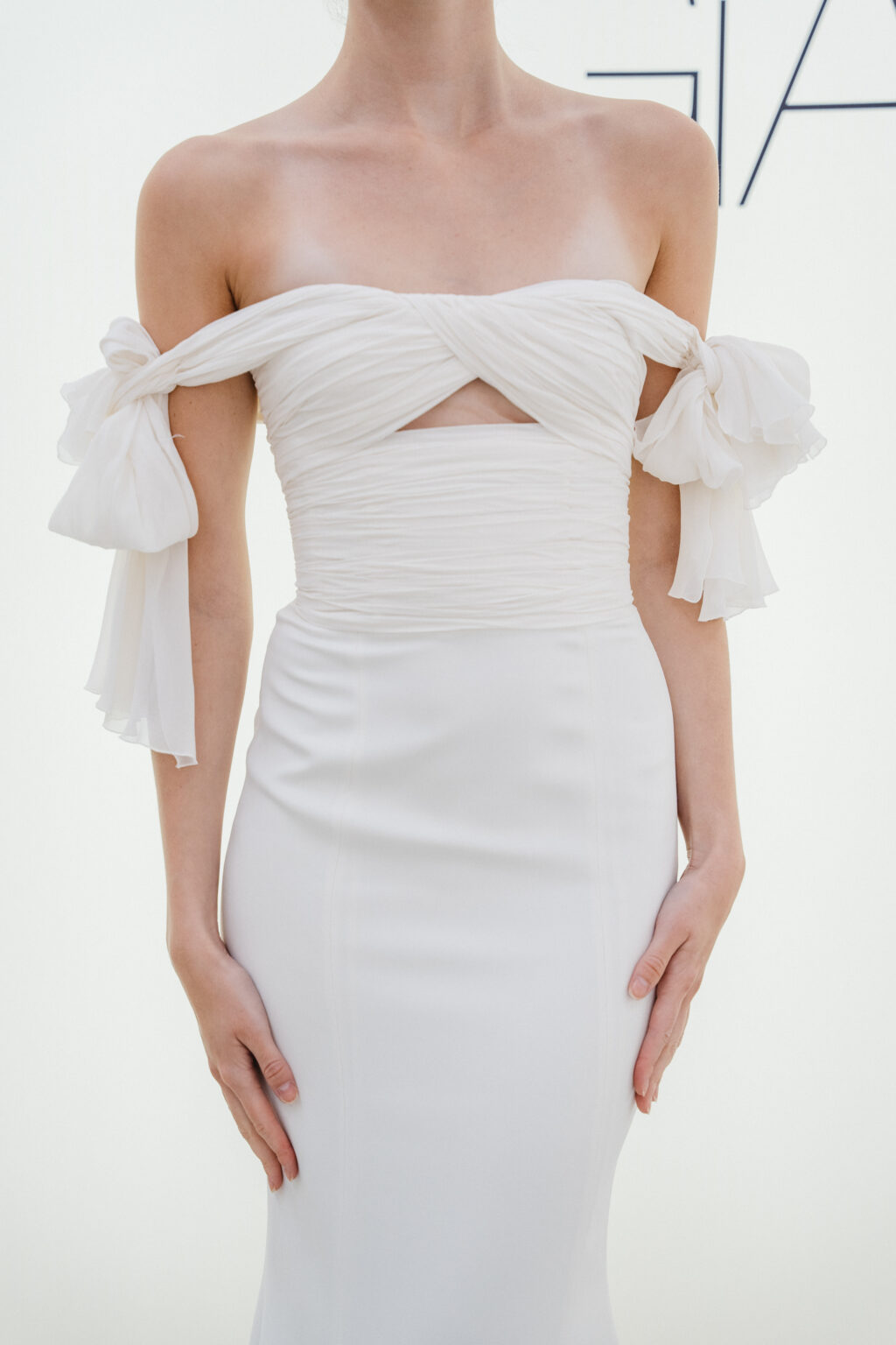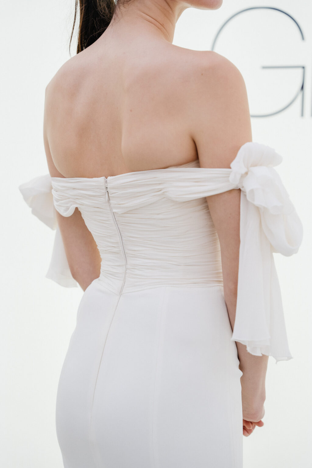 “CAMELIA”はシンプルなデザインの中に、カメリアのような優美さと柔らかな気品を感じる一着。 身体に美しく沿うクレープ地のベースに、ビスチェには触れるのも憚られるほど繊細なシルクシフォンを細やかに寄せてドッキング。異素材を巧みに組み合わせたオートクチュールブランドの技術力が感じられる逸品です。 胸元のカットアウトも、モダンなアクセントに。 シャープでクリーンなシルエットと、リボンがあしらわれたオフショルダーの甘さが、絶妙なバランスで融合し、シンプルでありながら他の装飾を必要としない美しいオーラを放ちます。