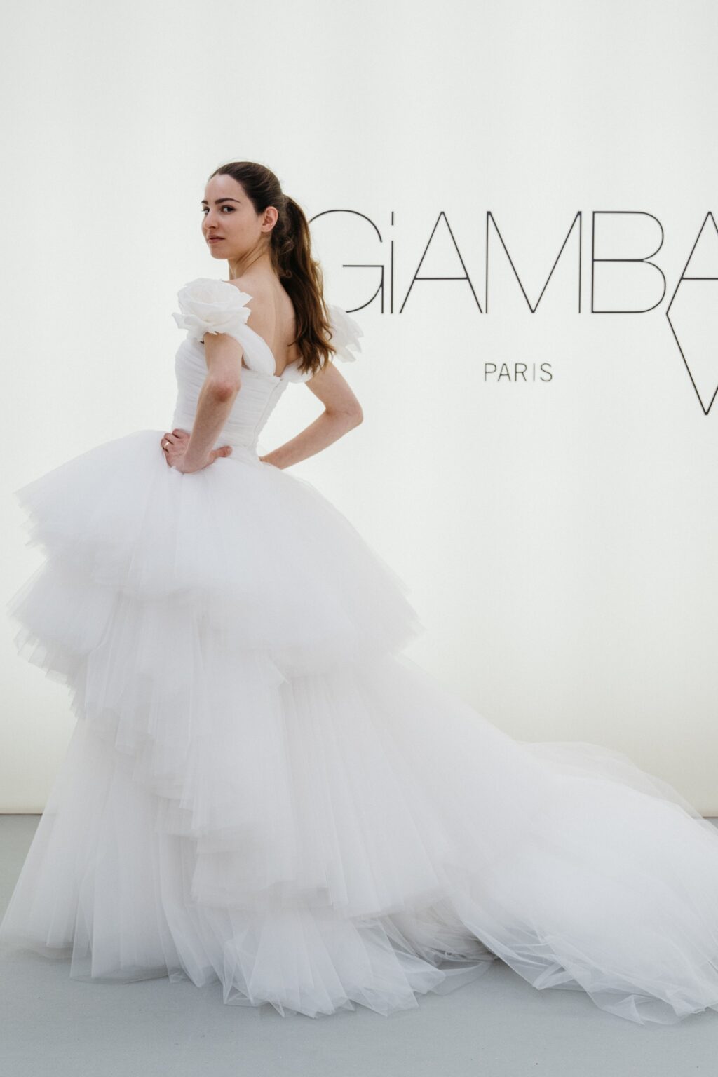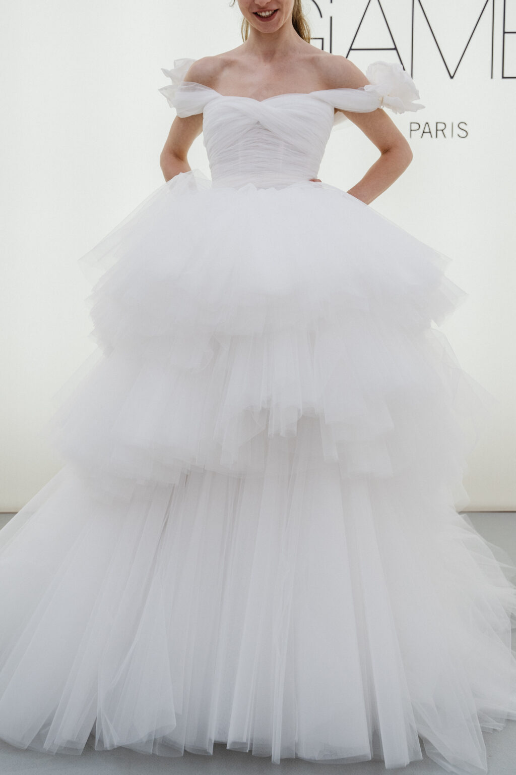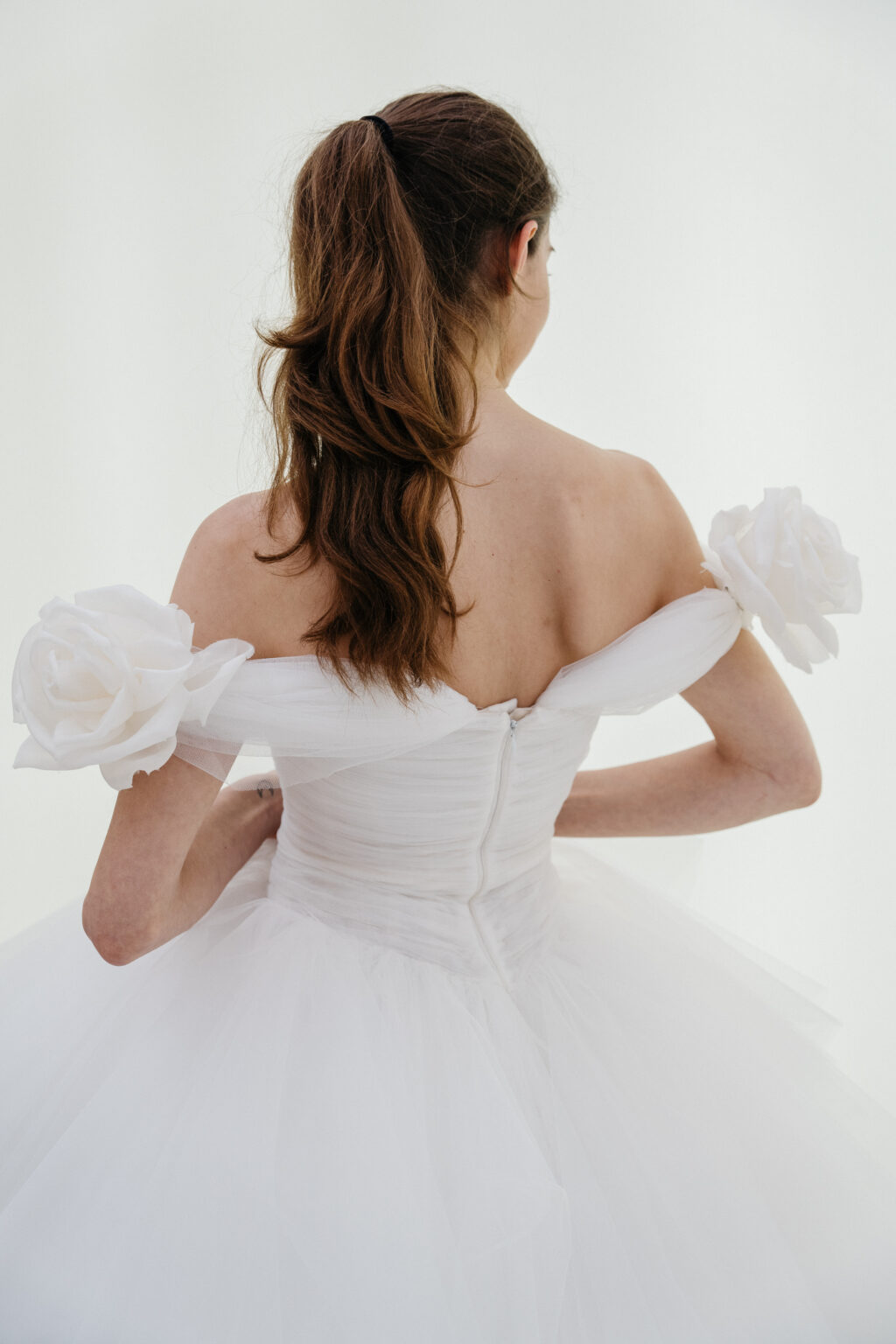 贅沢なファブリック使いでドラマティックなシルエットを描く、これ以上ないほどにロマンティックな一着。 ランダムにカットされたチュールスカートが、花嫁様の歩みに合わせて揺れ動きます。 チュールを幾重にも重ねたティアードスカート、ショルダーに施された立体的なフラワーモチーフとGiambattista Valliらしいドリーミーな世界観を存分に感じることが出来ます。 スウィートなディテールを用いながらも、決して野暮ったくならず、洗練された雰囲気を醸すドラマティックなドレスです。