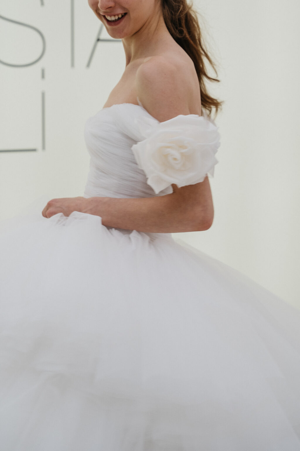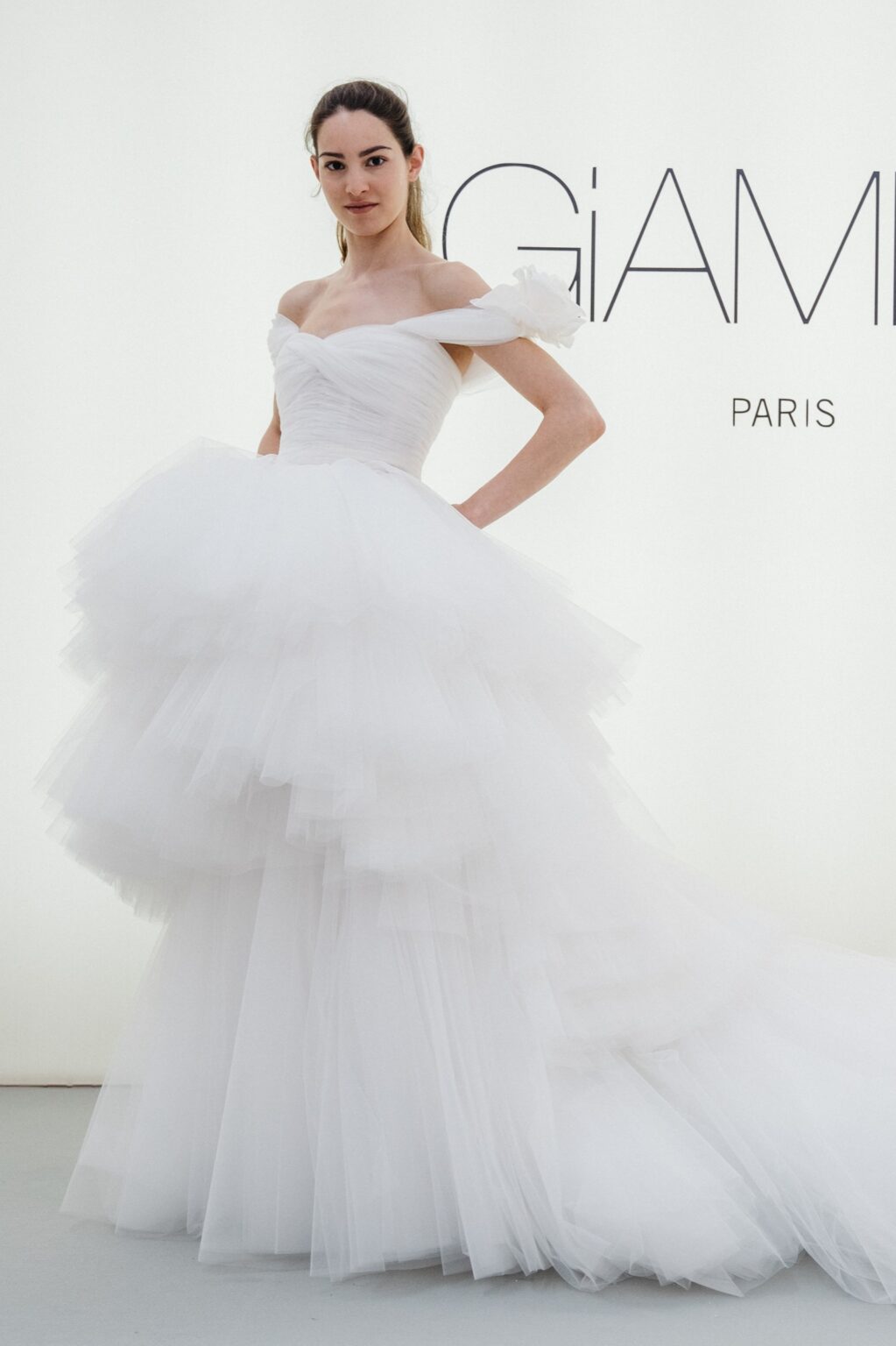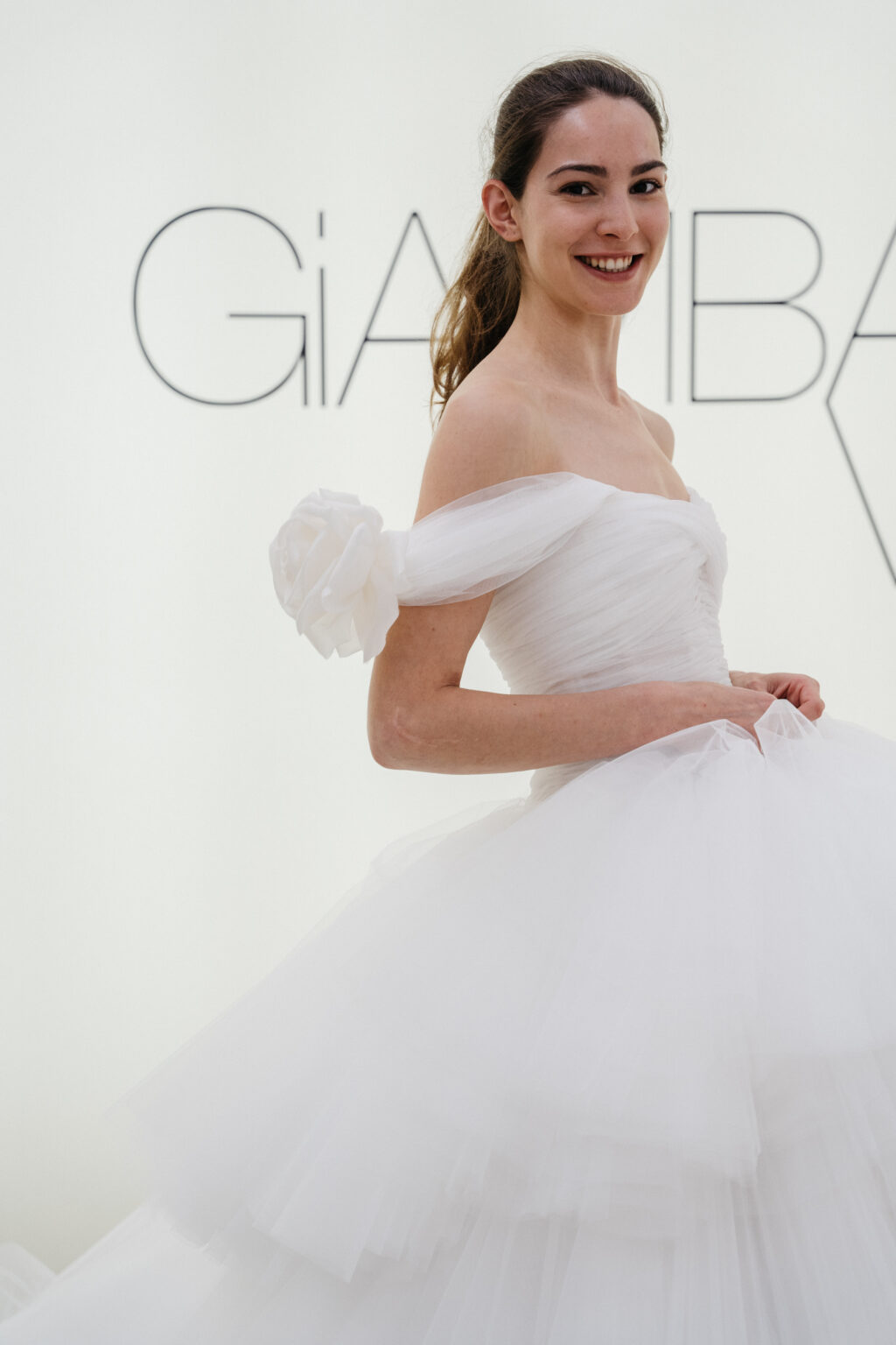 贅沢なファブリック使いでドラマティックなシルエットを描く、これ以上ないほどにロマンティックな一着。 ランダムにカットされたチュールスカートが、花嫁様の歩みに合わせて揺れ動きます。 チュールを幾重にも重ねたティアードスカート、ショルダーに施された立体的なフラワーモチーフとGiambattista Valliらしいドリーミーな世界観を存分に感じることが出来ます。 スウィートなディテールを用いながらも、決して野暮ったくならず、洗練された雰囲気を醸すドラマティックなドレスです。