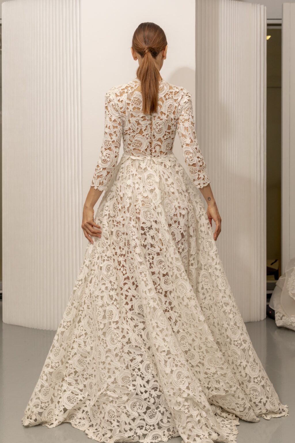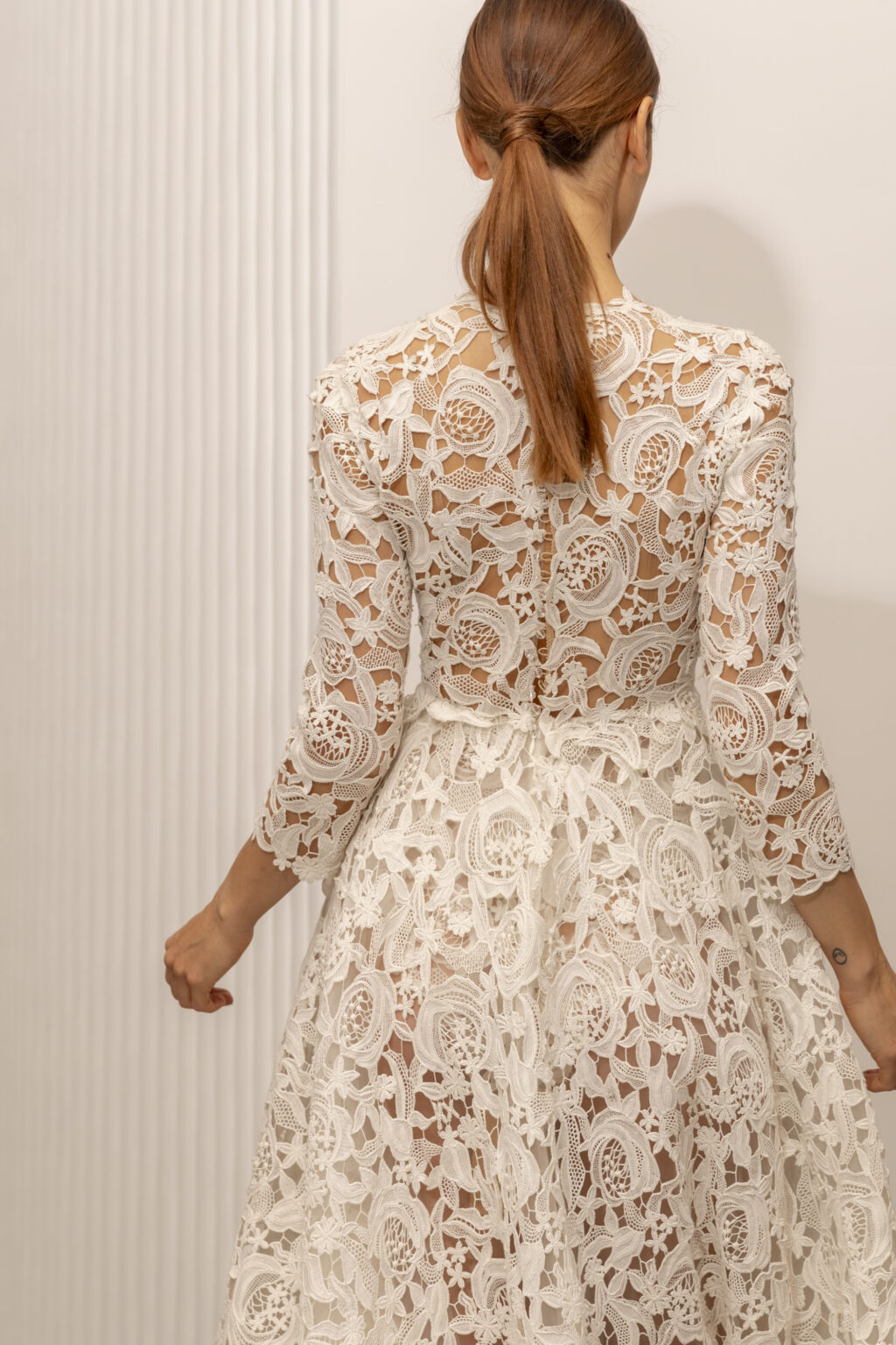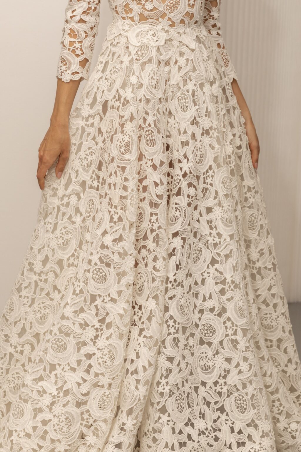 糸を結びながら模様を描く職人技が光る伝統的なマクラメレースをドレス全体に贅沢に使用した1着。 芸術的な美しいレースを纏ったドレスはまさにAndrea Sediciを象徴するデザインです。 つまり気味のネックラインに総レースのAラインシルエットというクラシカルなテイストをプラス。 七分袖、大小のフラワー模様を組み合わせた透け感のあるレース、背中はクリア素材のビーズのボタンをあしらい、程よい抜け感もプラスしています。