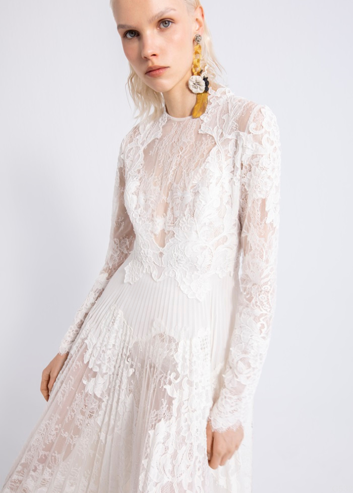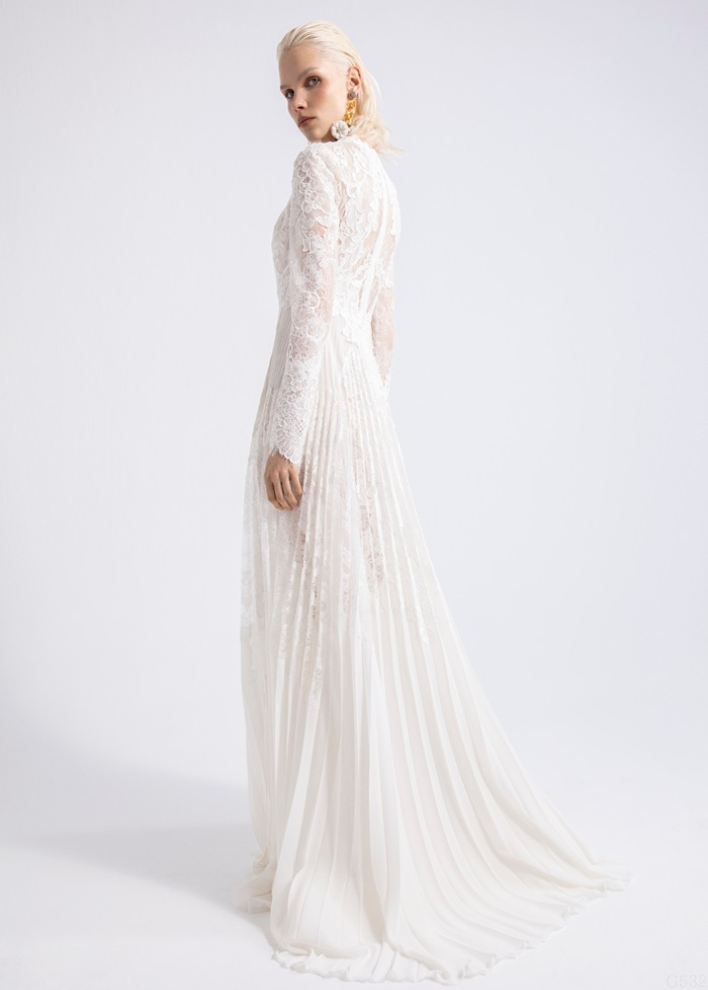 シャツドレスに溶け込むスリップドレスと プリーツスカートを組み合わせたYolan Crisらしいデザイン。 フィット感のある袖、つまり気味のネックラインは すべて繊細なシャンテリーレースで作られています。 より洗練されたボヘミアンスタイルを求める ロマンティックな花嫁様へお届けしたい1着です。