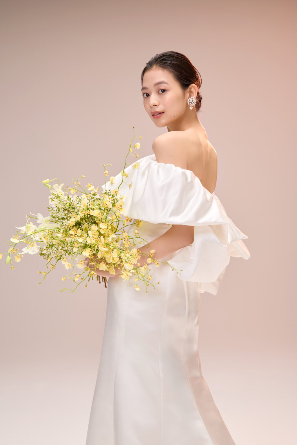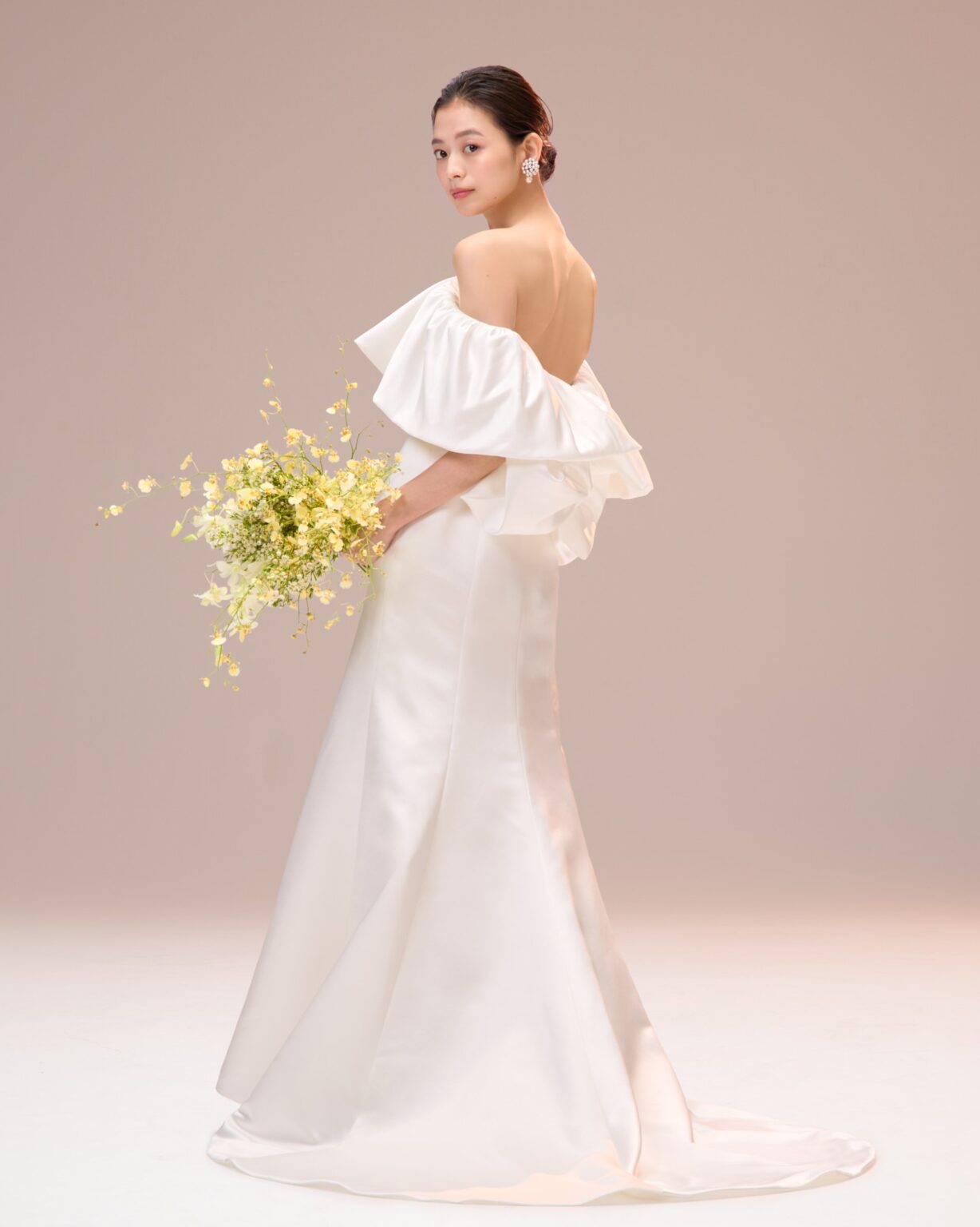19世紀の印象派画家 ジョン・シンガー・サージェントの絵画に登場するひとりの女性「Ena」から着想を得て生まれた、オリジナルドレス “Ena(イーナ)”。 しなやかに流れるサテン生地が、やわらかな光のように花嫁を包み込みます。 立体的なバルーンのロールカラーにこだわって生み出されたこちらのドレスは、シンプルなソフトマーメイドラインの美しい曲線が洗練された華やかさを引き立てます。 レストランウエディングなど、洗練された空間での挙式にぴったりの一着です。