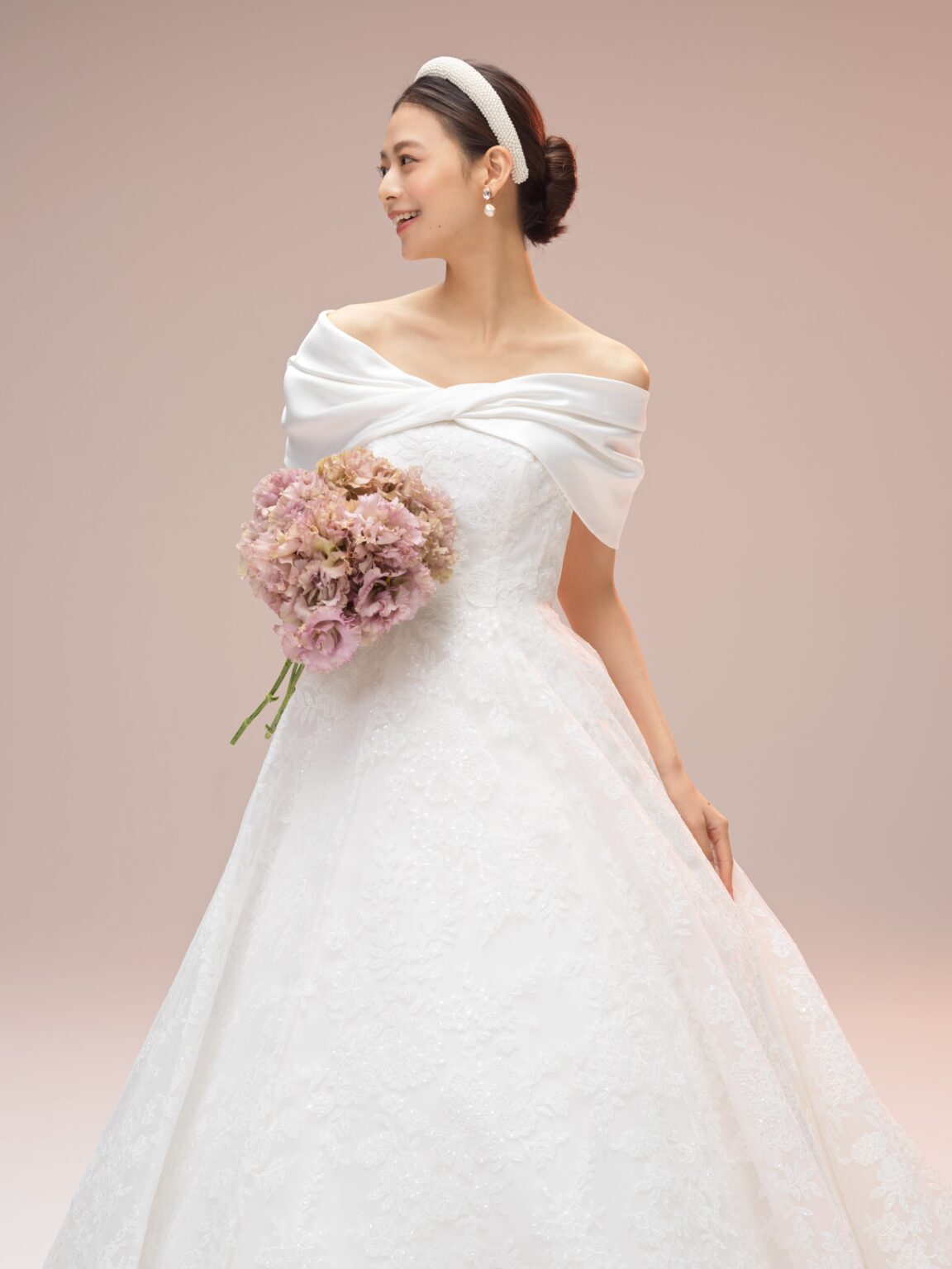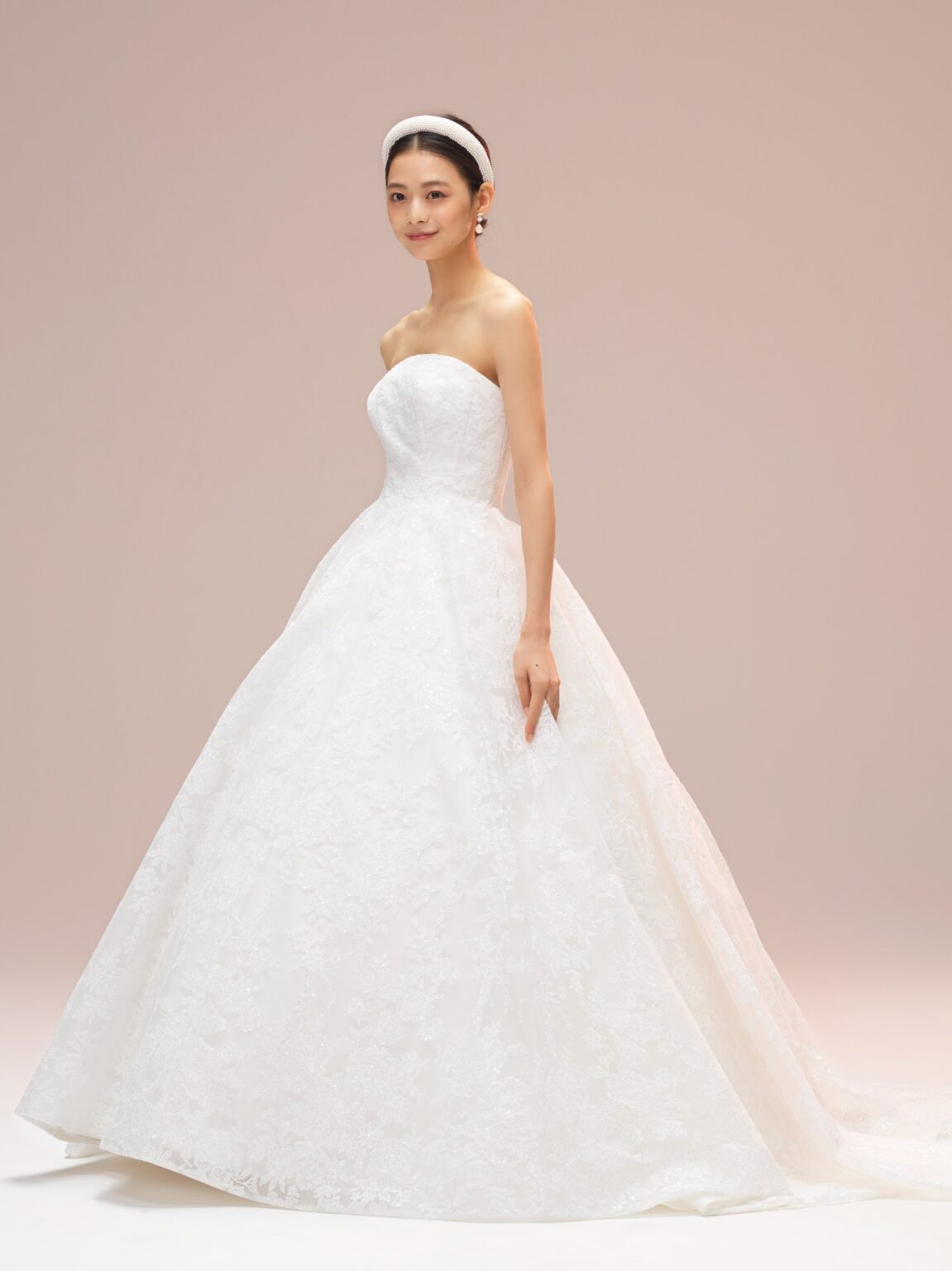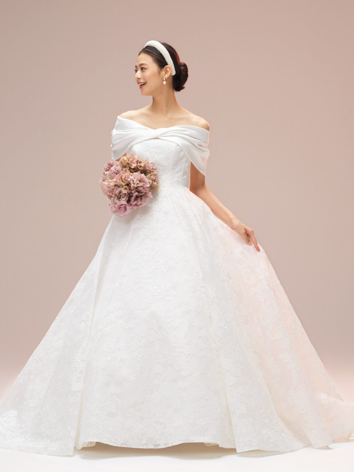 esumのブランドのこだわりのひとつである、日本の花嫁さまがスタイルよく見える、美しいシルエットを叶えたAラインドレスです。 トレーンは裏地と表地の長さに差を出すことで、表面のレースが引き立ち、透明感ある雰囲気に仕上げています。 ミリ単位で何度も修正を重ね、自然な美しいドレープにこだわったケープが、花嫁さまを上品で洗練された印象へと導きます。 ホテルやゲストハウスなど会場を問わず多くの花嫁さまへ届けたい、esumのこだわりが詰まった1着です。