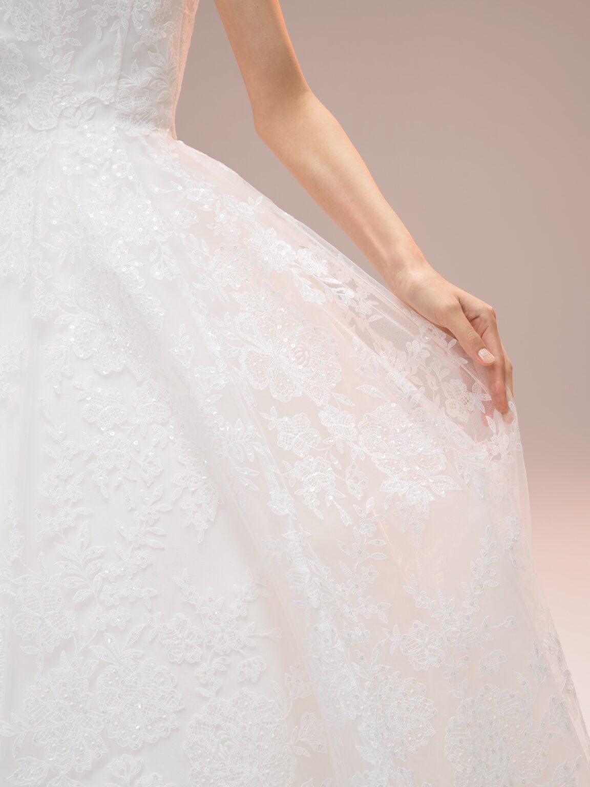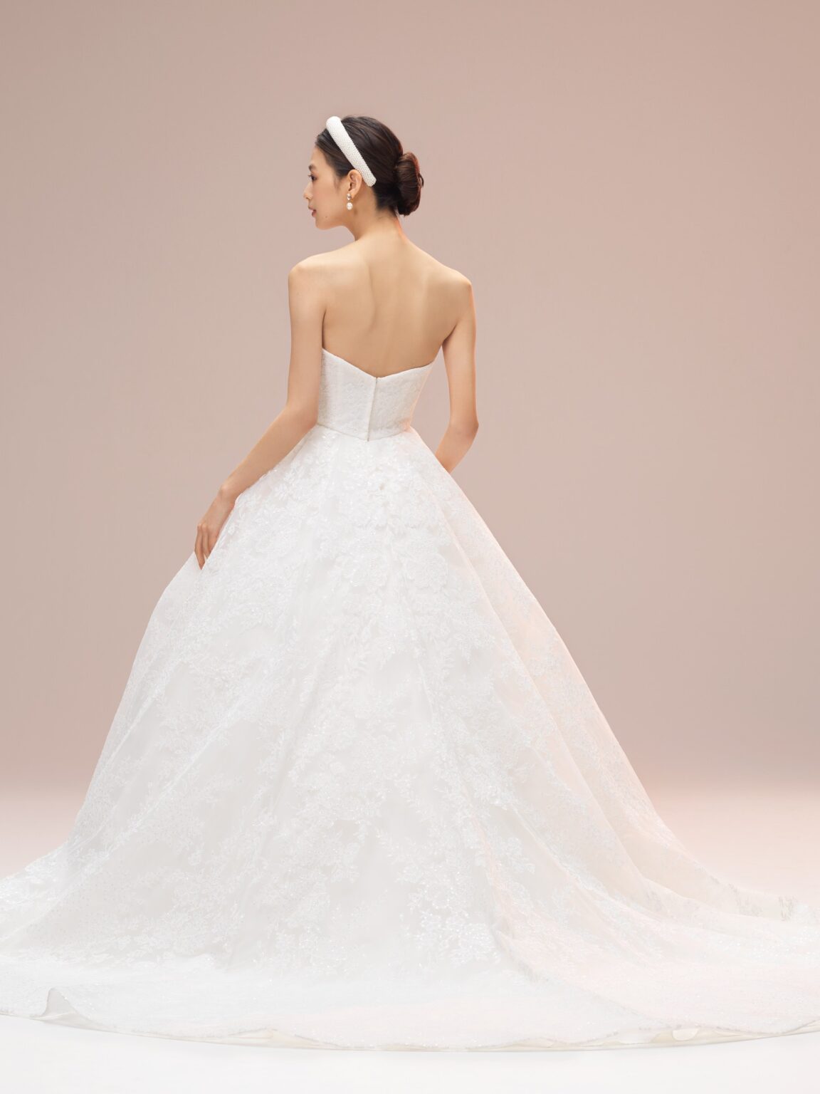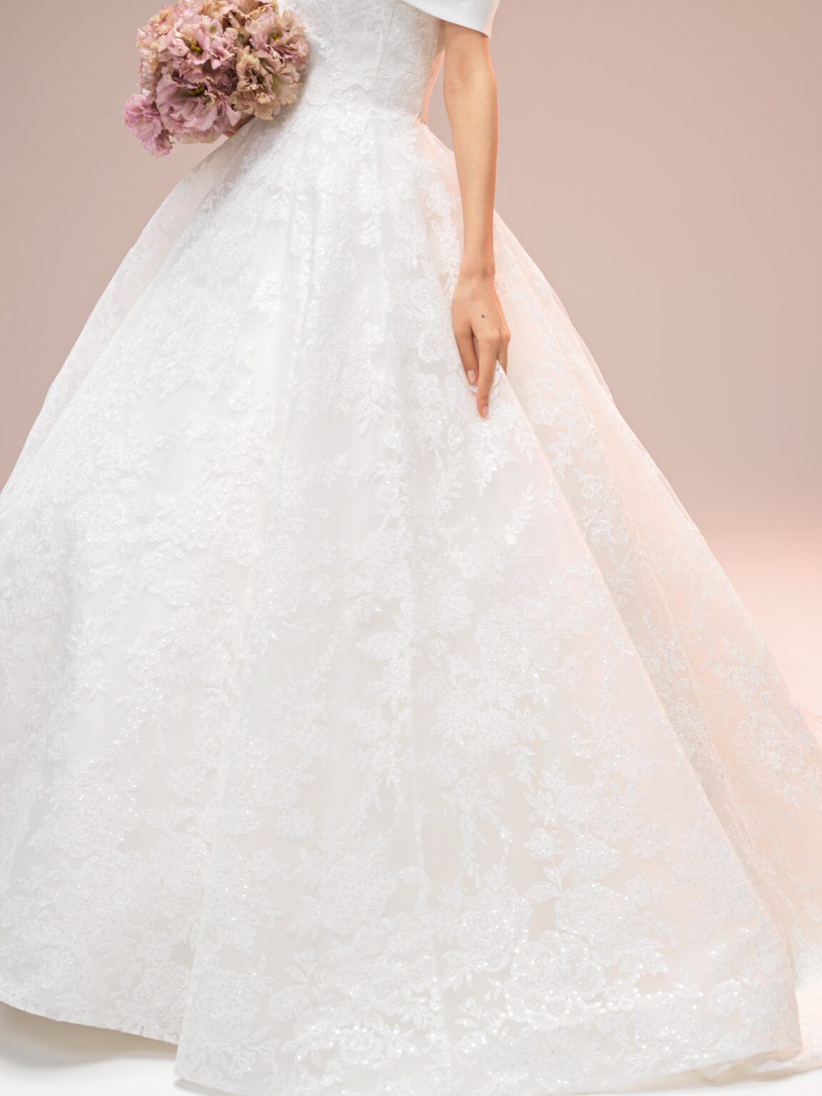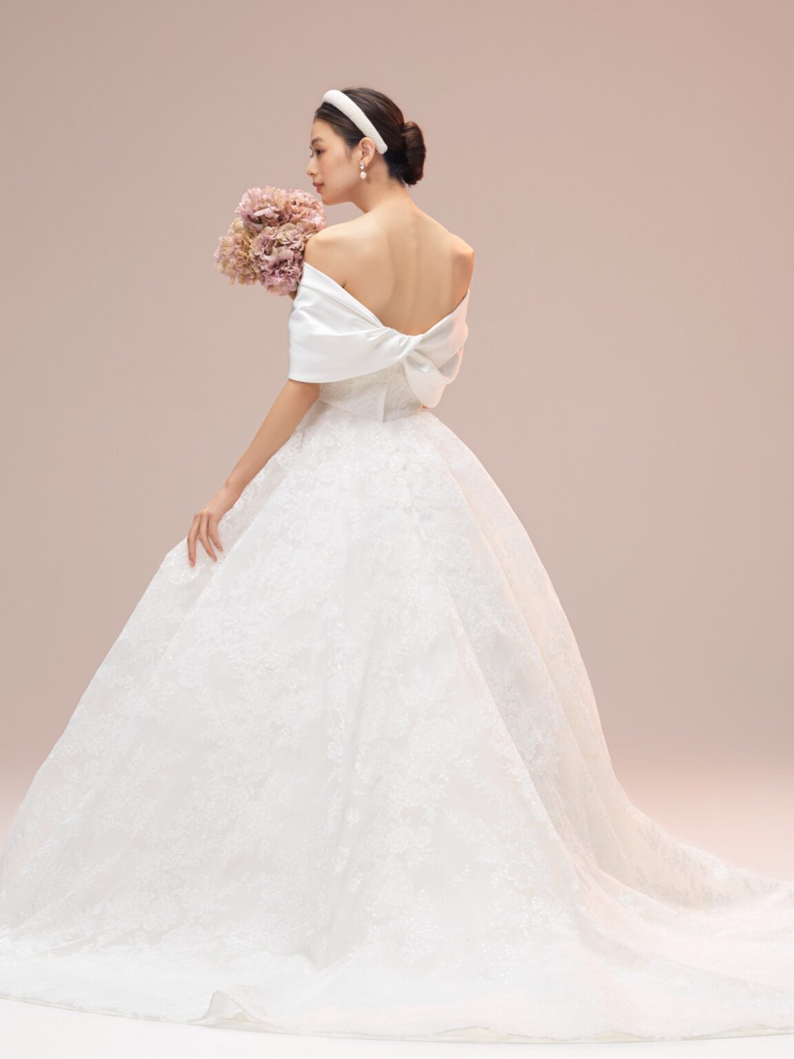 esumのブランドのこだわりのひとつである、日本の花嫁さまがスタイルよく見える、美しいシルエットを叶えたAラインドレスです。 トレーンは裏地と表地の長さに差を出すことで、表面のレースが引き立ち、透明感ある雰囲気に仕上げています。 ミリ単位で何度も修正を重ね、自然な美しいドレープにこだわったケープが、花嫁さまを上品で洗練された印象へと導きます。 ホテルやゲストハウスなど会場を問わず多くの花嫁さまへ届けたい、esumのこだわりが詰まった1着です。
