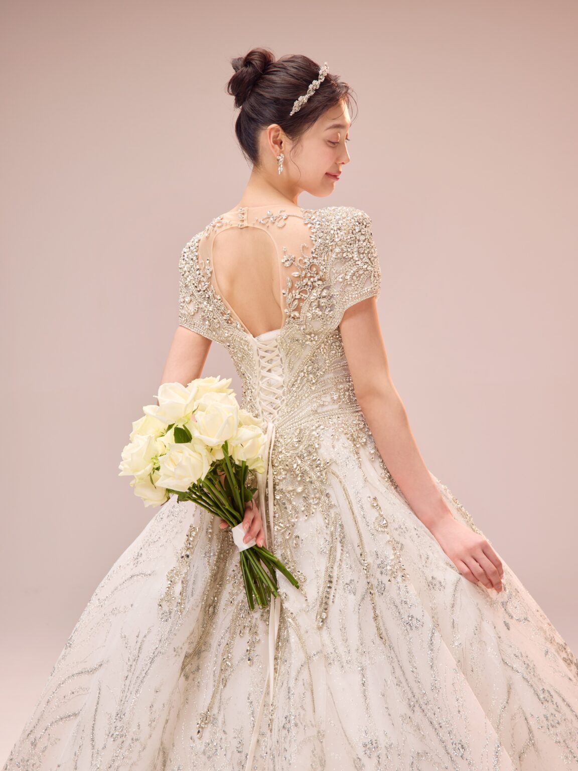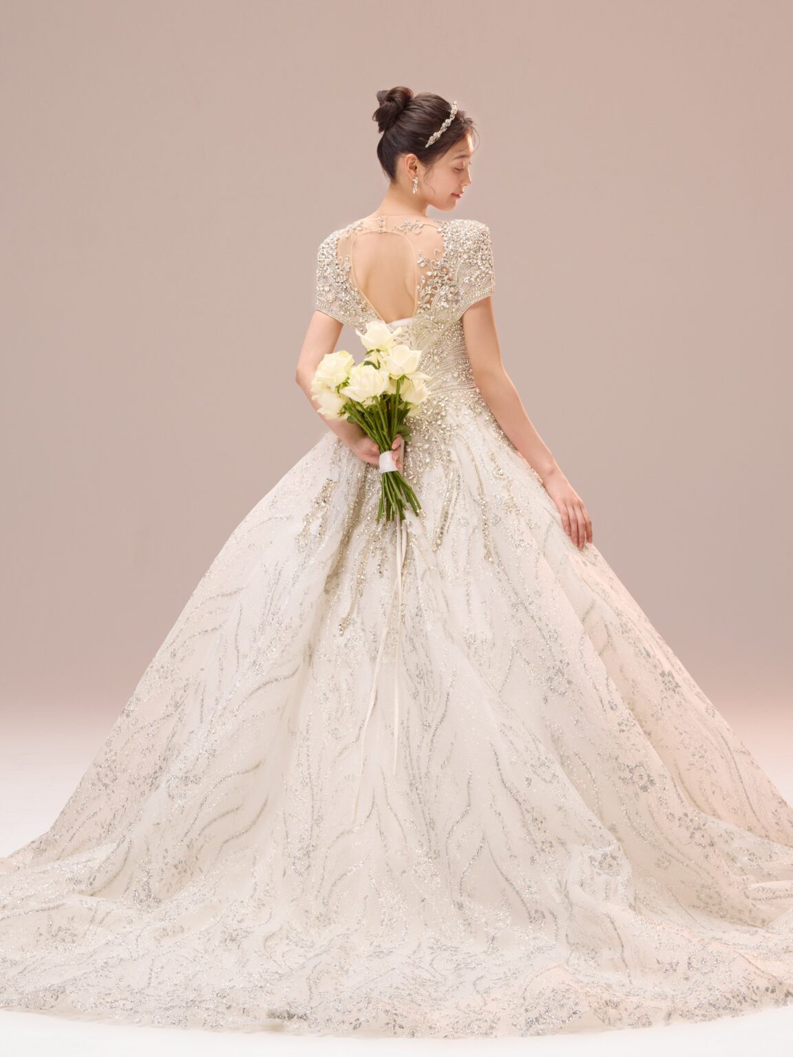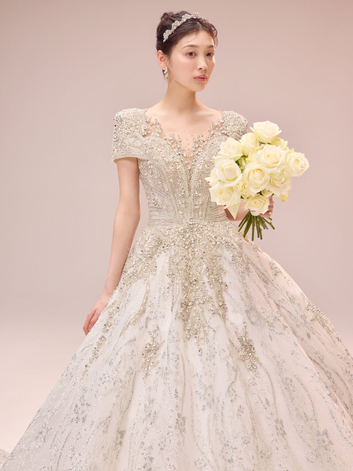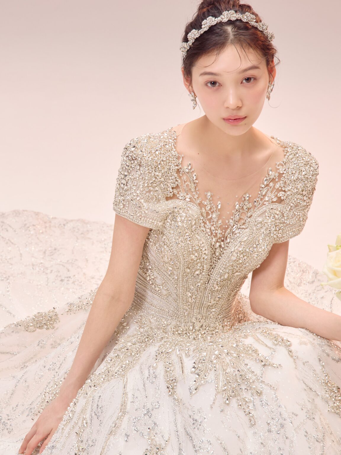 繊細なビーディングに加え大ぶりのストーンをトップスに贅沢にデザインすることで大小さまざまなストーンが光を放ち、顔まわりに自然な反射が生まれ、トーンアップしてお顔が明るく見えるのも嬉しいポイントです。 程よいボリュームのショルダーが凛とした品の良さを感じさせ、全体的に中東のプリンセスを思わせるようなラグジュアリーな佇まい。 胸元のパターンから連なるように見える袖口のラインや、深めのVネック周りに繊細に施されたビーディングなど、大胆さと緻密さのバランスが保たれています。 ウエストから腰へと流れるラインは特に美しく、トレンドのコルセットディテールが内側から自然にスタイルアップを叶えます。 Lucetteという、「小さな光が集まった輝き」という意味を持つ名のとおり、小さな光が重なり合い、強く、そして気品ある存在感を添える一着です。