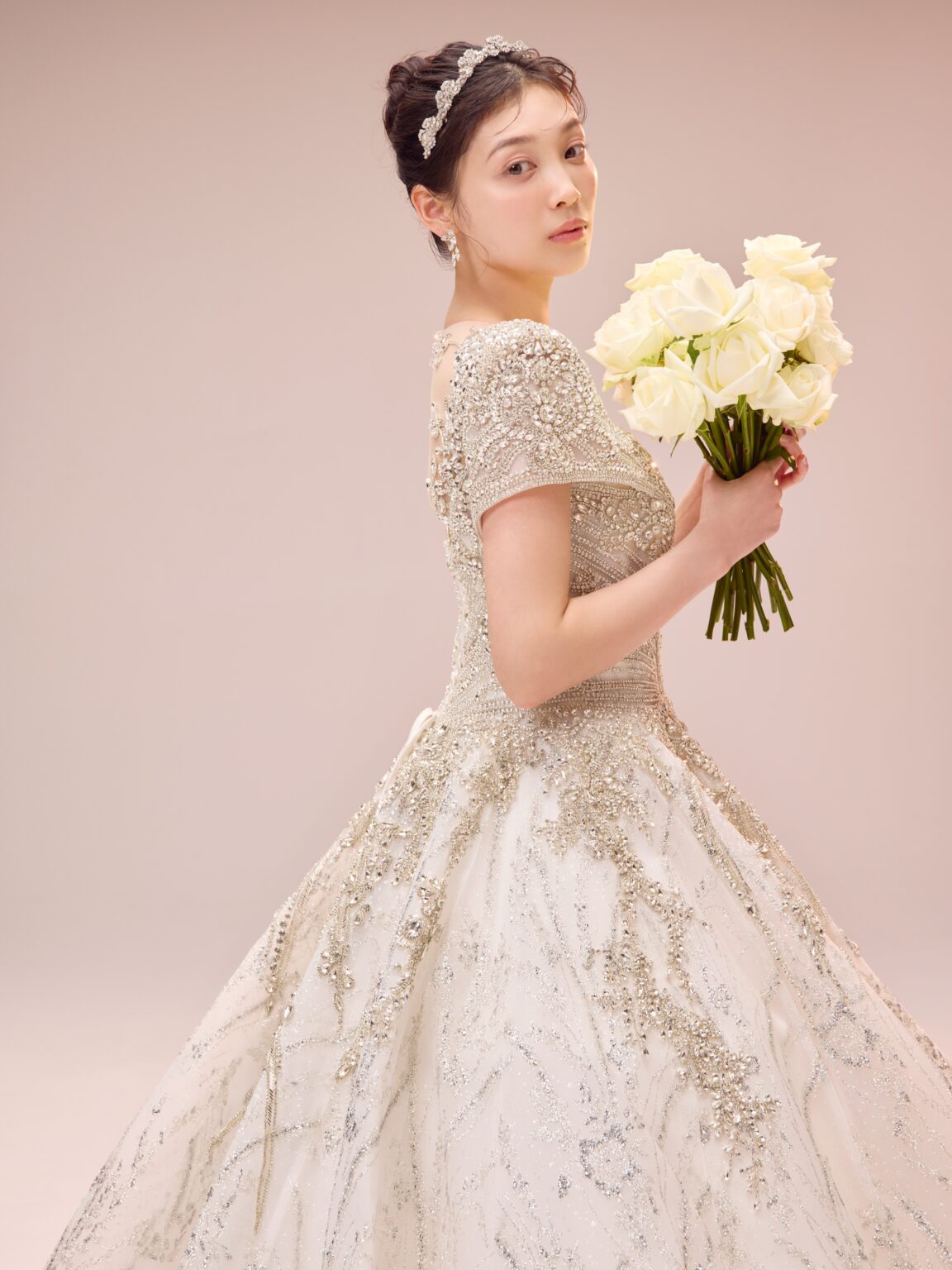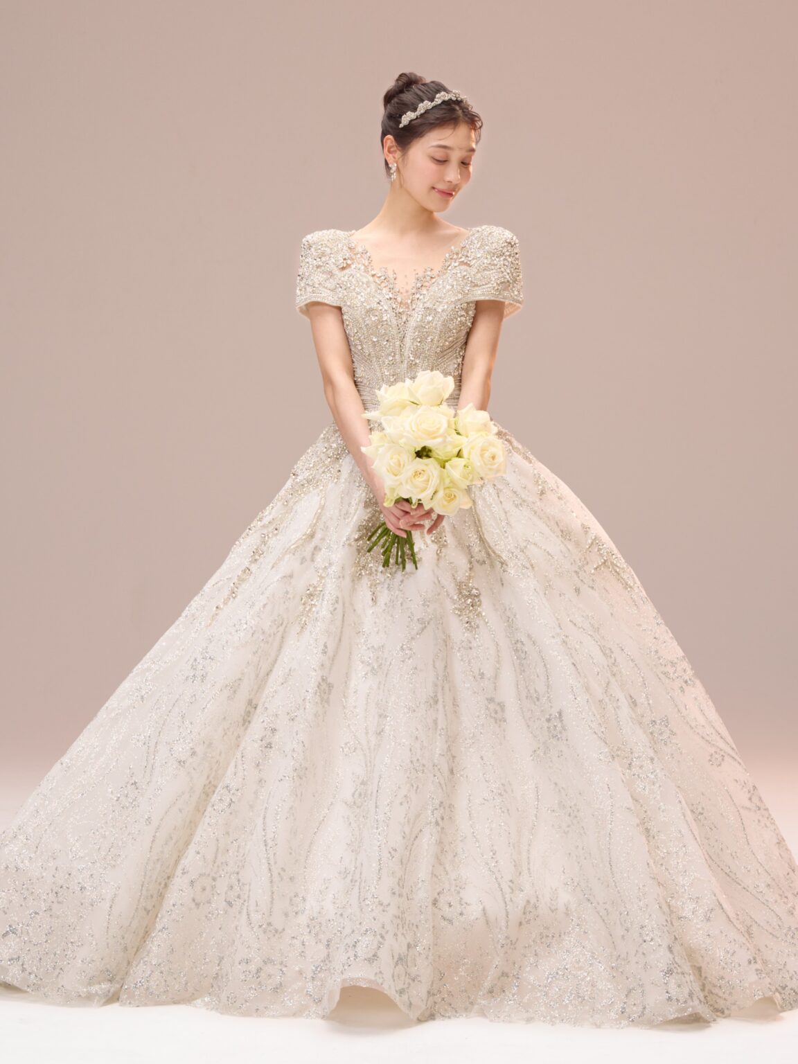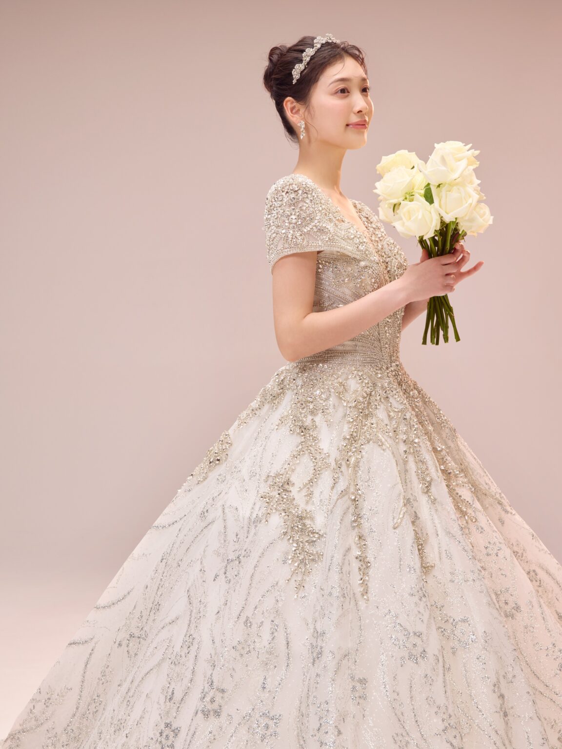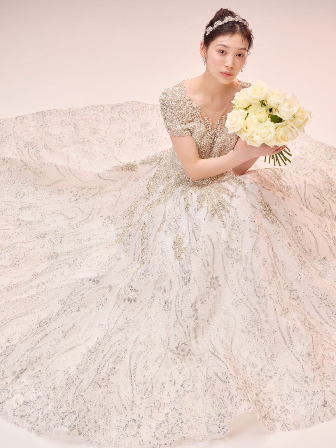 繊細なビーディングに加え大ぶりのストーンをトップスに贅沢にデザインすることで大小さまざまなストーンが光を放ち、顔まわりに自然な反射が生まれ、トーンアップしてお顔が明るく見えるのも嬉しいポイントです。 程よいボリュームのショルダーが凛とした品の良さを感じさせ、全体的に中東のプリンセスを思わせるようなラグジュアリーな佇まい。 胸元のパターンから連なるように見える袖口のラインや、深めのVネック周りに繊細に施されたビーディングなど、大胆さと緻密さのバランスが保たれています。 ウエストから腰へと流れるラインは特に美しく、トレンドのコルセットディテールが内側から自然にスタイルアップを叶えます。 Lucetteという、「小さな光が集まった輝き」という意味を持つ名のとおり、小さな光が重なり合い、強く、そして気品ある存在感を添える一着です。