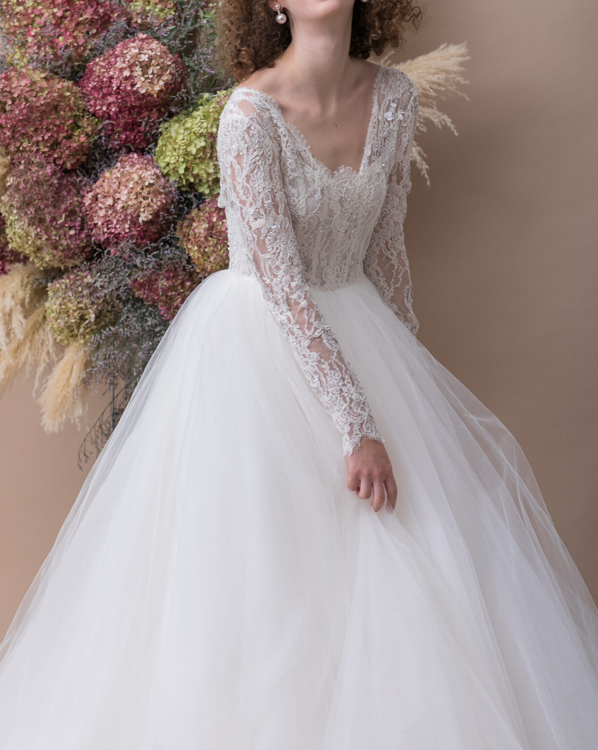 コードレースを使用した、上品なロングスリーブが クラシックなウエディングドレス。 スカートにはチュールをたっぷりと使用し ふんわりと広がるシルエットがドラマティックな一着です。