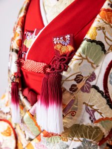 桃山時代の図柄を元に、能装束に使われる唐織で ふっくらと製織した最高級の打掛です。 絹の光沢とボリューム感が格調高く、重厚な多色使いの配色が 気品あふれる印象に。 松や丸紋様、不滅不死の象徴とされる蝶文様など 幸せに満ちた一枚です。 着物の重厚で多彩な柄行を引き立たせるよう、 掛下や小物は茜色でまとめて全体を引き締めています。