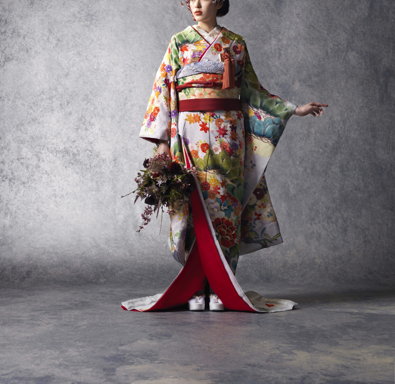 さや花の丸地紋を淡い藤色に染め上げ、松や桜、もみじ、牡丹、菊など四季折々の草花を友禅で表現した引き振袖です。 花のふちどりに刺繍した金駒がより一層豪華さを醸し出しています。