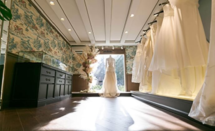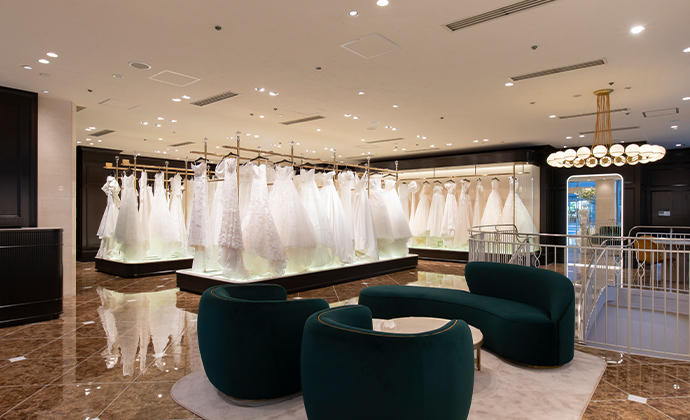 2025年7月にオープンしたばかりのJUNO名古屋店。柔らかな陽光に包まれる店内は、優美な螺旋階段を中心にシックで特別感のある空間。ELIE SAABや、Nicole+Feliciaなどラグジュアリーなドレスのラインナップでお迎えします。